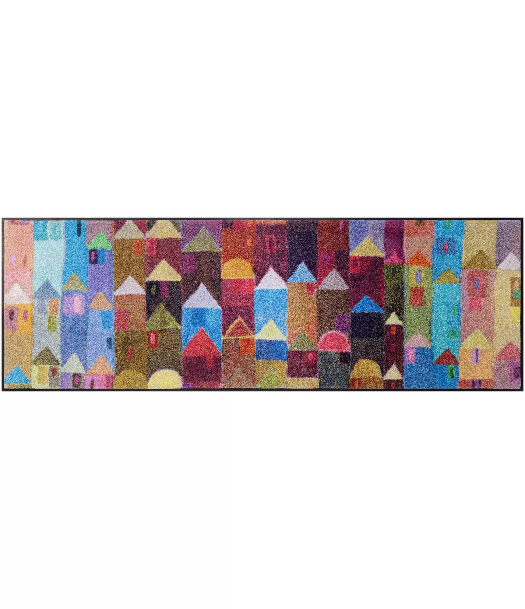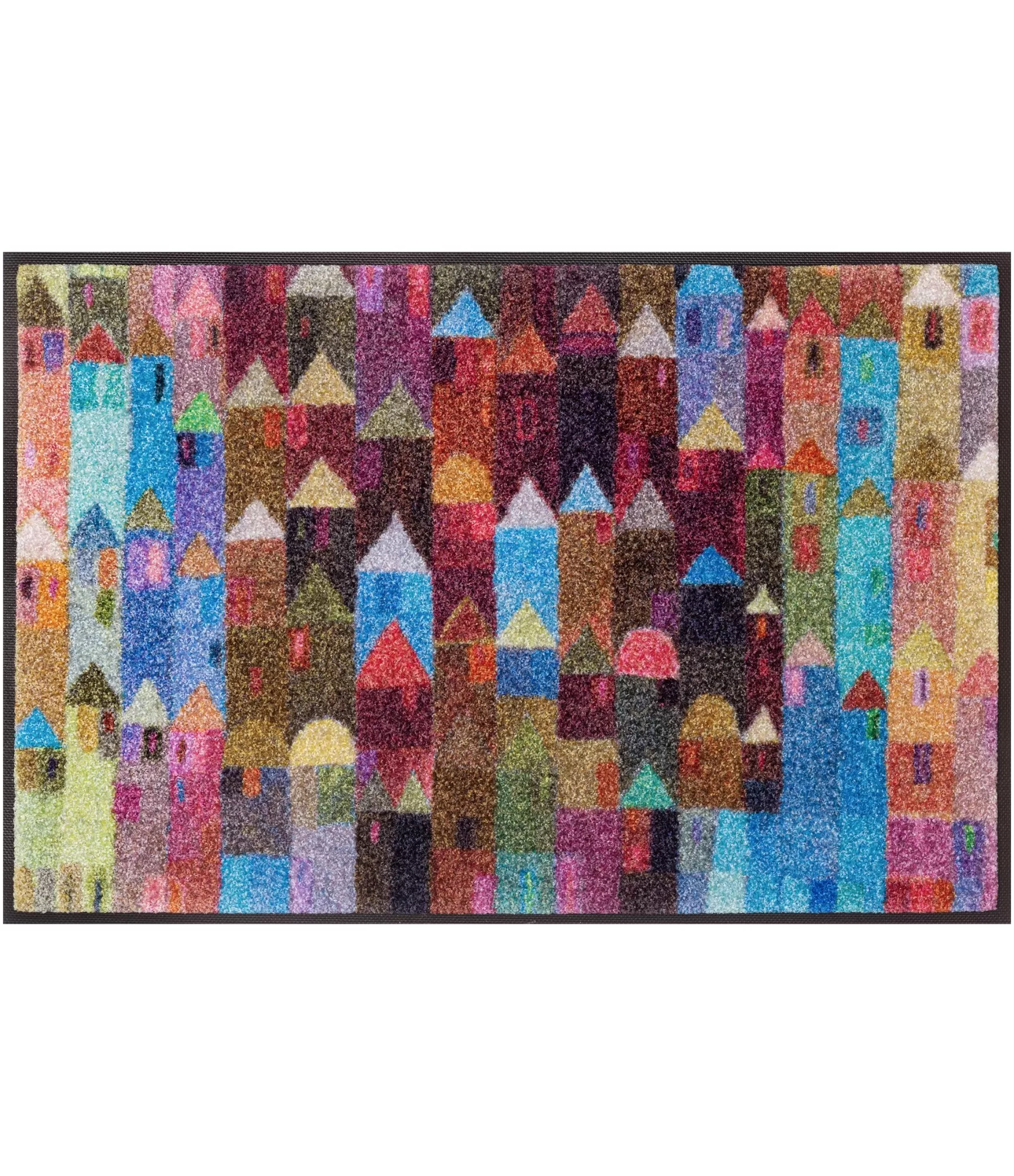 Mazgājams durvju paklājs "Manhattan" izceļas ar krāsainu un dinamisku dizainu, kas atgādina stilizētu pilsētas panorāmu. Šis risinājums raksturojas ar bagātīgu krāsu paleti – šeit saplūst spilgti zilie, sarkanie, dzeltenie, zaļie un citi toņi, kas rada dzīvīgu, enerģisku un mūsdienīgu iespaidu. Pateicoties šai izteiksmībai, izstrādājums kļūst ne tikai par praktisku, bet arī dekoratīvu interjera elementu, kas var pilnībā mainīt ieejas zonas noskaņu.