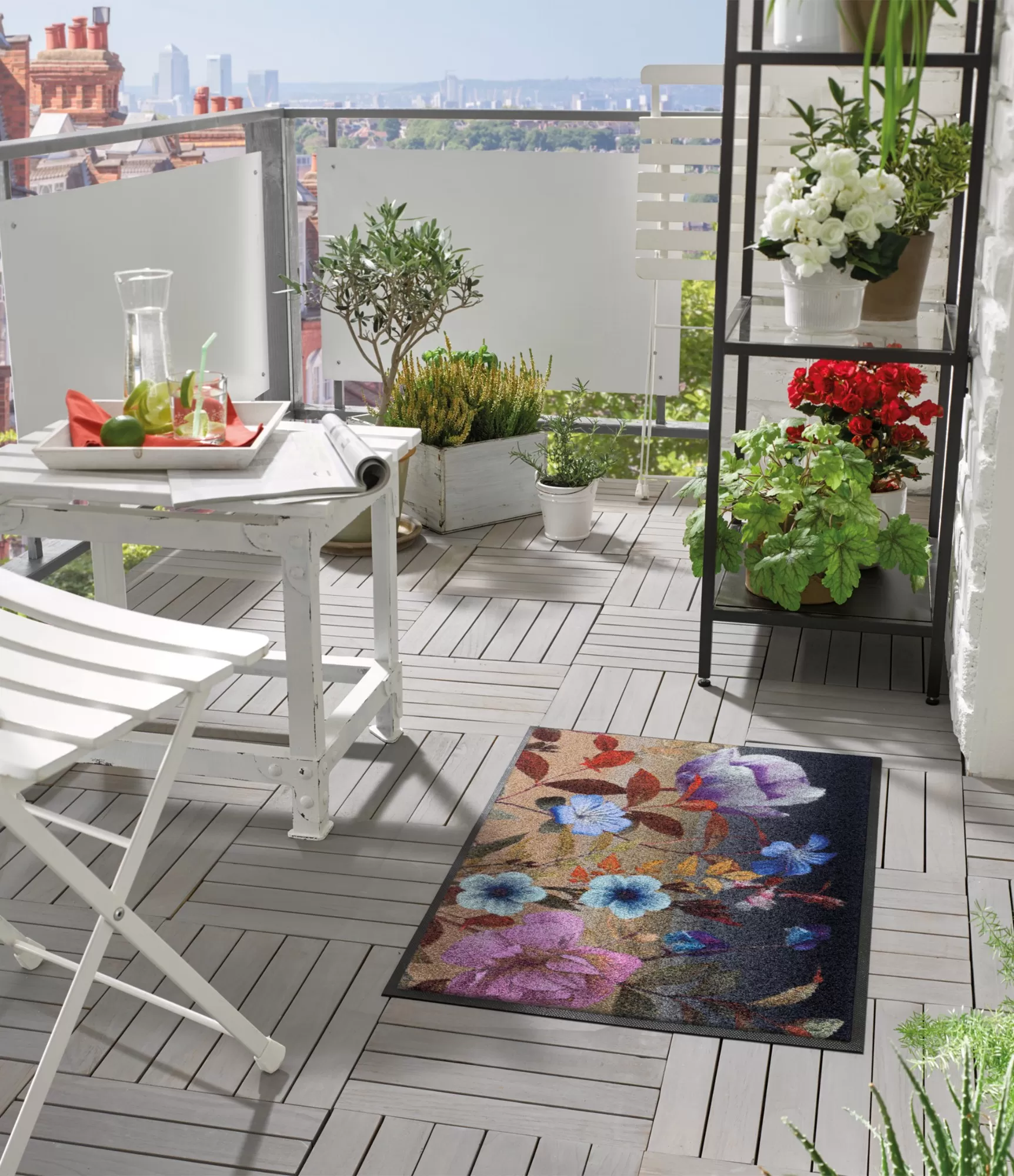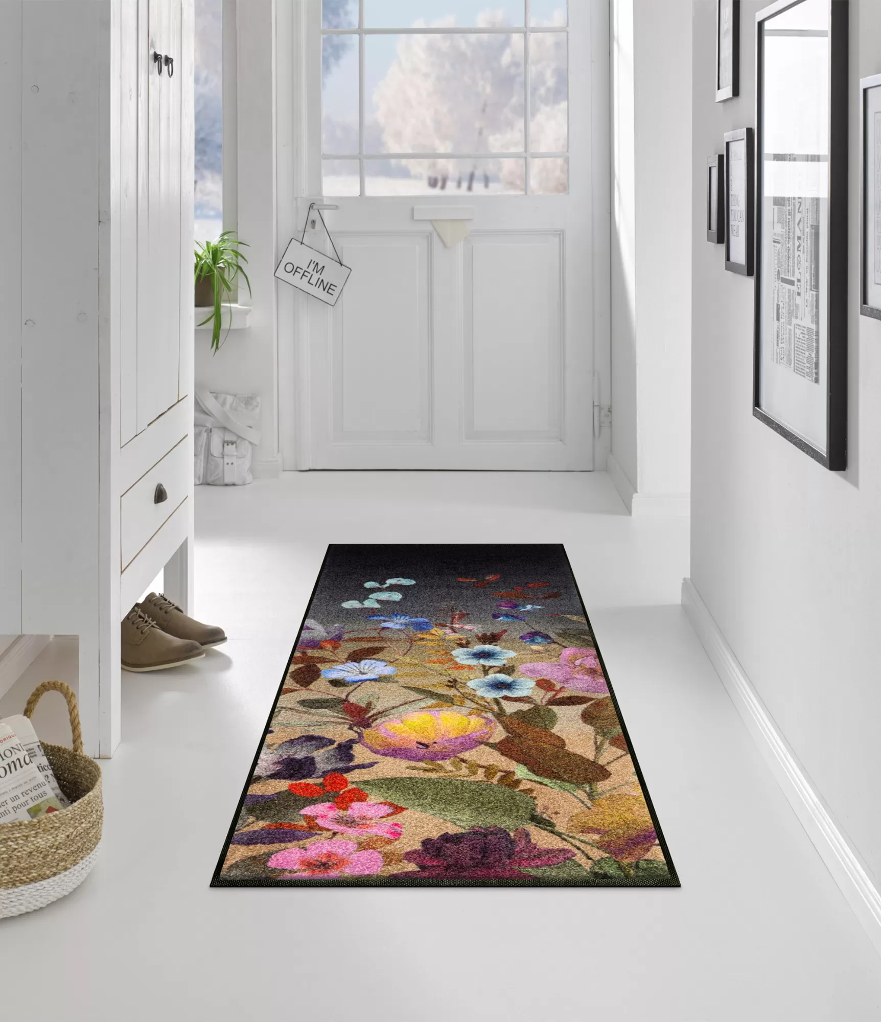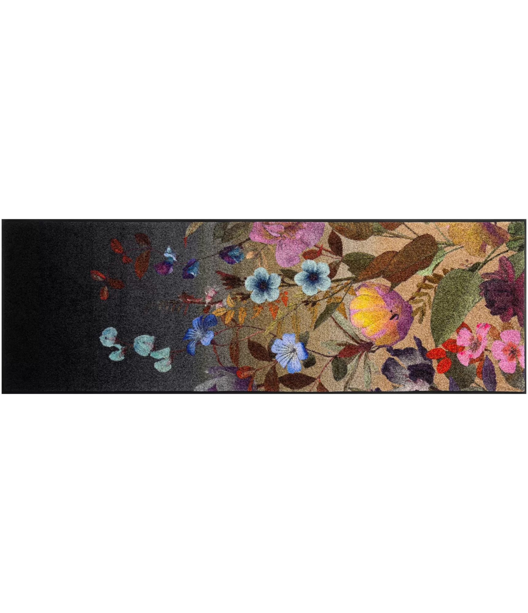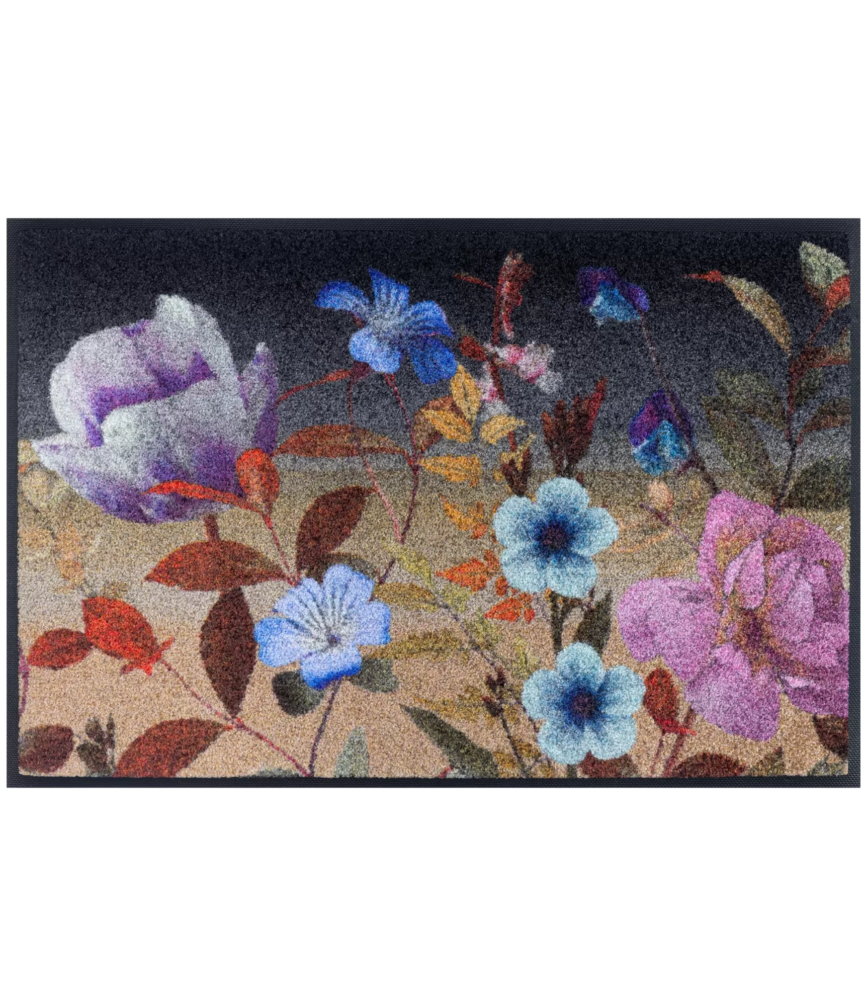 Moderns durvju paklājs "Midnight Blooms" izceļas ar izteiksmīgu ziedu dizainu, kas smalki atklājas uz tumšāka fona. Šis risinājums rada elegantu un nedaudz noslēpumainu noskaņu, bet spilgtāki zilie, violetie, rozīgie un siltie zemes toņi piešķir dzīvīgumu visai kompozīcijai. Šāda kombinācija ļauj šo dizainu viegli pielāgot gan modernā, gan klasiskā interjerā, saglabājot estētiku un mājīgumu.