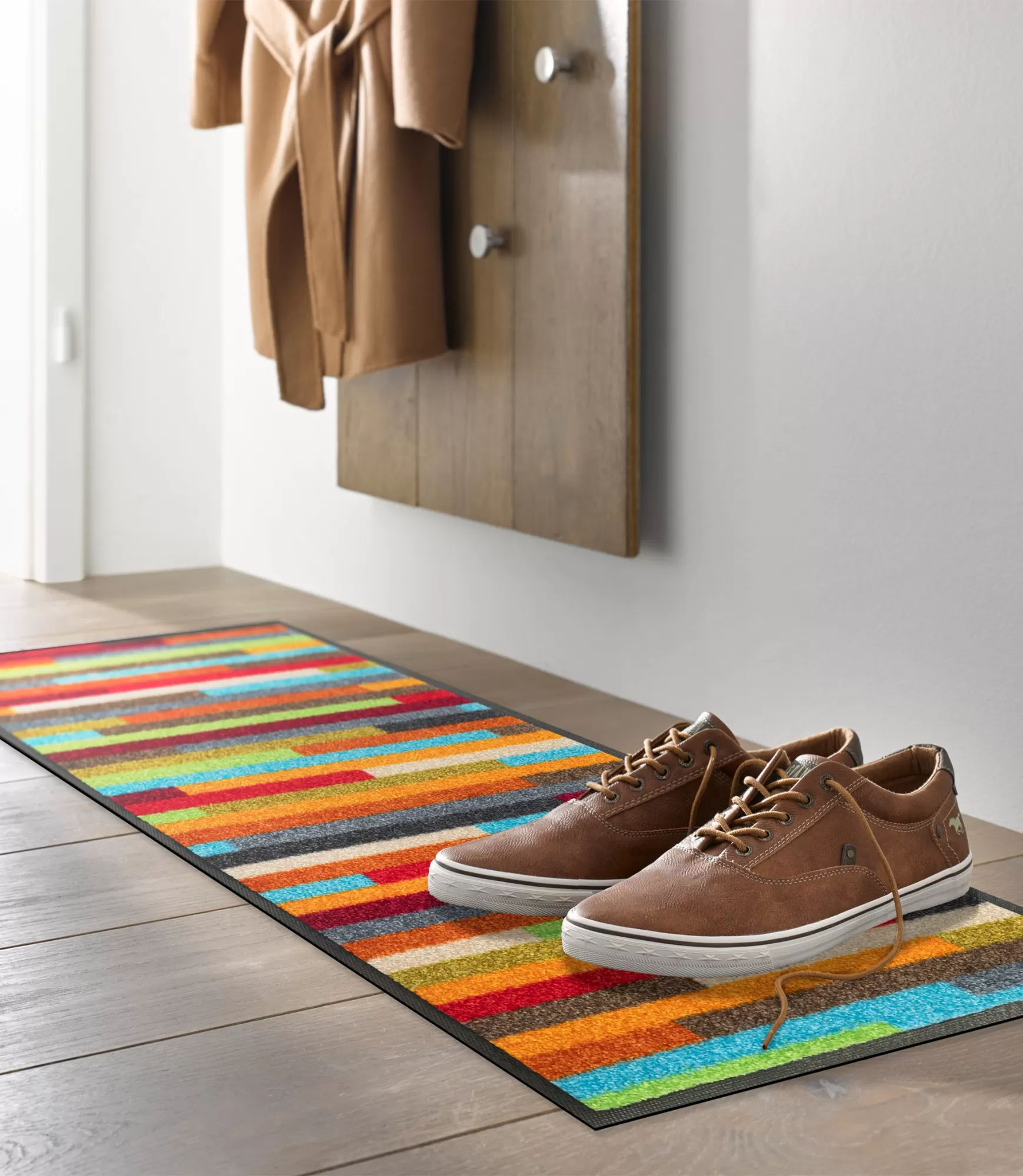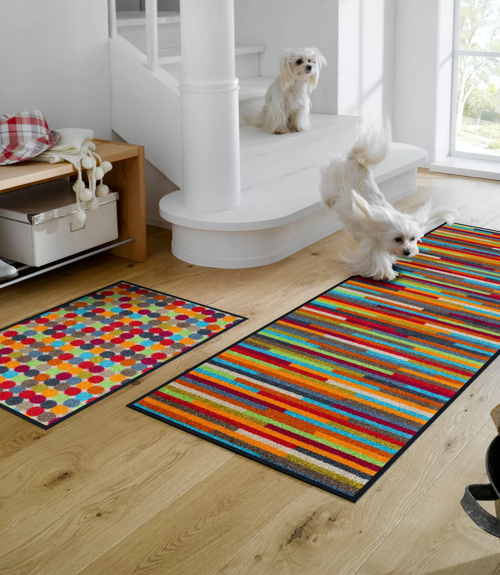 Durvju paklājs „Mikado Stripes“ izceļas ar enerģisku, krāsainu dizainu, kas atgādina mūsdienu mākslu vai grafisku pilsētas ritmu. Vertikālas, dažāda platuma un garuma krāsu joslas veido dzīvīgu, nepārtraukti mainīgu kompozīciju, kas piesaista skatienu un piešķir interjeram raksturu. Spilgti sarkanie, oranžie, zilie, zaļie un neitrālie toņi saplūst harmoniskā kopumā, ienesot mājās dzīvīgumu un pozitīvu noskaņu.