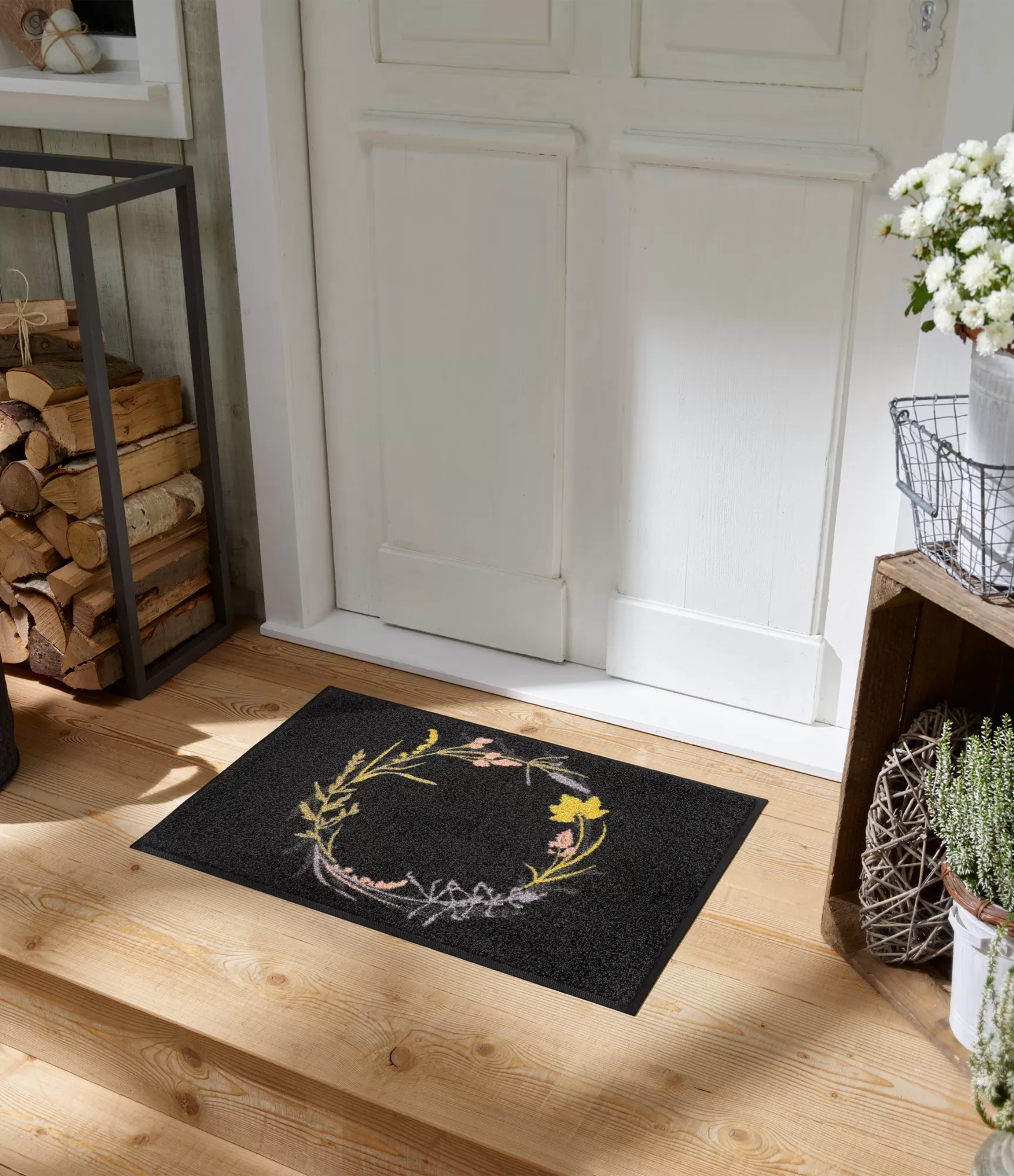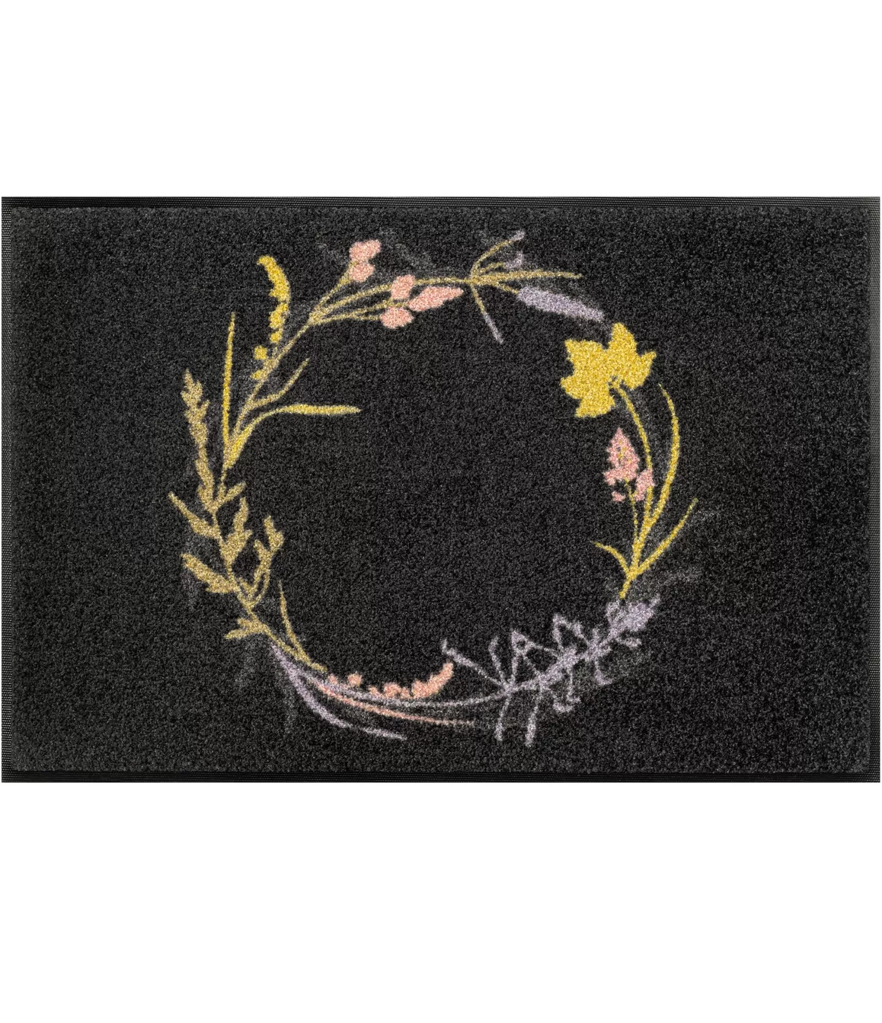 Durvju paklājs „Nature Hoop“ izceļas ar elegantu, vieglu un harmoniski sabalansētu dizainu. Uz tumša fona izkārtots smalks augu vainags veido dabas iedvesmotu kompozīciju, kas izskatās estētiski un nepārslogo telpu. Sīkas zariņu, lapu un ziedu detaļas piešķir vieglumu, bet siltie dzeltenīgie un pasteļtoņi ienes mājīgumu un gaismas sajūtu.