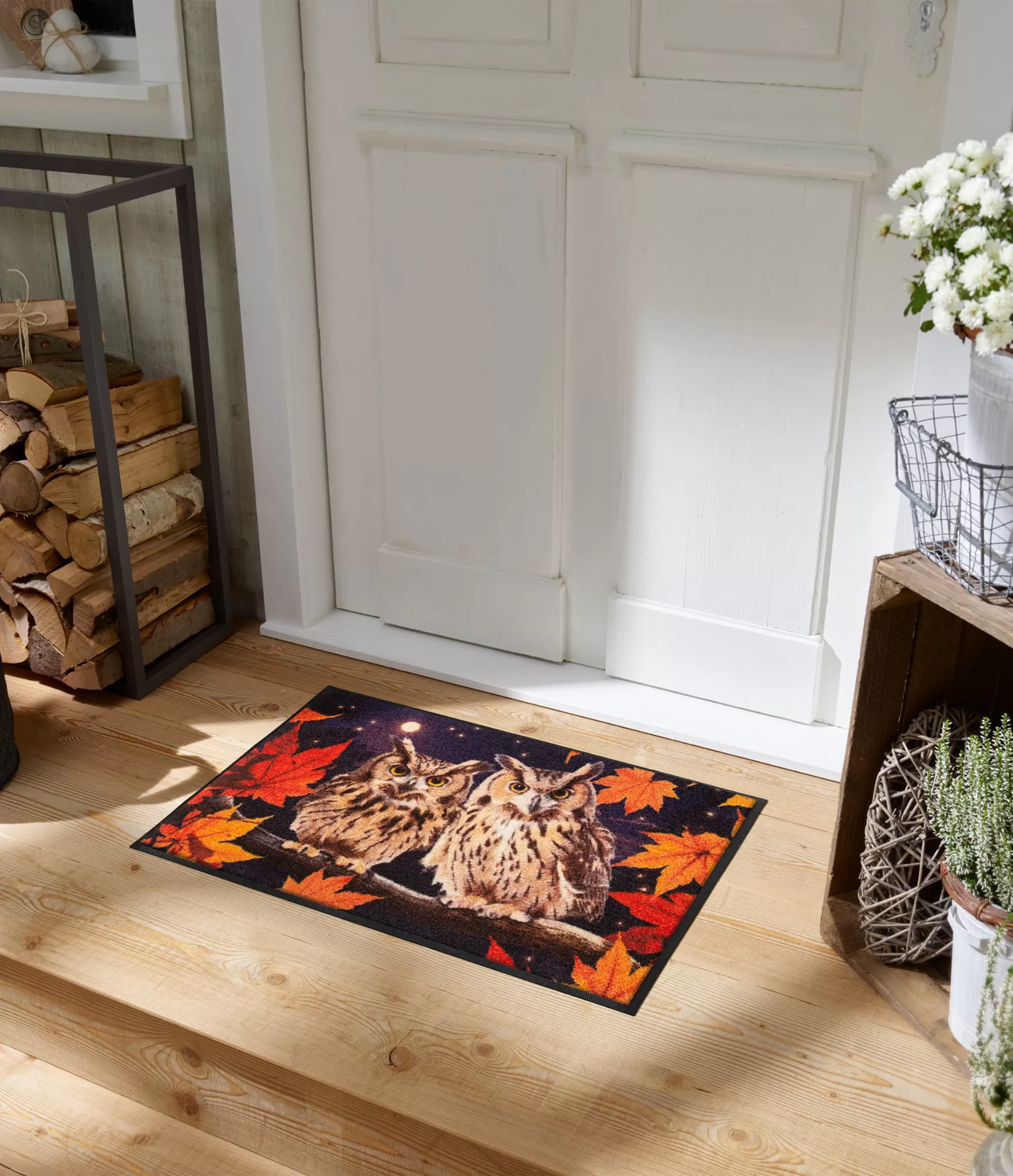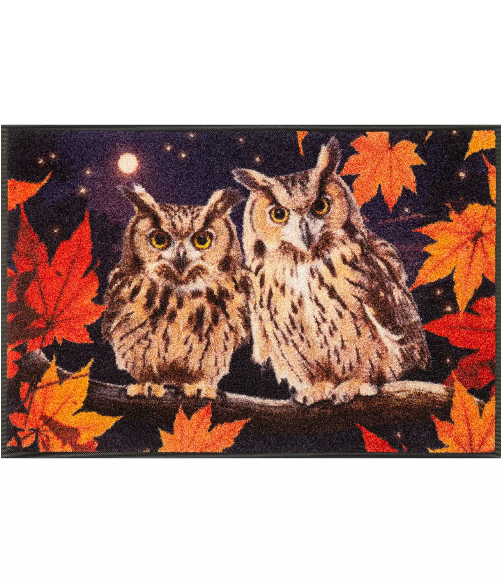 Stilīgs durvju paklājs „Night Owls“ izceļas ar spilgtu un raksturīgu dizainu, kurā attēlotas divas pūces nakts fonā. Tumšais fons, mirdzošais mēness un košie rudens lapu akcenti veido kontrastainu, nedaudz noslēpumainu atmosfēru. Detalizētais zīmējums piešķir dzīvīgumu un dziļumu, tāpēc šis modelis kļūst par izteiksmīgu akcentu pie ieejas.