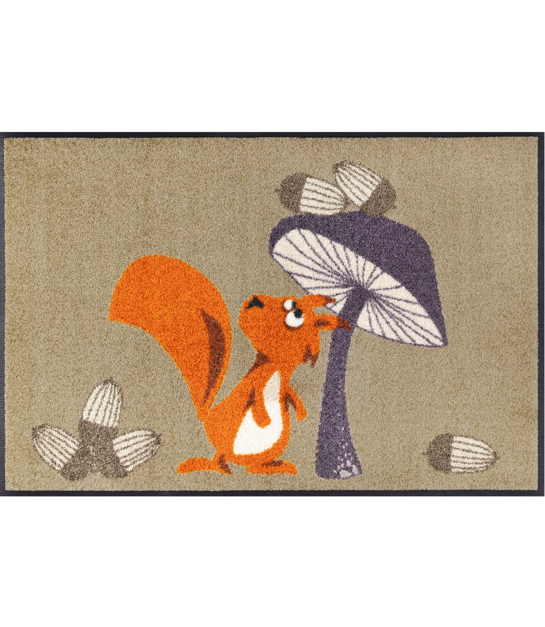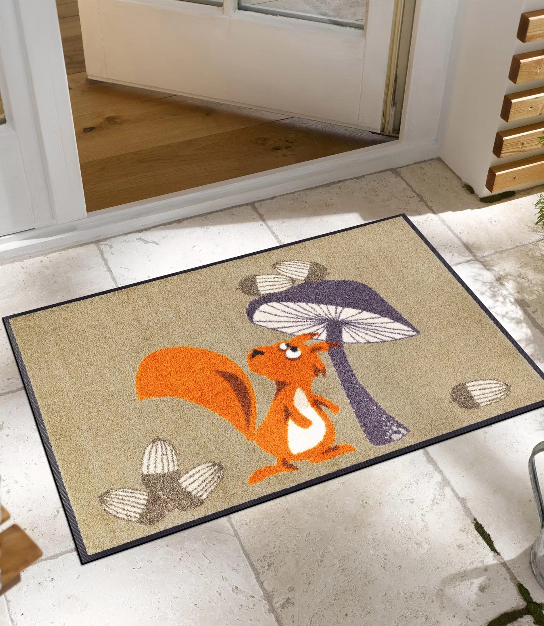 Durvju paklājs Odette uzreiz piesaista uzmanību ar savu rotaļīgo un siltumu izstarojošo dizainu. Jautrā vāvere apvienojumā ar stilizētiem dabas motīviem rada mājīgu un viegli atpazīstamu noskaņu. Maigā smilšu krāsas pamatne harmoniski sader ar spilgtākiem akcentiem, padarot šo izstrādājumu par smalku, bet izteiksmīgu interjera elementu. Šāda izvēle lieliski piemērota gan priekšnamam, gan citām mājas vietām, kur vēlaties piešķirt vairāk dzīvīguma un mājīguma.