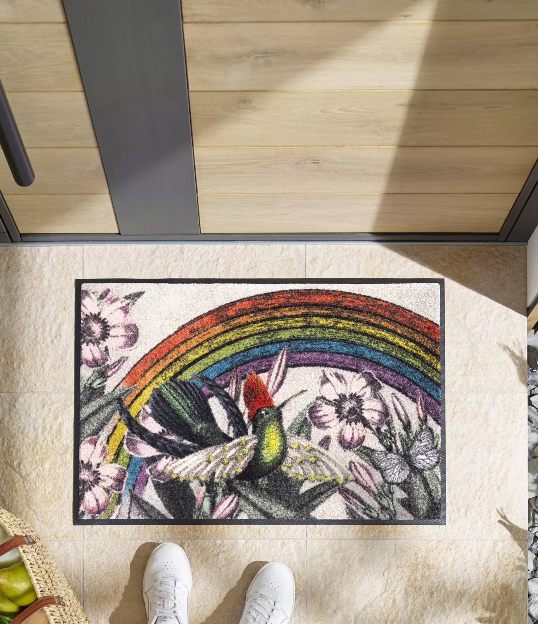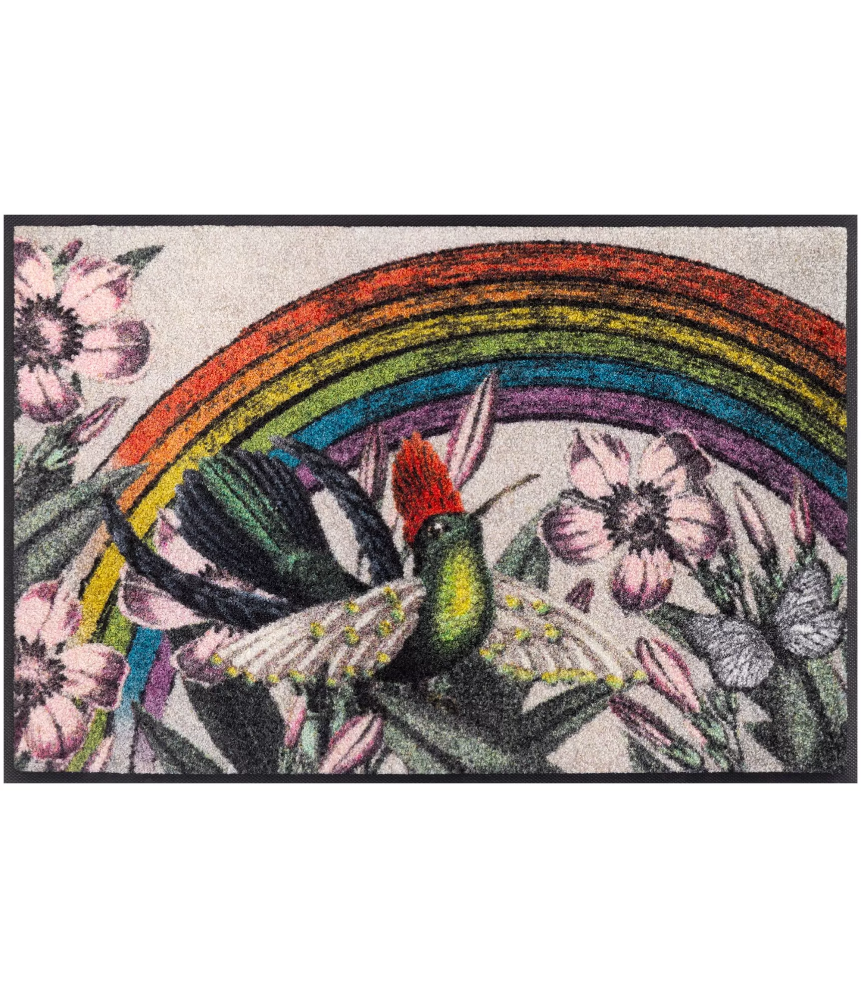 Durvju paklājs "Rainbow Garden" izceļas ar spilgtu un māksliniecisku dizainu, kurā apvienojas krāsaina varavīksne, ziedoši augi un smalki attēlots putns. Šis risinājums rada viegluma, dzīvīguma un pozitīvisma sajūtu, tāpēc lieliski piemērots ieejas zonas atdzīvināšanai. Maigs gaišs fons ļauj izcelties krāsu kombinācijai – no piesātinātiem sarkaniem, ziliem un zaļiem toņiem līdz maigākiem pasteļtoņiem, kas piešķir kopskatam harmoniju.