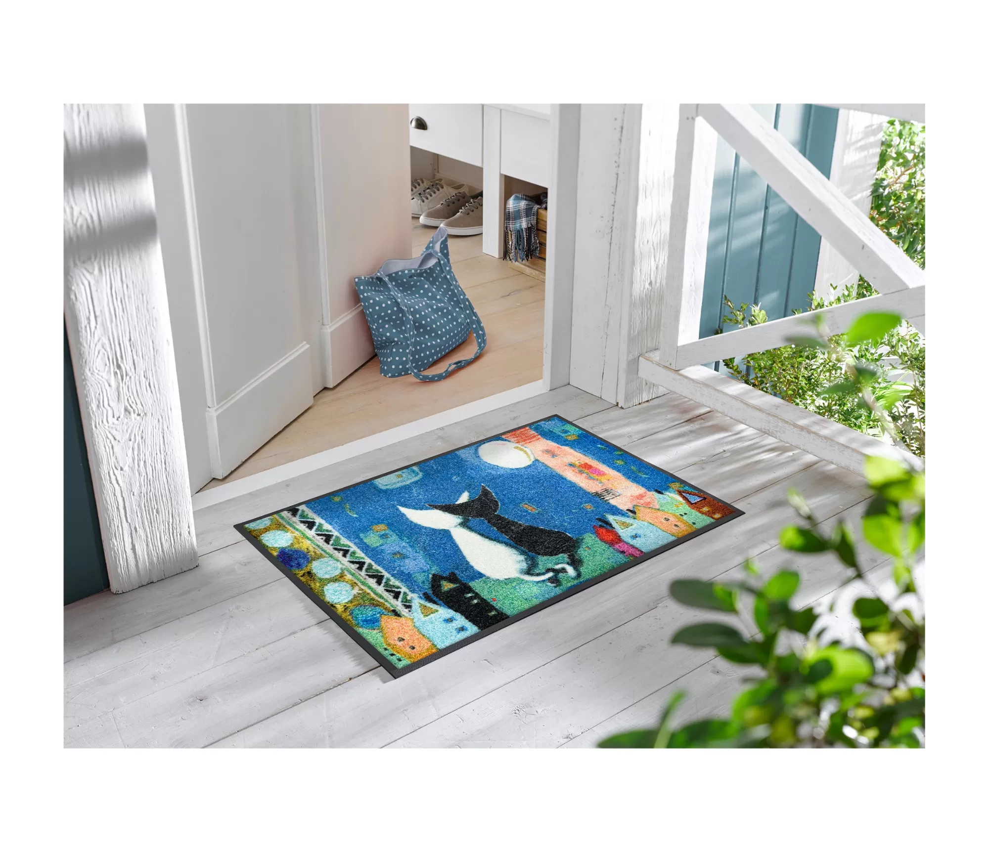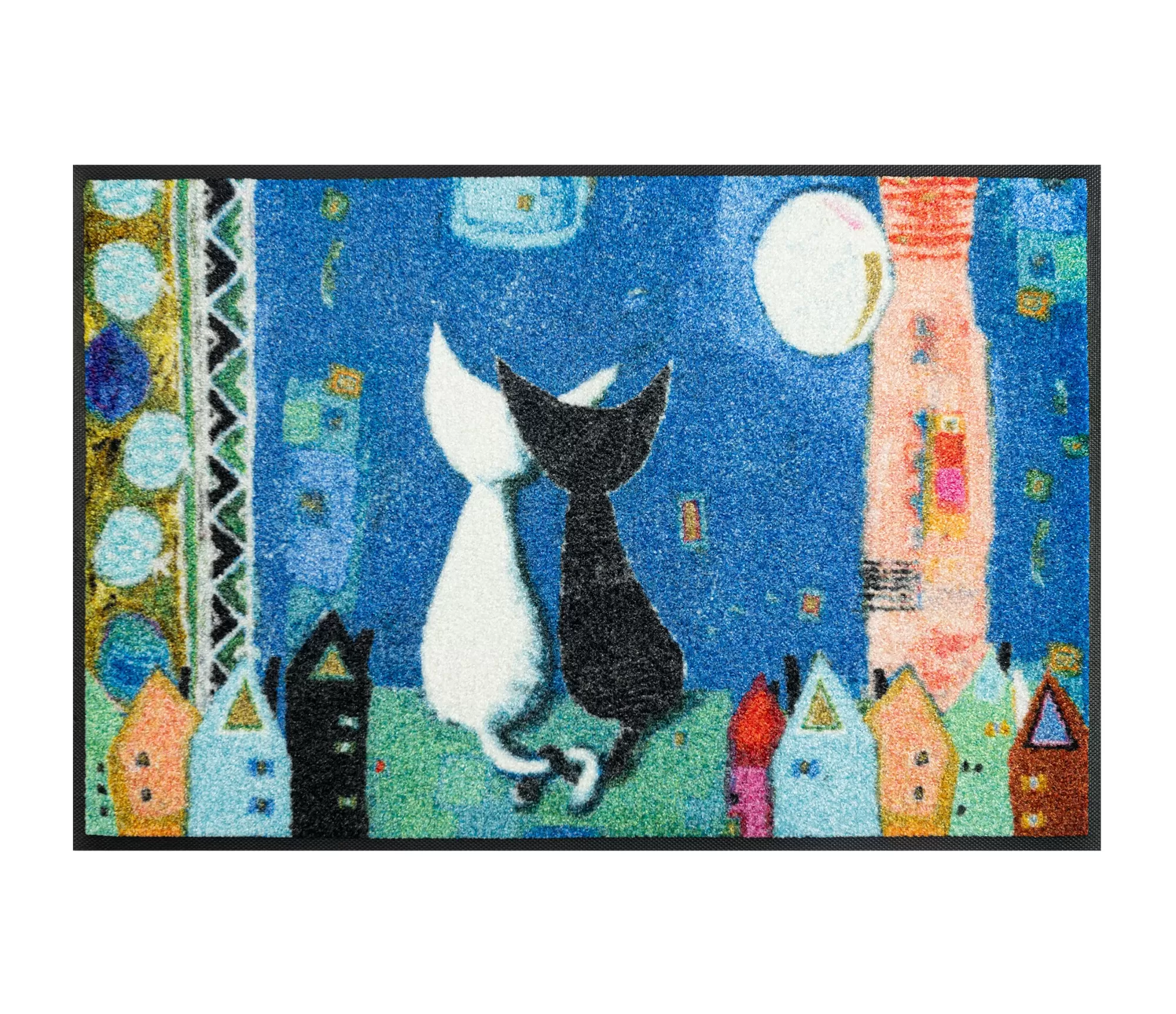 Durvju paklājs Romance izceļas ar maigu, romantisku dizainu, kurā apvienojas krāsains pilsētas ainavas motīvs un divi stilizēti kaķi. Zilais fons, spilgtie mājiņu akcenti un smalkās detaļas rada mājīgu, sapņainu noskaņu. Šāds izstrādājums lieliski iederas gan modernā, gan rotaļīgākā interjerā, piešķirot ieejas zonai īpašu raksturu. Tas ir ne tikai praktisks risinājums, bet arī vizuāli pievilcīgs akcents, kas sagaida ikvienu, atgriežoties mājās.