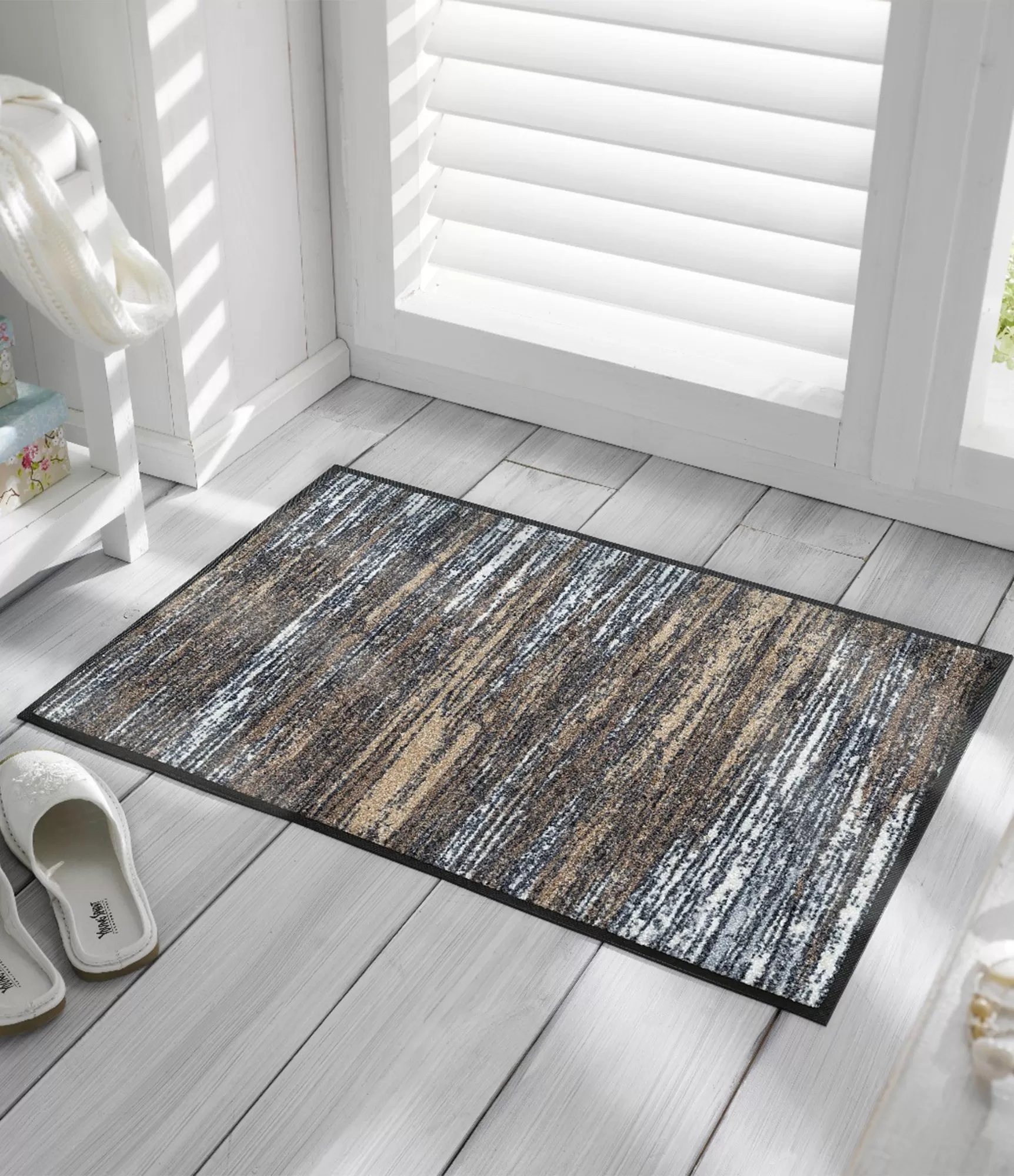 Stilīgs durvju paklājs „Scratchy Beige“ izceļas ar modernu, viegli pieskaņojamu dizainu, kurā apvienojas dabīgi smilškrāsas, pelēcīgi un tumšāki toņi. Šis raksts atgādina viegli teksturētu virsmu, tāpēc lieliski maskē ikdienas netīrumus un saglabā kārtīgu izskatu pat intensīvi izmantotās vietās. Tā ir praktiska izvēle tiem, kuri vēlas apvienot estētiku ar funkcionalitāti.