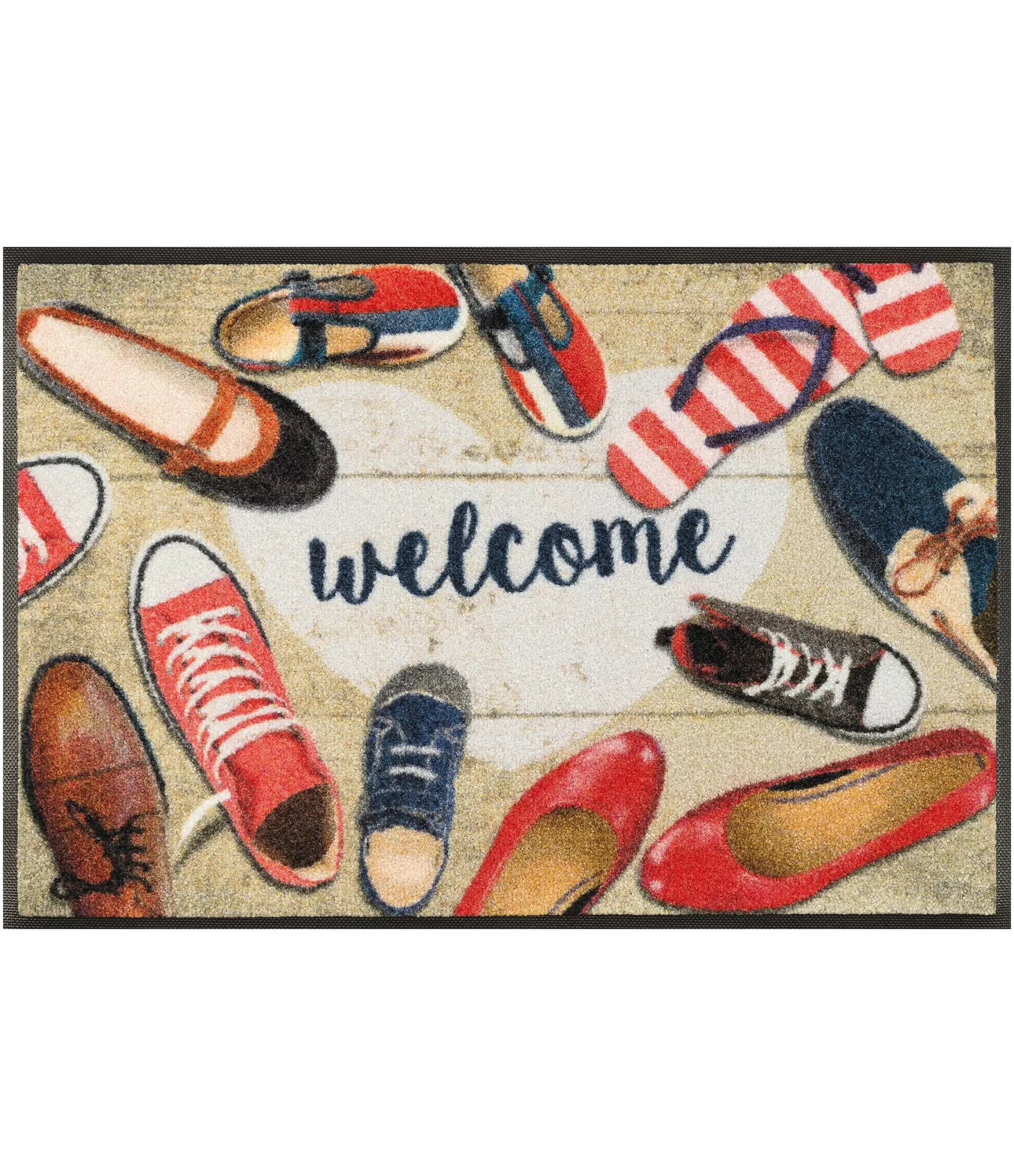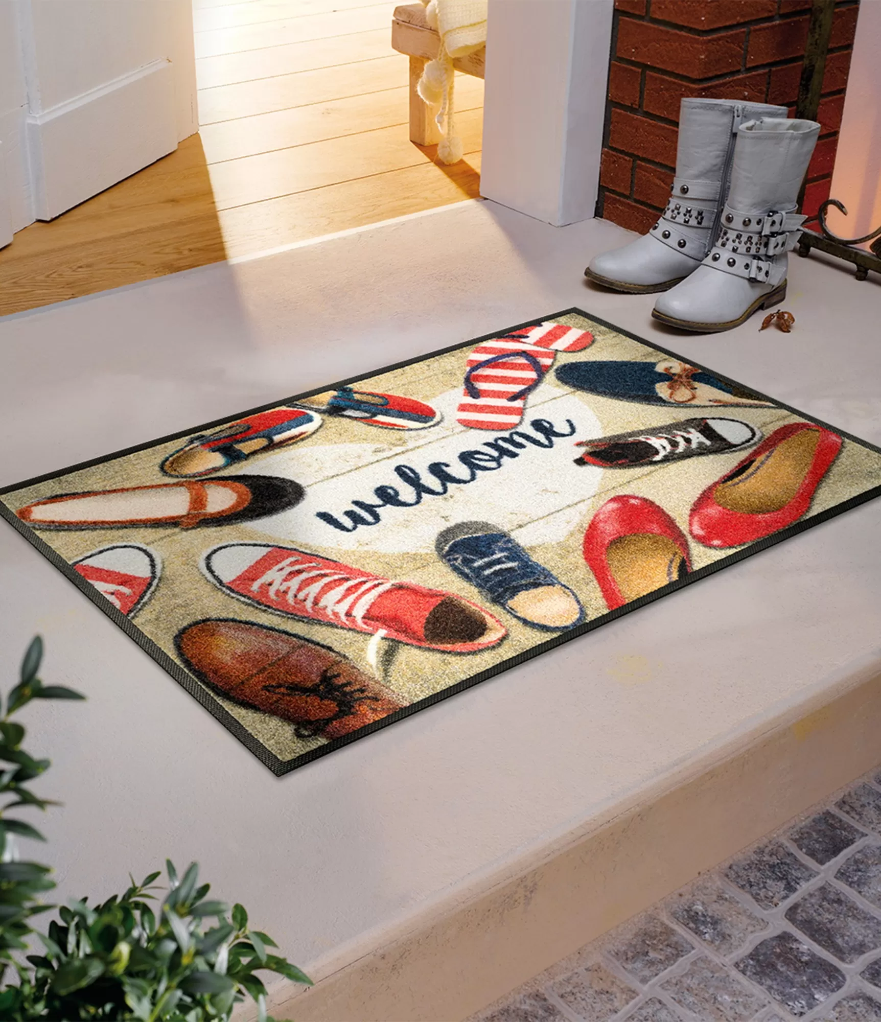 Durvju paklājs „Shoes Welcome“ uzreiz rada mājīgu un dzīvīgu noskaņu pie ieejas. Tā dizains rotāts ar dažādu veidu apaviem – no sportiskiem līdz elegantiem, tāpēc paklājs izskatās dinamisks un nedaudz rotaļīgs. Centrā esošais uzraksts „welcome“ smalki aicina ienākt, bet siltu un kontrastējošu krāsu kombinācija viegli iederas dažādos interjeros.