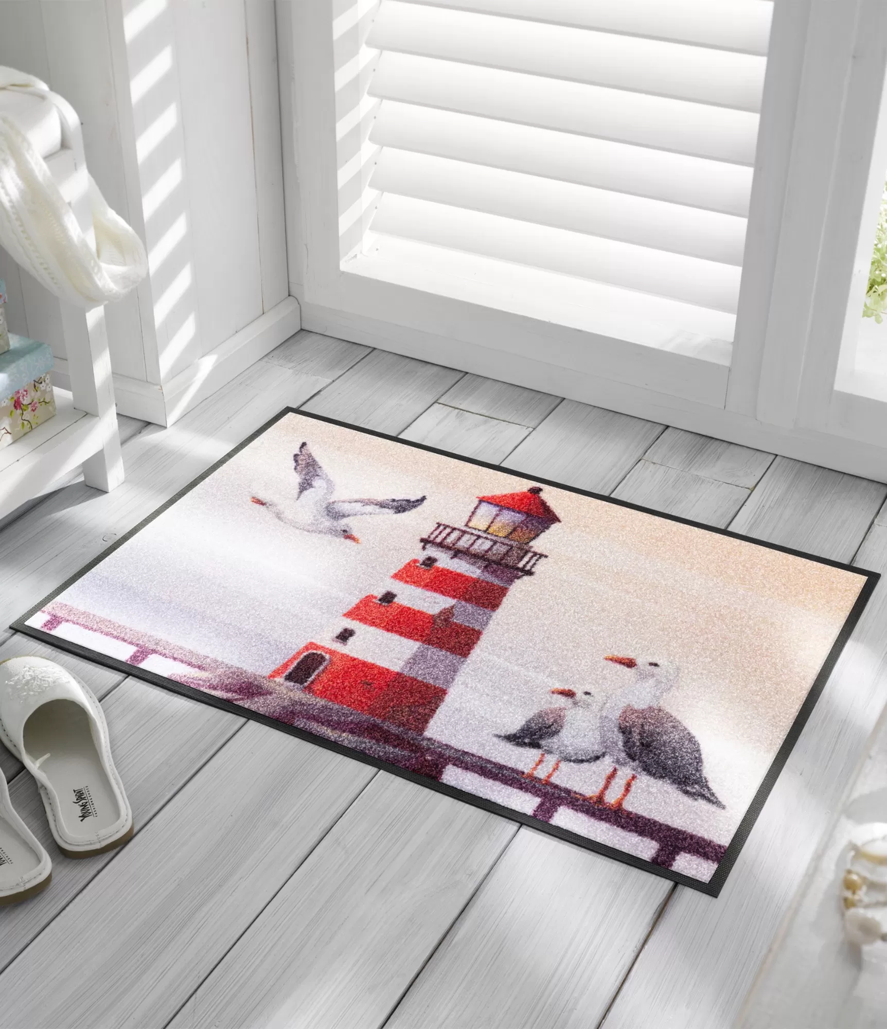 Durvju paklājs „Shoreside“ izceļas ar vieglu piekrastes motīvu – bāka un kaijas rada mierīgu, gaišu iespaidu. Šis dizains piešķir ieejas zonai mājīgumu un vizuālu vieglumu, bet nepārslogo interjeru. Tas ir praktisks risinājums, kad vēlas skaidru, kārtīgu izskatu ar izteiksmīgu akcentu.
