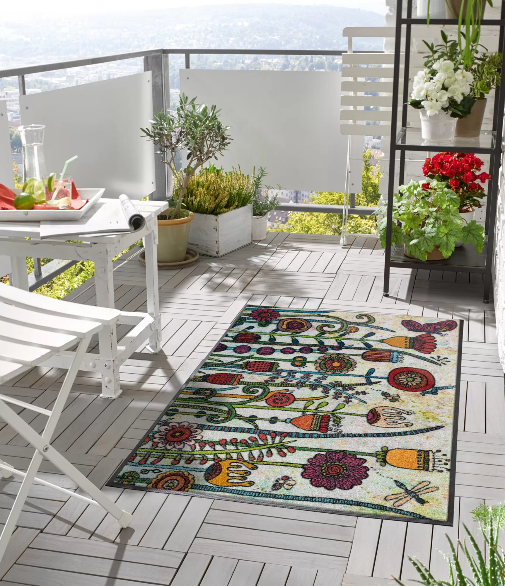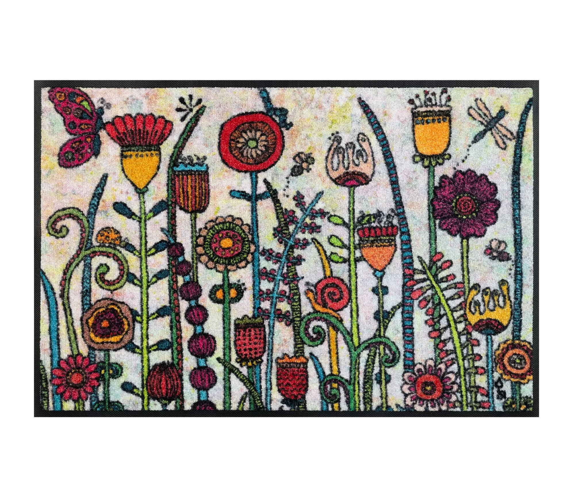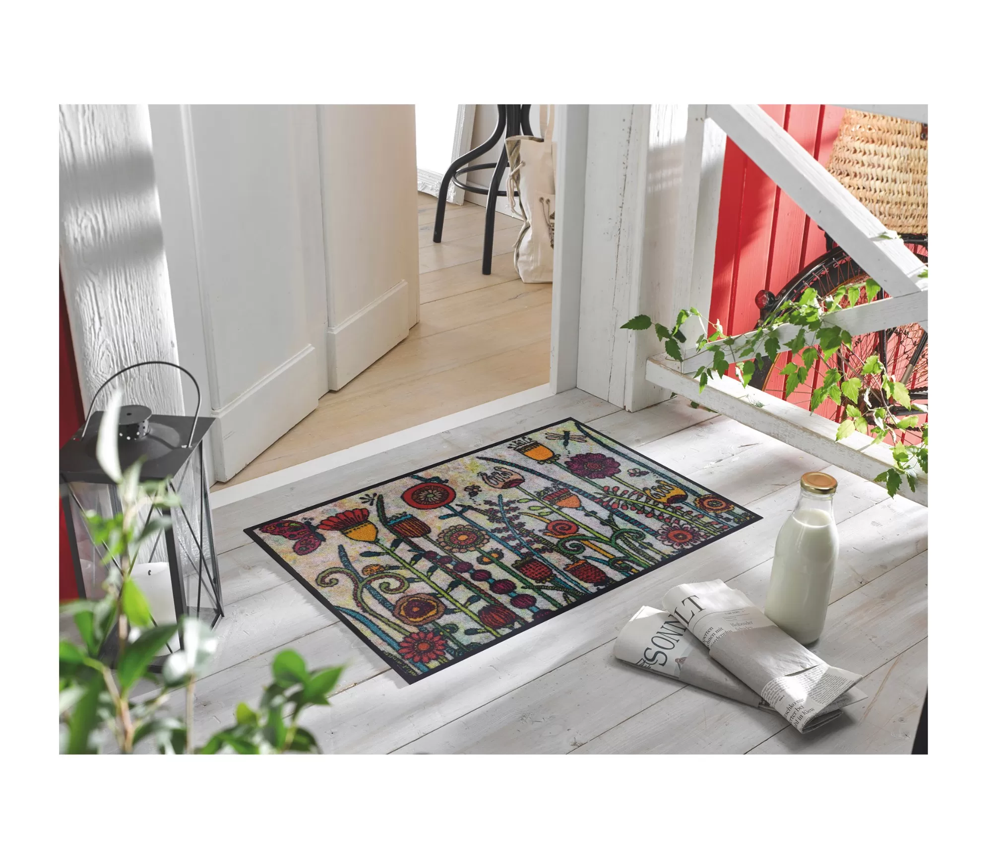 Mazgājamais durvju paklājs Sonnentag uzreiz rada siltu un dzīvīgu iespaidu. Krāsainie augu un ziedu motīvi atgādina vasaras dienu uz terases vai dārzā, tāpēc šis paklājs kļūst ne tikai par praktisku, bet arī dekoratīvu akcentu. Spilgtās, bet harmoniski saskaņotās krāsas piešķir enerģiju un mājīgumu jebkurai telpai.