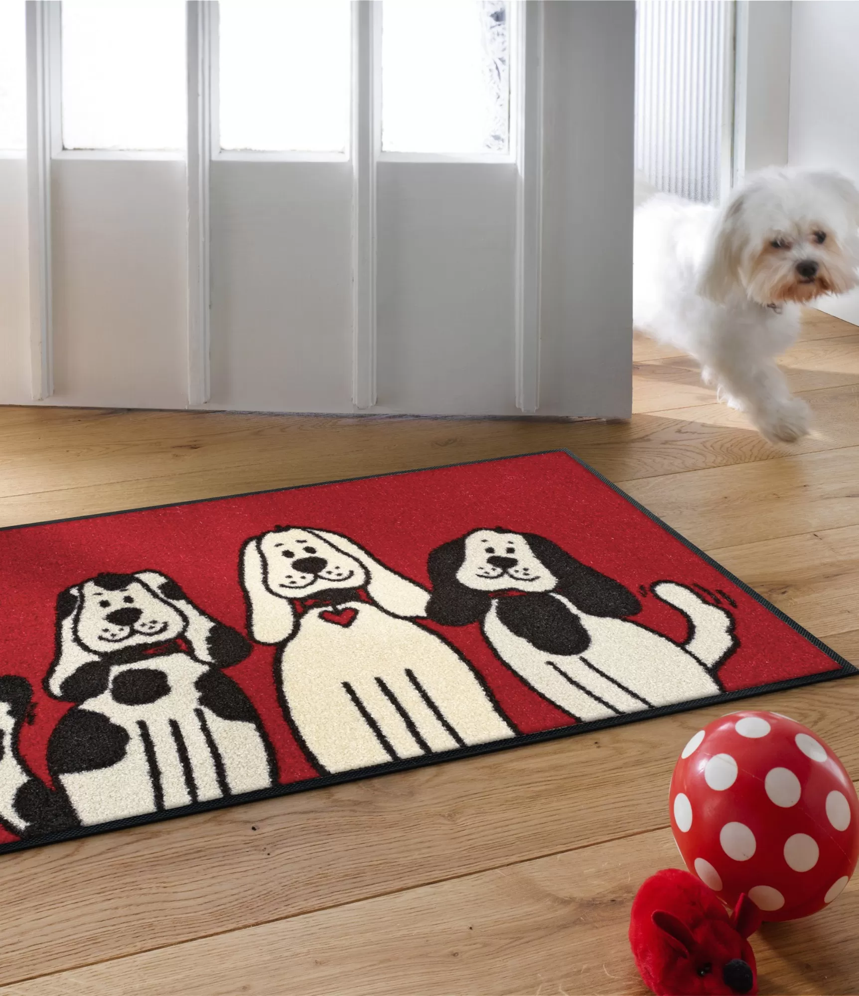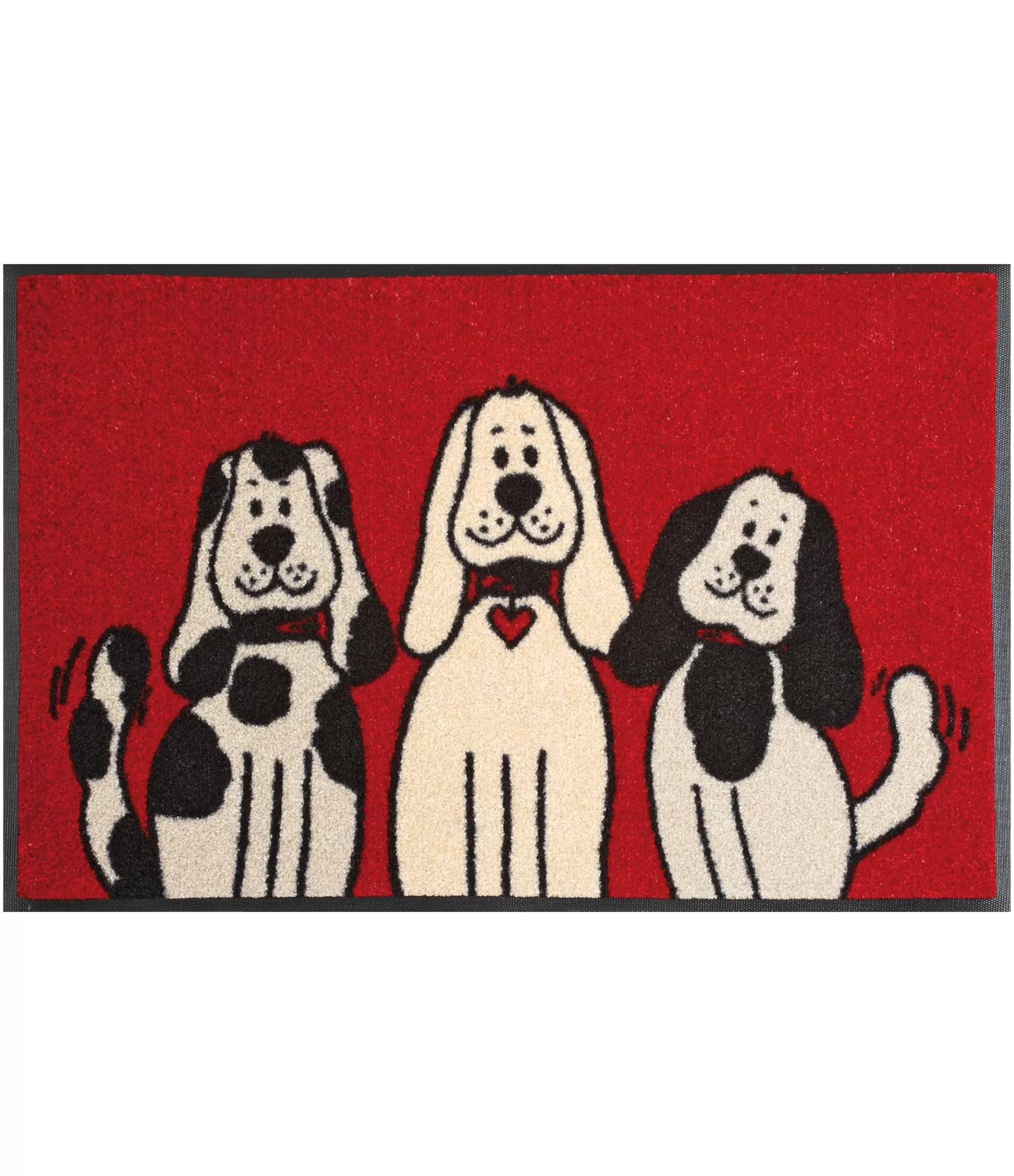 Mazgājamais durvju paklājs Three Dogs ir rotaļīga un noskaņu raisoša izvēle, kas uzreiz piesaista uzmanību. Spilgts sarkans fons un trīs mīļi kucēni rada siltu, draudzīgu atmosfēru jau pie ieejas mājās. Šāds dizains ne tikai rotās ieeju, bet arī piešķirs tai dzīvīgumu un raksturu.