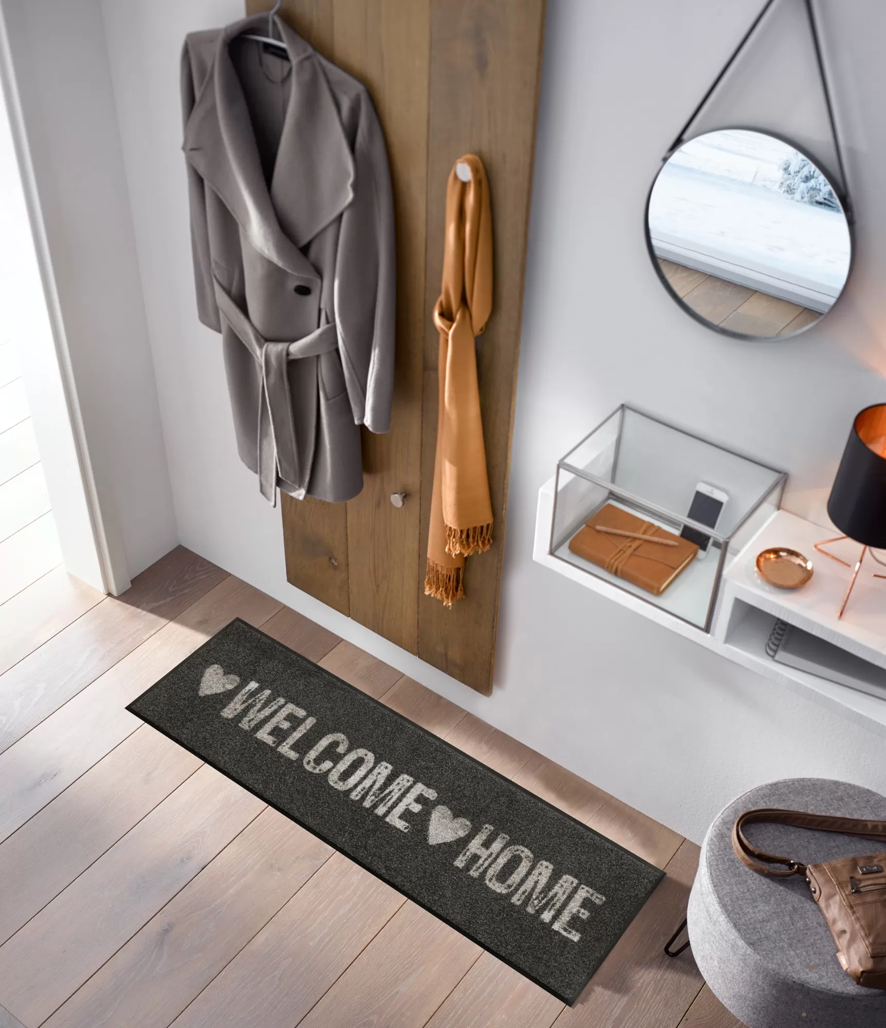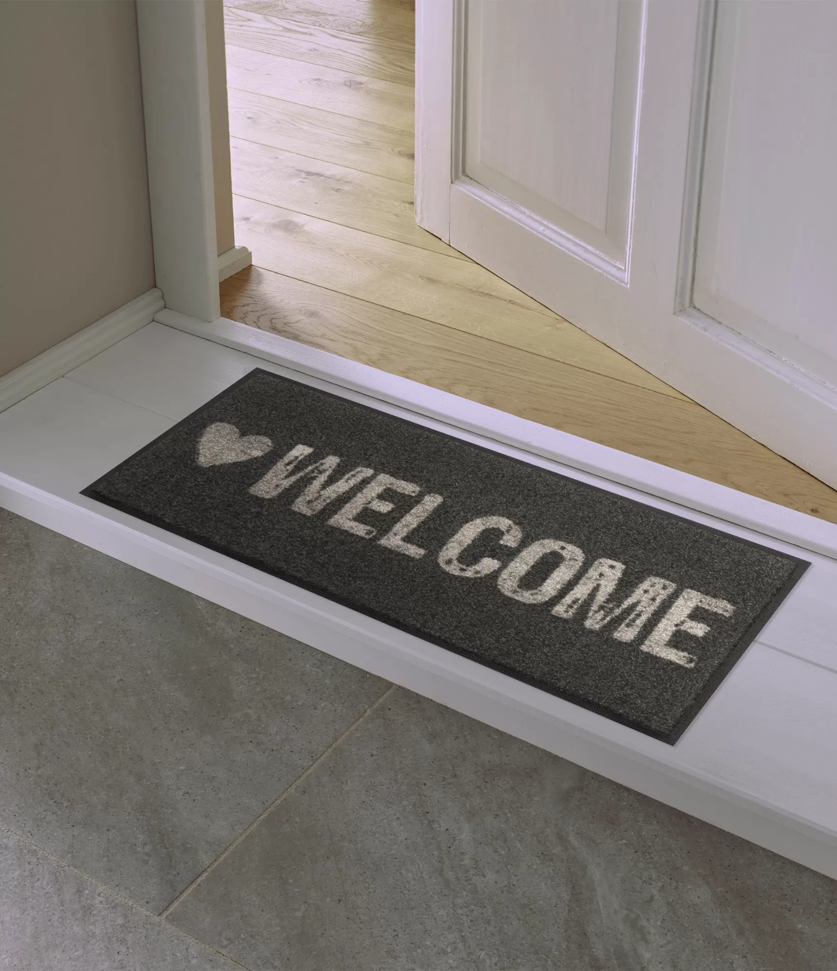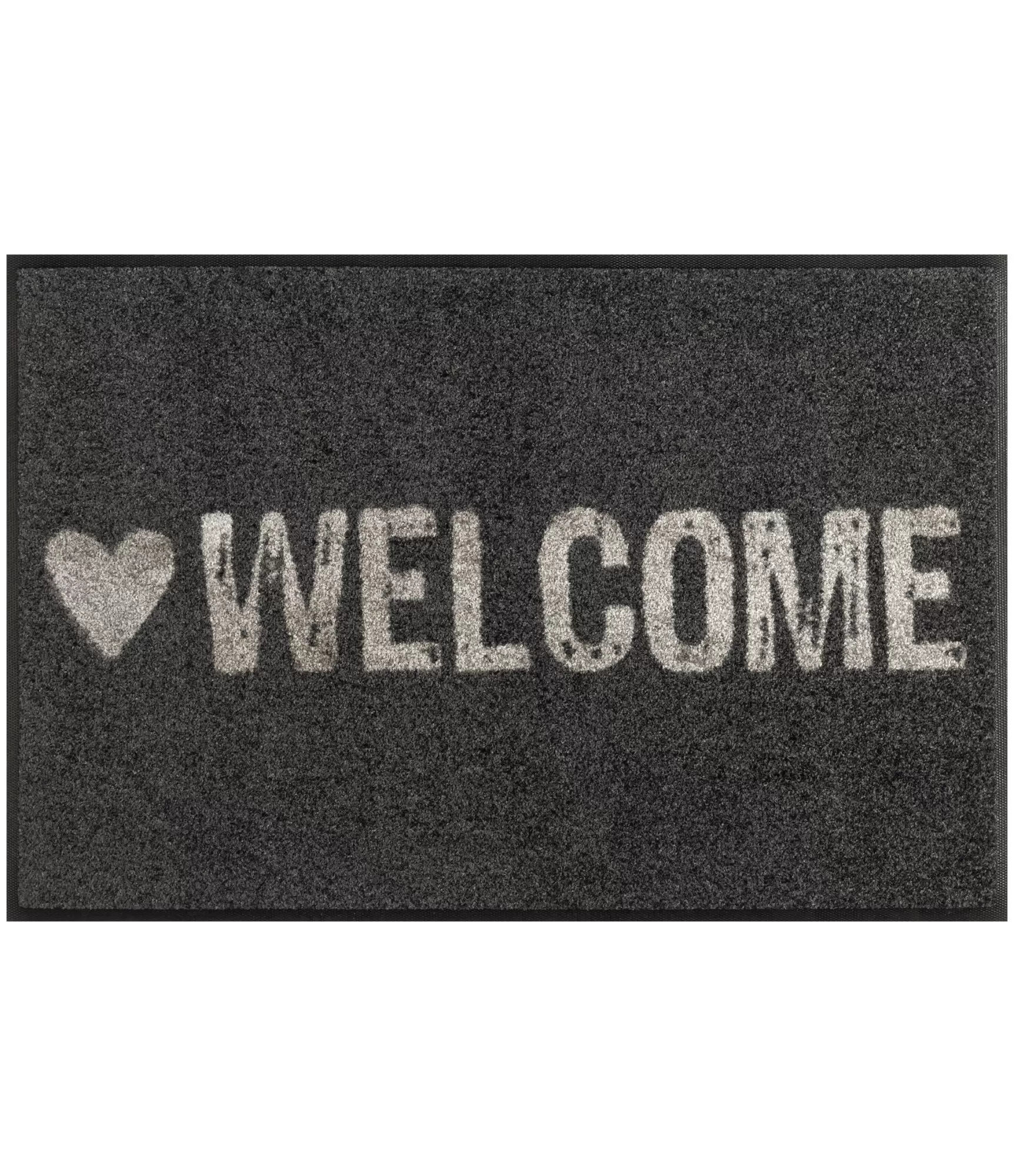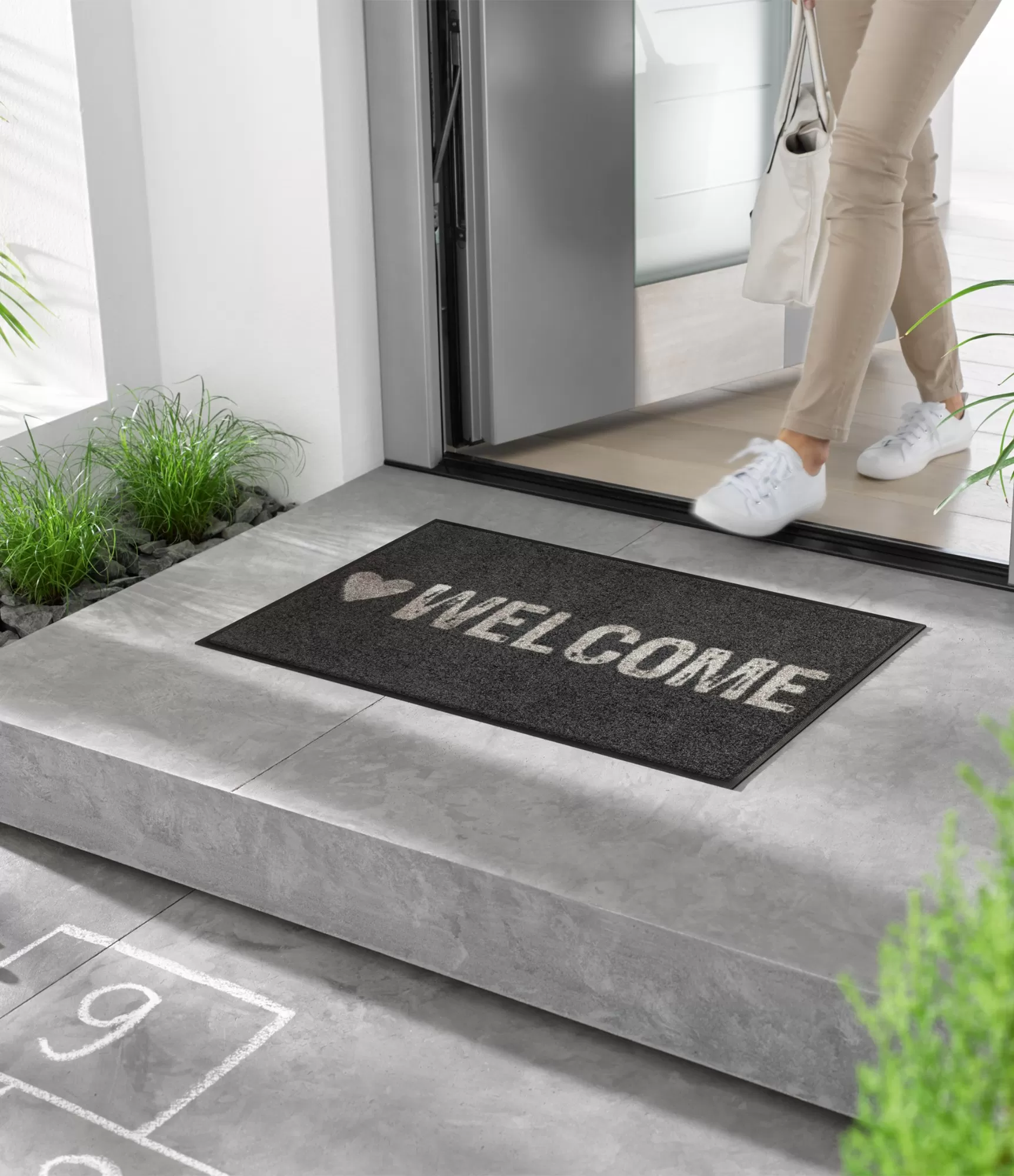 Praktisks durvju paklājs „Warmly Welcome“ izceļas ar vienkāršu, bet ļoti siltu dizainu, kas uzreiz rada mājīgu noskaņu, tiklīdz tiek pavērtas durvis. Tumšais fons un gaišais uzraksts ar sirsniņas simbolu izskatās smalki, bet vienlaikus skaidri nodod viesmīlības sajūtu. Tas ir universāls risinājums, kas piemērots gan moderniem, gan klasiskajiem mājokļiem.