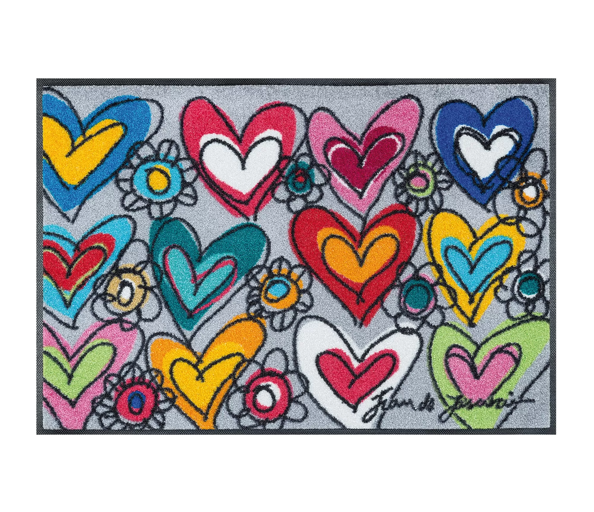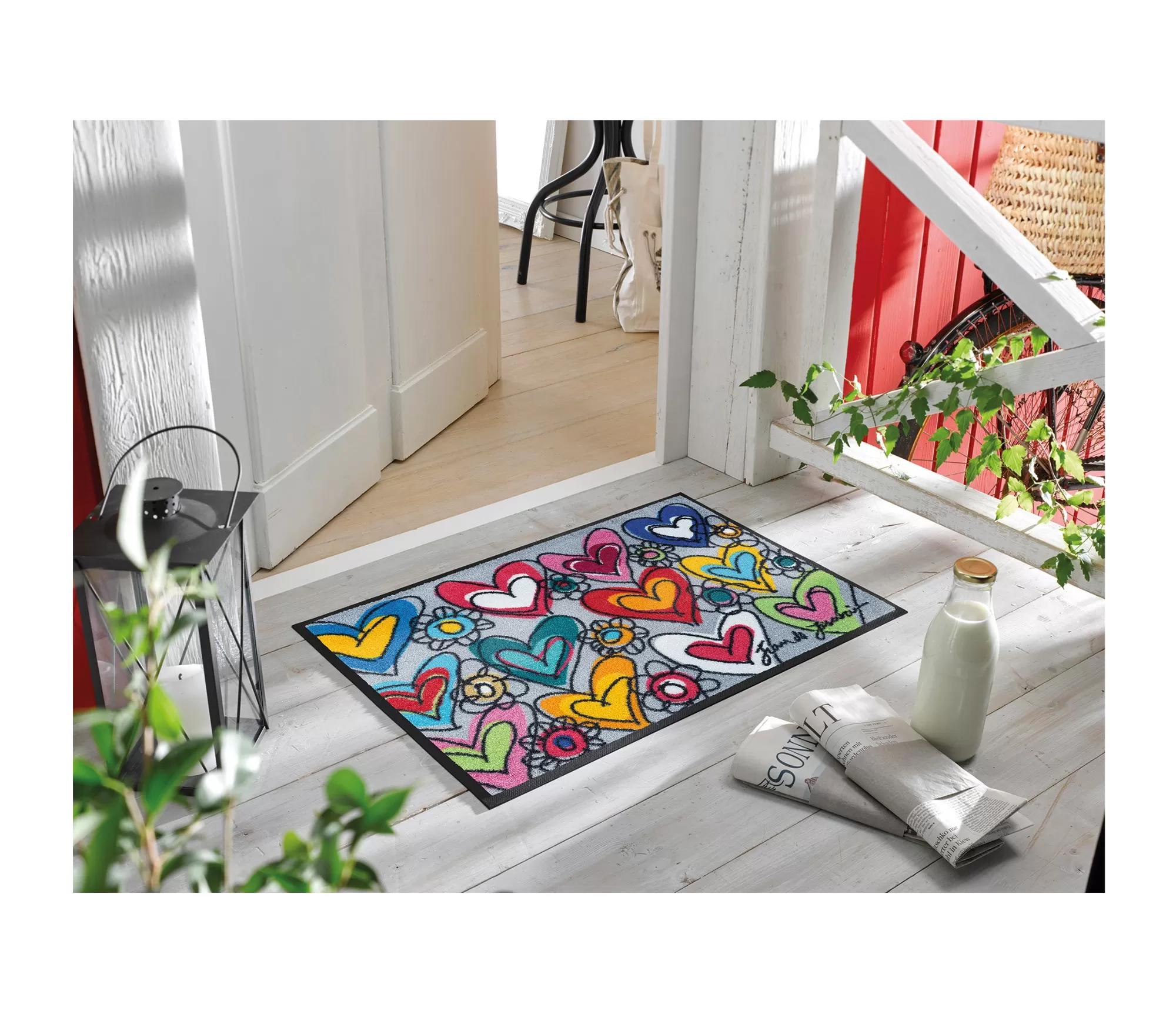 Durvju paklājs With love izceļas ar spilgtu un dzīvespriecīgu dizainu, kurā dominē krāsainas sirsniņas un smalki ziedu motīvi. Šī kombinācija rada viegluma, siltuma un pozitīvas enerģijas iespaidu, tāpēc, ienākot mājās, uzreiz jūtama mājīga un dzīvīga atmosfēra. Tā ir lieliska izvēle tiem, kuri vēlas savā telpā ienest vairāk krāsu un izteiksmīguma.