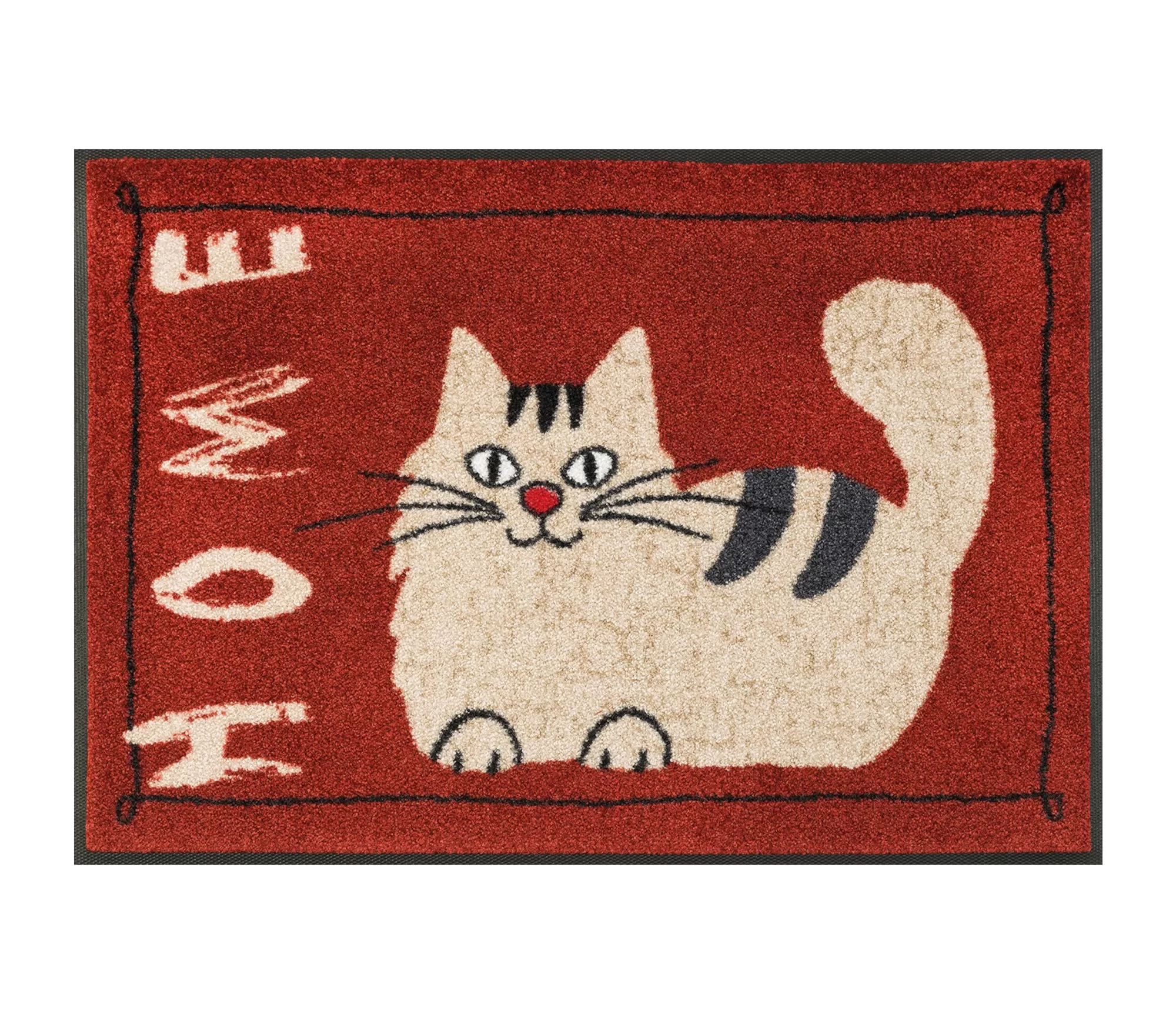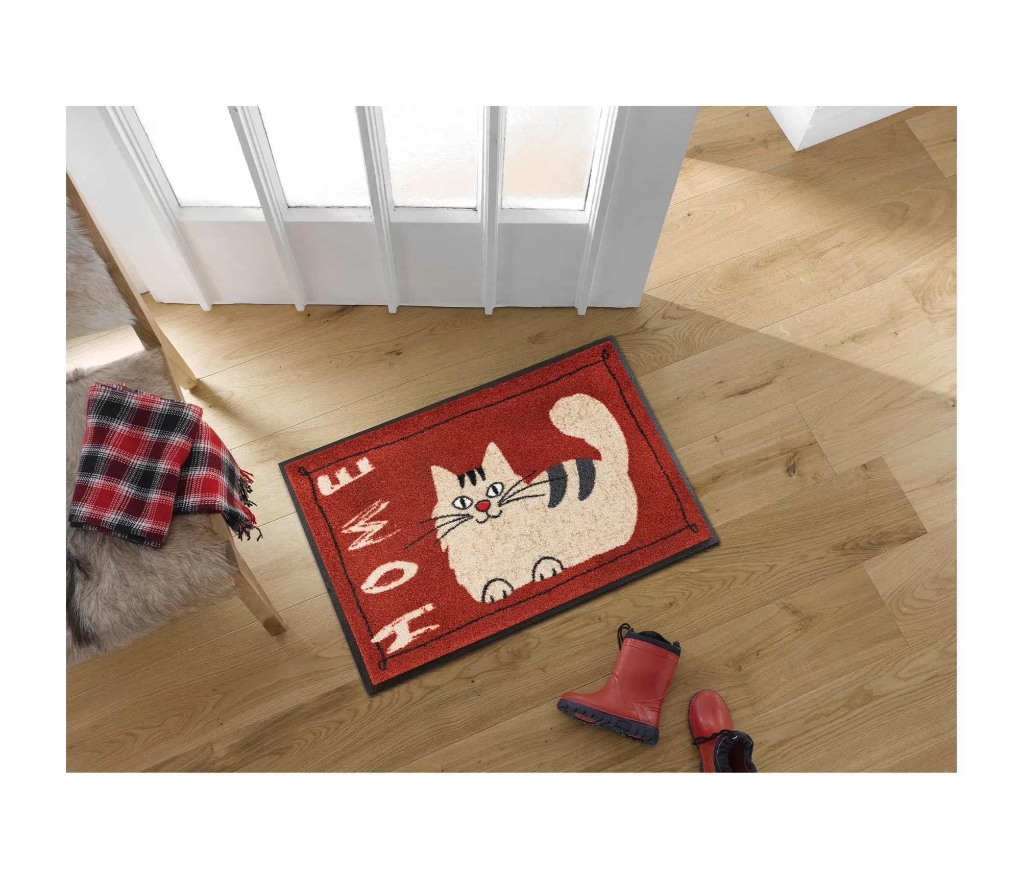 Durvju paklājs Catty Home uzreiz piesaista uzmanību ar savu siltu, piesātinātu sarkano fonu un rotaļīgu kaķa zīmējumu. Kontrastējošās krāsas piešķir dzīvīgumu, bet vieglais, ar roku zīmētais stils rada mājīguma un siltuma sajūtu. Tas ir lielisks risinājums tiem, kuri vēlas, lai mājas ieeja būtu ne tikai kārtīga, bet arī izteiksmīga un aicinoša.
