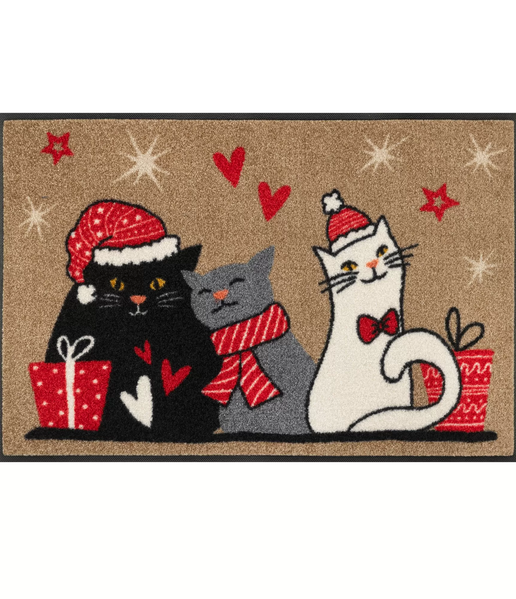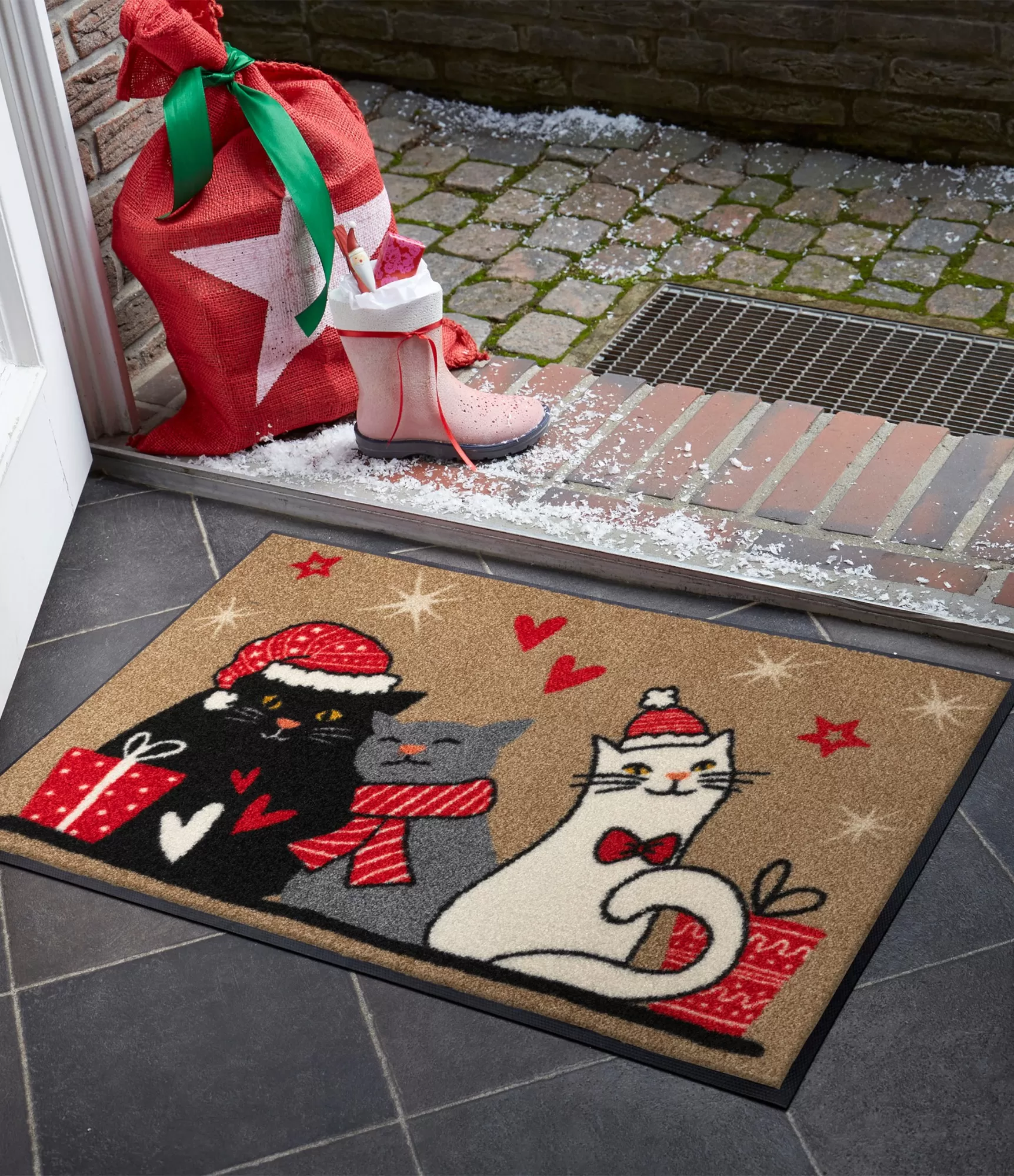 Durvju paklājs Cuddle Time uzreiz piesaista uzmanību ar rotaļīgu un siltu dizainu, kurā savijas svētku motīvi un mīļas detaļas. Kaķu kompozīcija ar smalkiem sarkaniem akcentiem izskatās dzīvīga, bet nepārslogota, tāpēc viegli iekļaujas dažādos mājas interjeros. Šāds paklājs labi iederas gan modernā, gan mājīgā, klasiskā stilā.