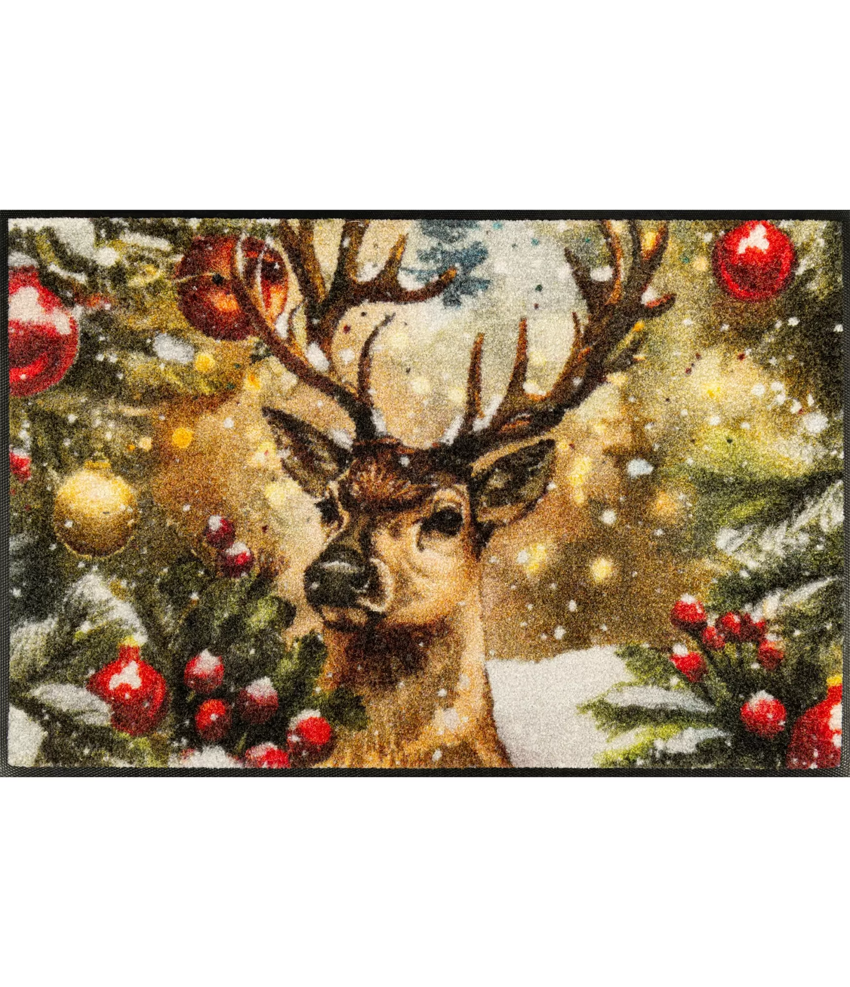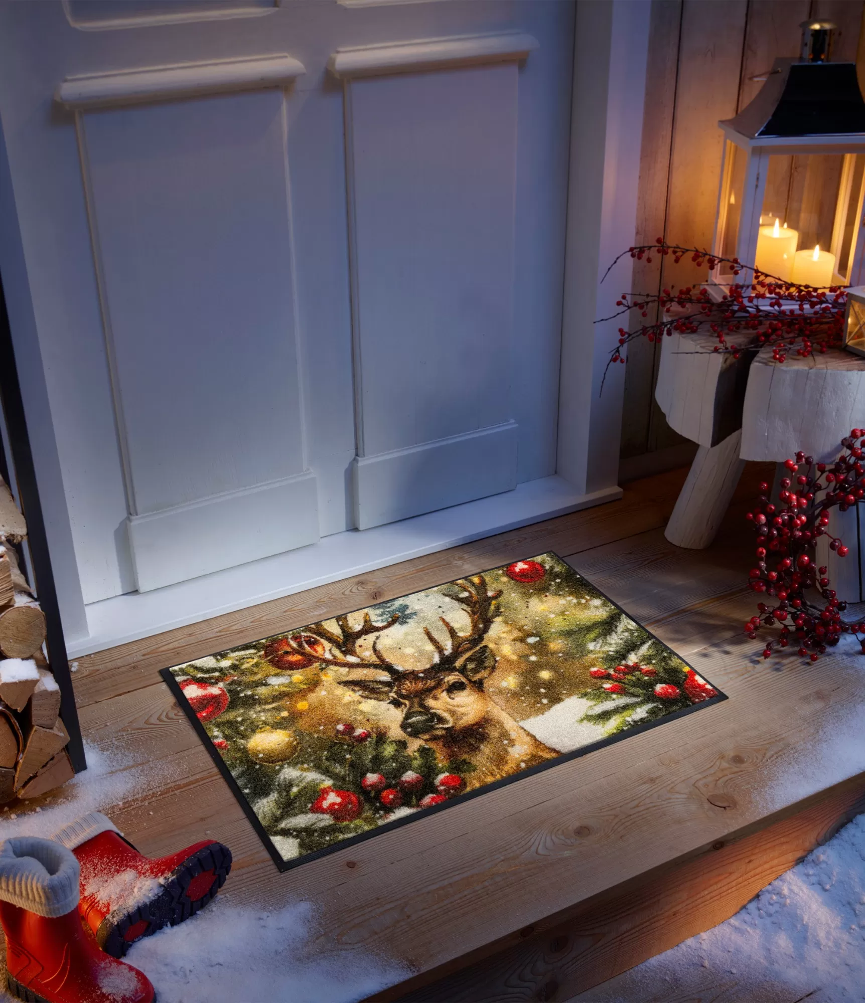 Durvju paklājs Festive Spirit uzreiz piesaista uzmanību ar savu silto un detalizēto ziemas motīvu – centrā attēlots briedis, ko ieskauj egļu zari, ogas un viegli krītoša sniega noskaņa. Krāsas ir piesātinātas, bet saglabā dabisku līdzsvaru, tāpēc paklājs viegli iederas dažādos interjeros – no klasiskā līdz mūsdienīgam.
