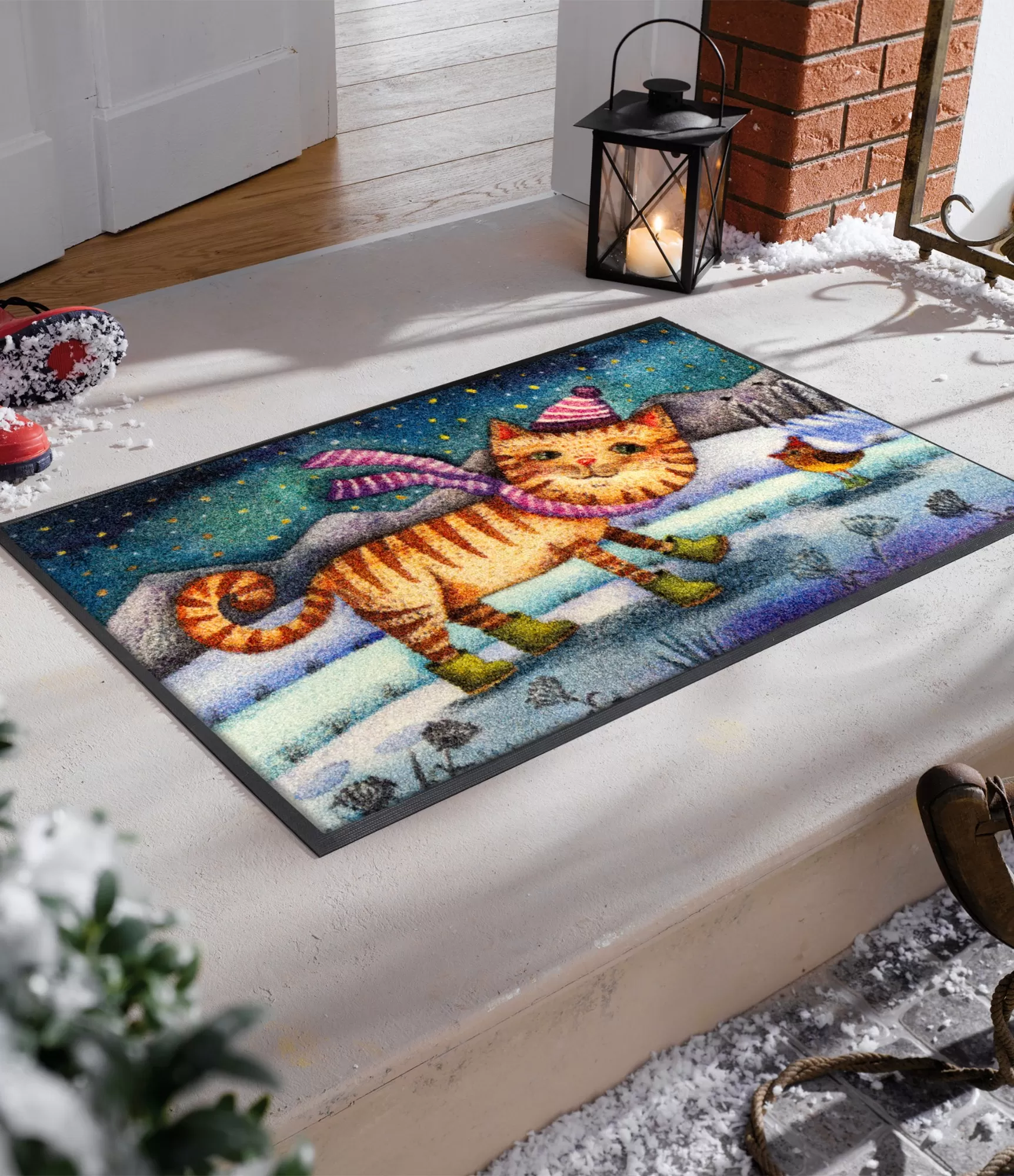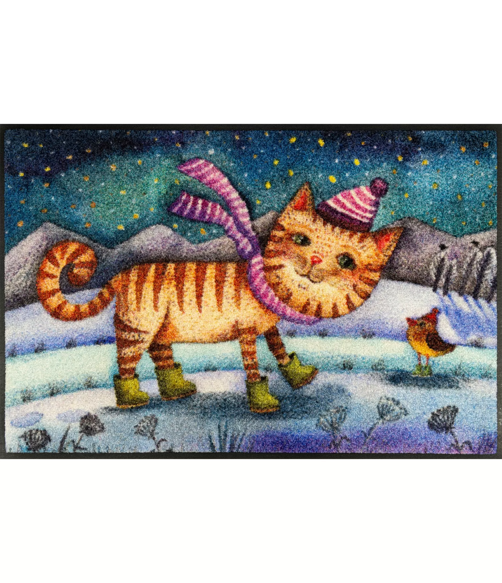 Mazgājamais durvju paklājs Little Boots izceļas ar dzīvīgu un nedaudz rotaļīgu ziemas ainu – kaķis ar šalli un maziem zābaciņiem soļo pa sniegotu ainavu, bet fonu papildina tumšas debesis ar sīkām zvaigznēm. Šī kombinācija rada vieglu un siltu emociju, kas jūtama jau pirmajā brīdī, ienākot mājās.