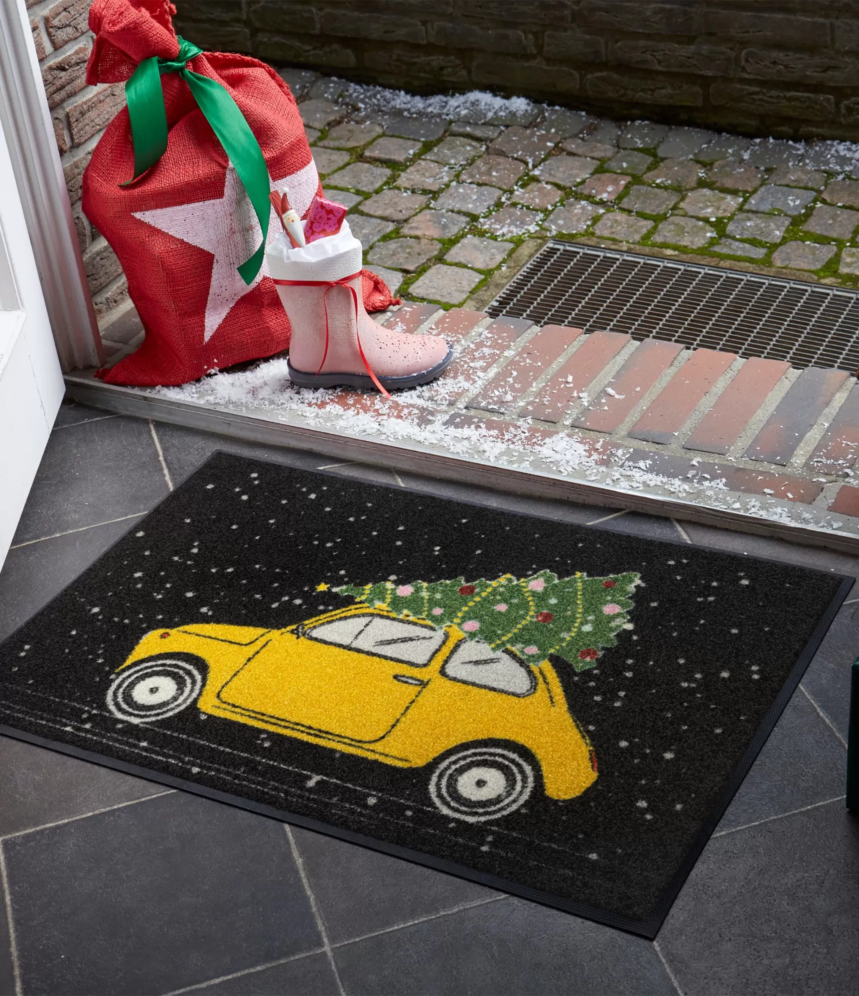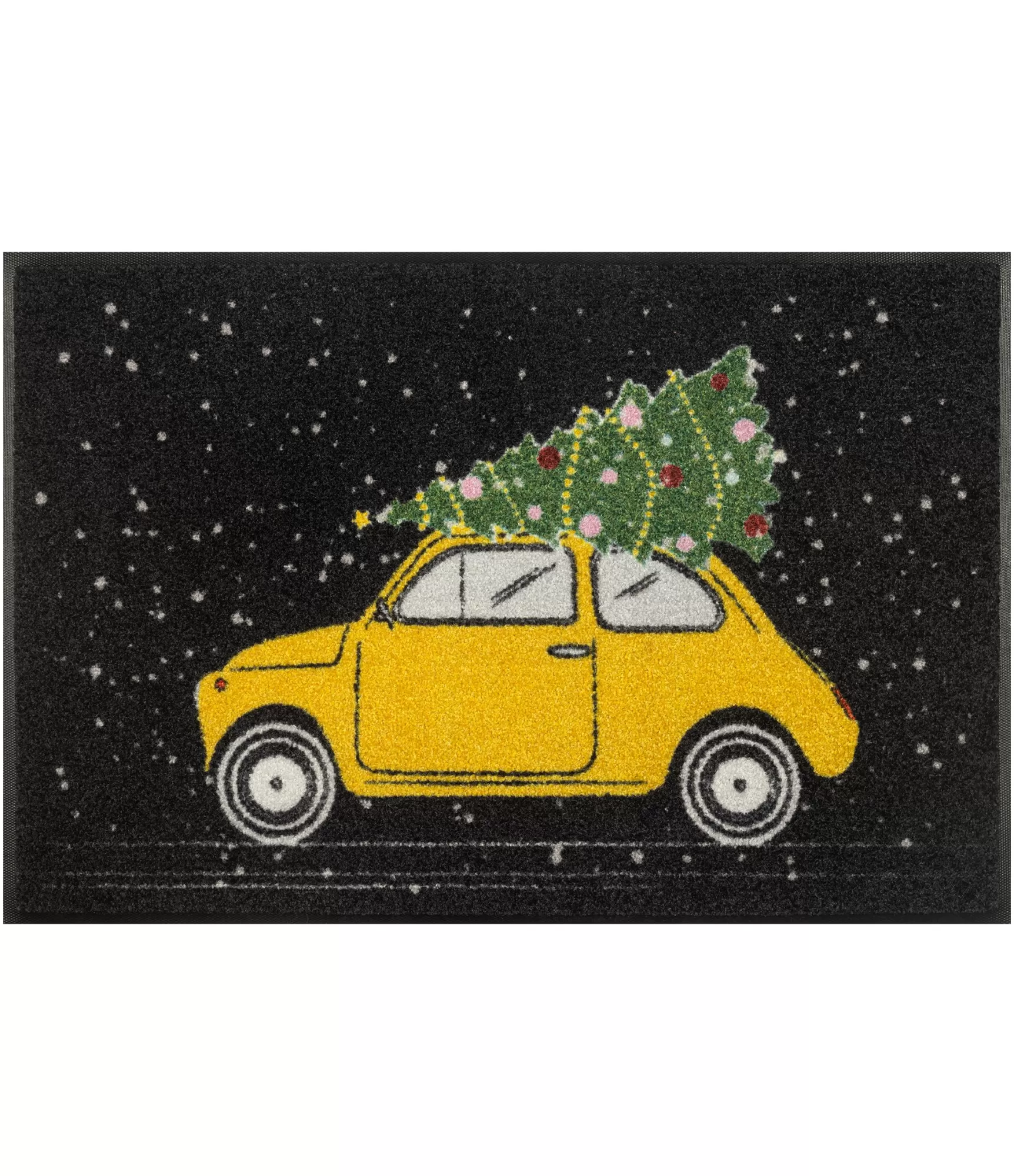 Durvju paklājs On the way izceļas ar rotaļīgu un viegli atpazīstamu dizainu, kas uzreiz rada svētku noskaņu mājās. Spilgti dzeltenais auto ar eglīti uz jumta simbolizē kustību un gatavošanos ziemas svētkiem, savukārt kontrastējošais tumšais fons ar sniega efektu ļauj krāsām izcelties vēl vairāk. Šis izstrādājums ne tikai papildina ieejas zonu, bet arī kļūst par vizuālu akcentu, kas veido kopējo mājas atmosfēru. Tas viegli pielāgojams dažādās telpās – no priekšnama līdz virtuvei vai terasei, palīdzot radīt vienotu un stilīgu vidi visā mājoklī.