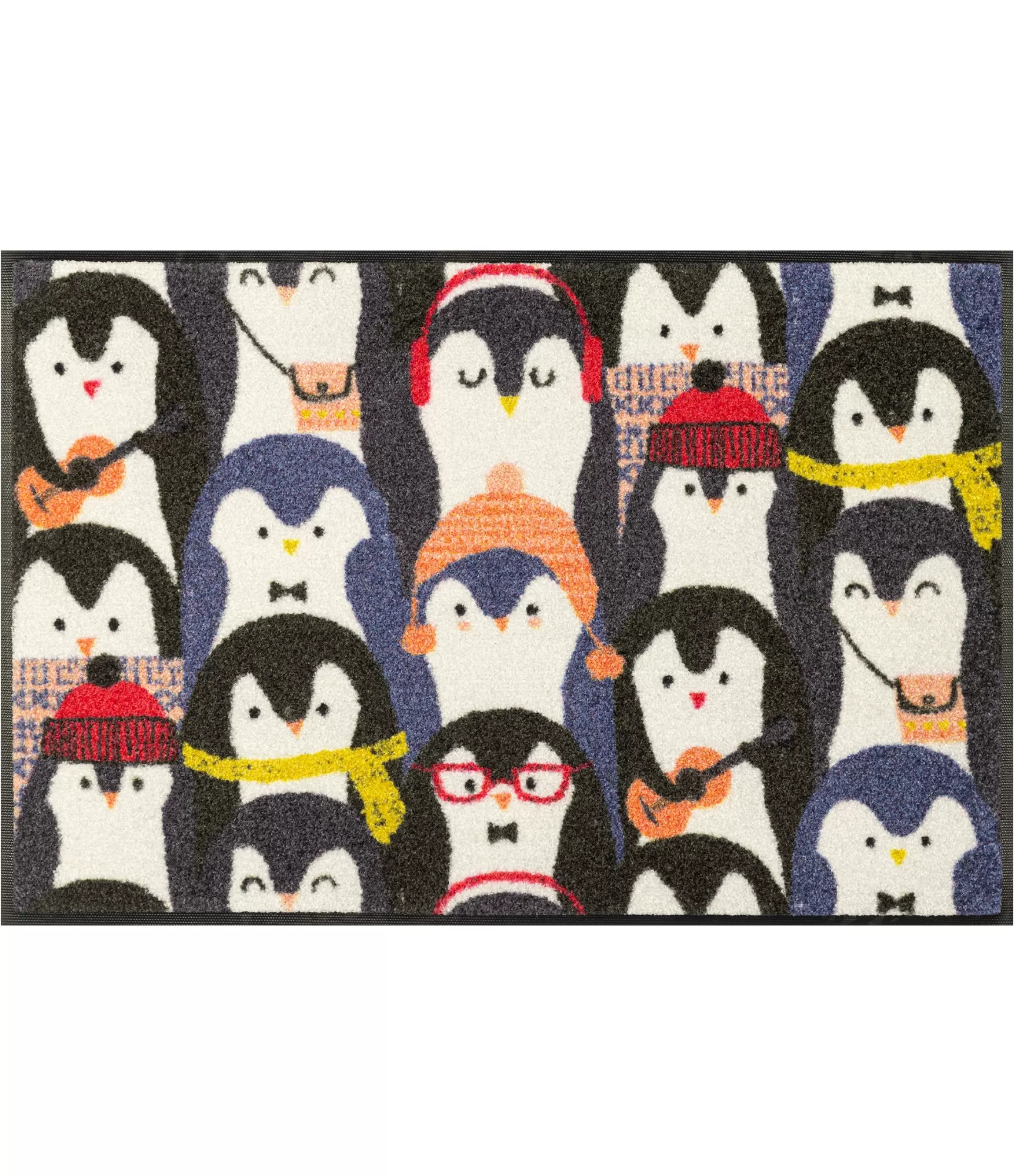 Durvju paklājs Penguin Audience izceļas ar jautru un dzīvīgu dizainu, kurā redzami dažādi raksturīgi pingvīni. Dažādas detaļas – cepures, austiņas un aksesuāri – piešķir paklājam īpašu raksturu un rada vieglu, nepiespiestu noskaņu. Krāsu kombinācija saglabā līdzsvaru, tāpēc paklājs nepārslogo telpu, bet to patīkami atdzīvina. Tas ir risinājums, kas lieliski iederas gan modernā, gan mājīgā interjerā. Paklāju var izmantot ne tikai pie ieejas durvīm – tas labi iederas arī koridorā, virtuvē, pie terases vai citās mājas vietās, kur vēlaties vairāk rakstura un dzīvīguma. Tas palīdz radīt siltu, dzīvīgu un draudzīgu atmosfēru aukstajā gada laikā.