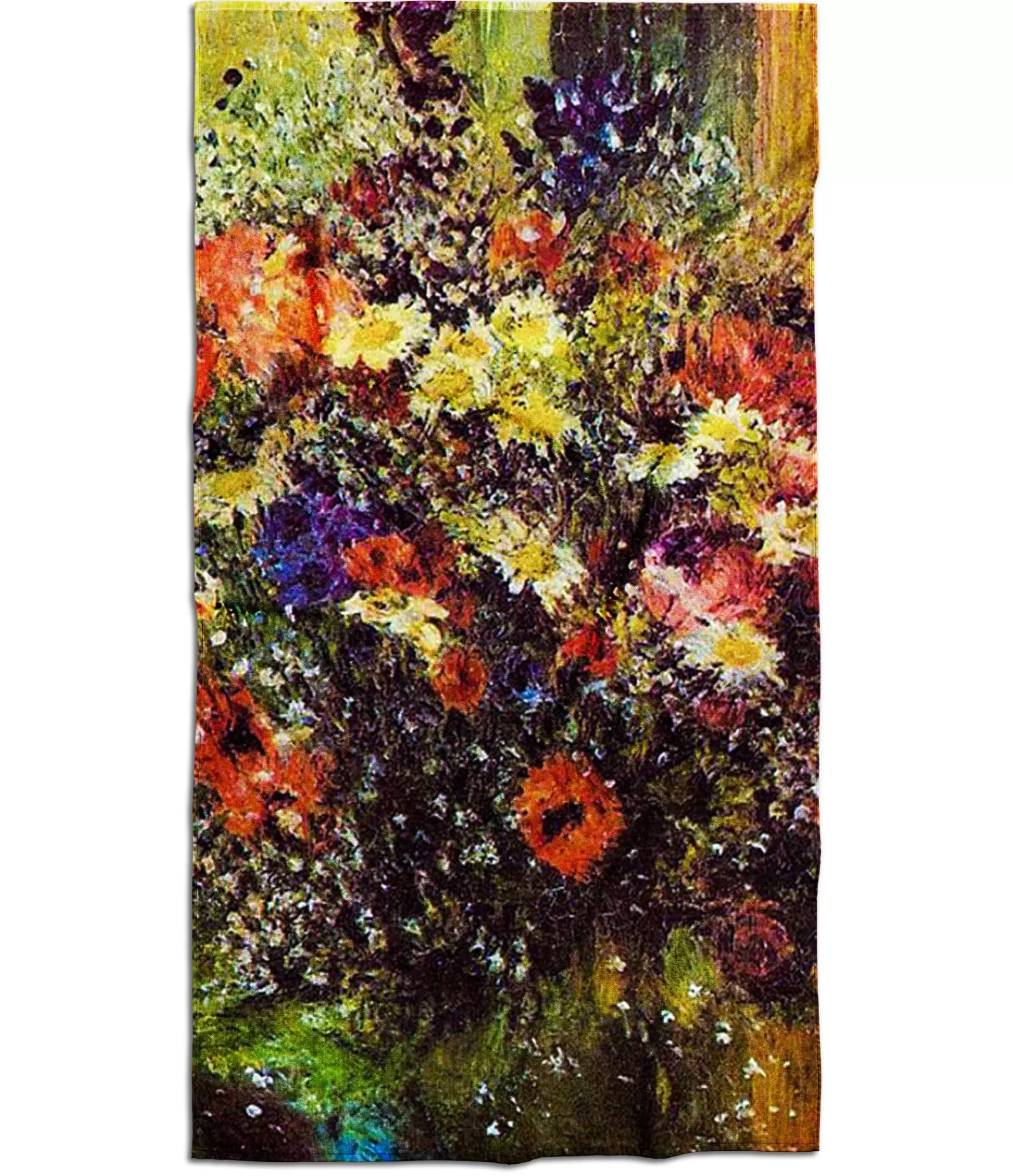 Kad skatāties uz švannas istabuš, ir grūti atšķirt, vai rokās ir mājas tekstila izstrādājums vai miniatūra impresionista šeduvar. Ziedi te plūst kā dzīvi, saplūstot krāsu virpuļos, it kā tie būtu tikko ar velnišķīgu otas triepienu nokrāsoti. Gredzeni – no tumši sarkaniem un oranžiem līdz dzelteniem, baltiem, violetiem – steidzas kā sprāgstoša avota atspulgs, kuru Renuārs, šķiet, pārnesis nevis uz audeklu, bet gan uz ikdienišķu priekšmetu. Tas viss ir iegremdēts gaismā, kas iekļūst caur zaļajiem veģetācijas slāņiem, radot siltu, mājīgu atmosfēru. It kā jūs stāvētu pieš spogulis, kas atspoguļo ziedu pušķi – dzīvs, īsts, neierobežots, aicinošs ikdienas rītos ielaist skaistumu.