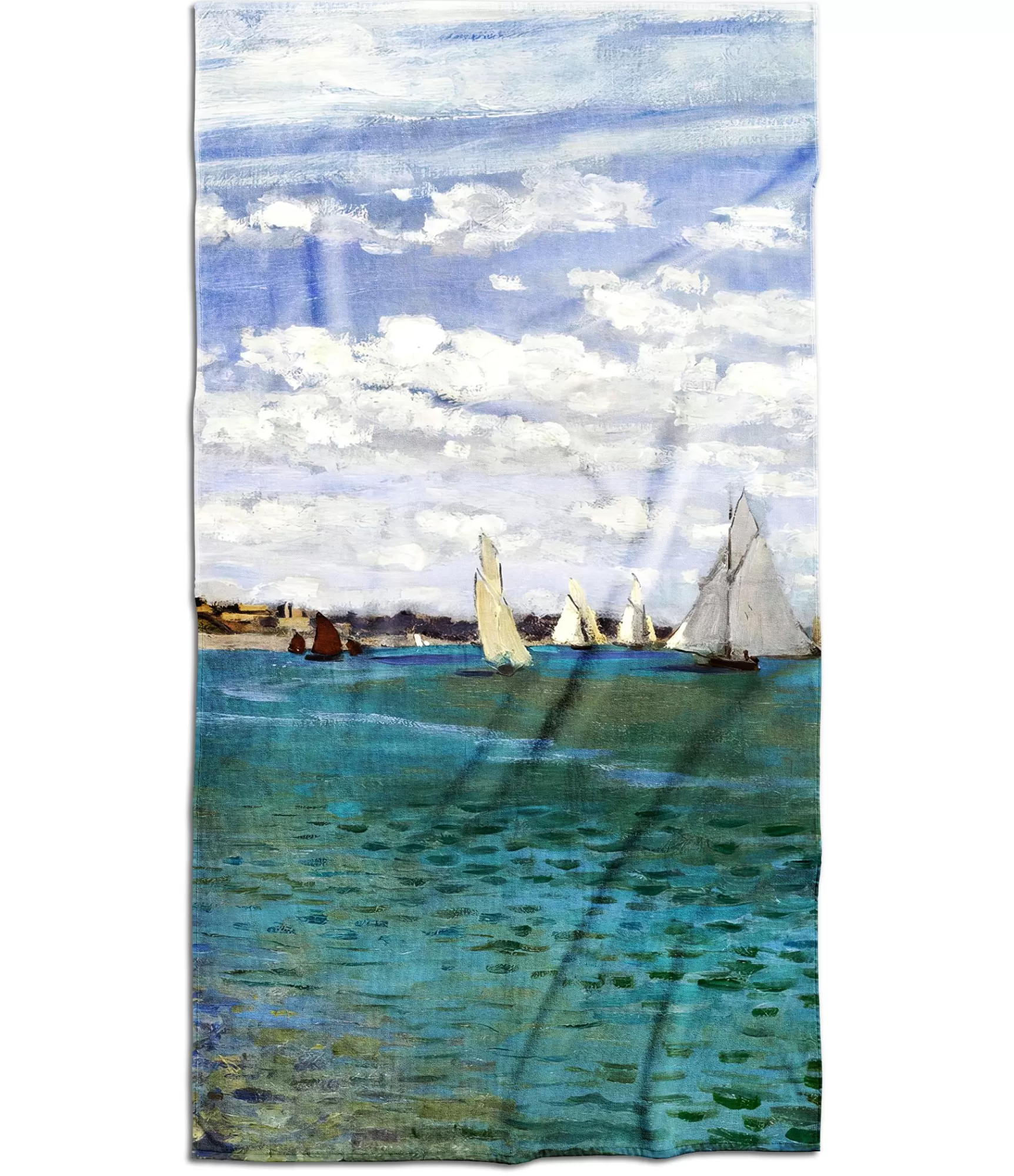 Virš buras peld pa debeszilu ūdeni, viegli, kā sapņi. Kloda Monē glezna „Regatta Sainte-Adrese“ kompozīcija uzreiz atklājas nevis uz audekla, bet gan uz velnišķīgā un funkcionālā pludmales dvieļa. Šeit satiekas jūra un māksla, krāsas un forma, relaksācija un estētika. Iedomājieties sevi škādu dienu uz š rokasš– guļus, lai vērotu, kā mākslas darbs kļūst par ikdienas sastāvdaļu. Monē gaismas piepildītā palete uzpeld uz tekstila virsmas, ļaujot burtiski iegremdēties impresionisma atmosfērā.