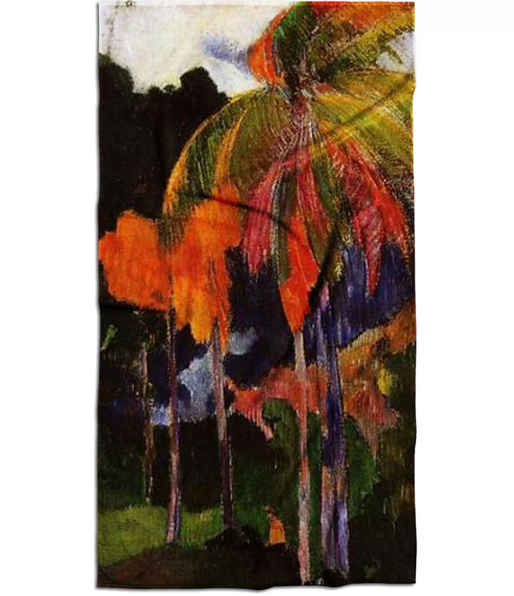 Šir rokašluostis – šī ir Pola Gogēna glezna „Patiesības mirklis I“ interpretācija tekstilā, kas aicina ne tikai pagulēt zem saules, bet arī sajust mākslu uz savas ādas. Tajā savijas sulīgi zaļas tropiskās zāles apakšpuses, graciozas purpursarkanās palmas, liesmojoši apelsīni un sarkanie toņi, kas izbalināt līdz intensīvi rozā un tumši dzeltenā krāsā. To visu pastiprina miš tumši zilās šešs un melnās kontūras, radot dziļu kontrastu un aicinot jūs noslēpumainā tropu pasaulē. Krāsas kompozīcijā ir ne tikai mākslinieka otas žests, bet arī emocionālā izteiksme – piemēram, atvaļinājuma atmiņas, kuras vēlaties saglabāt ilgu laiku.