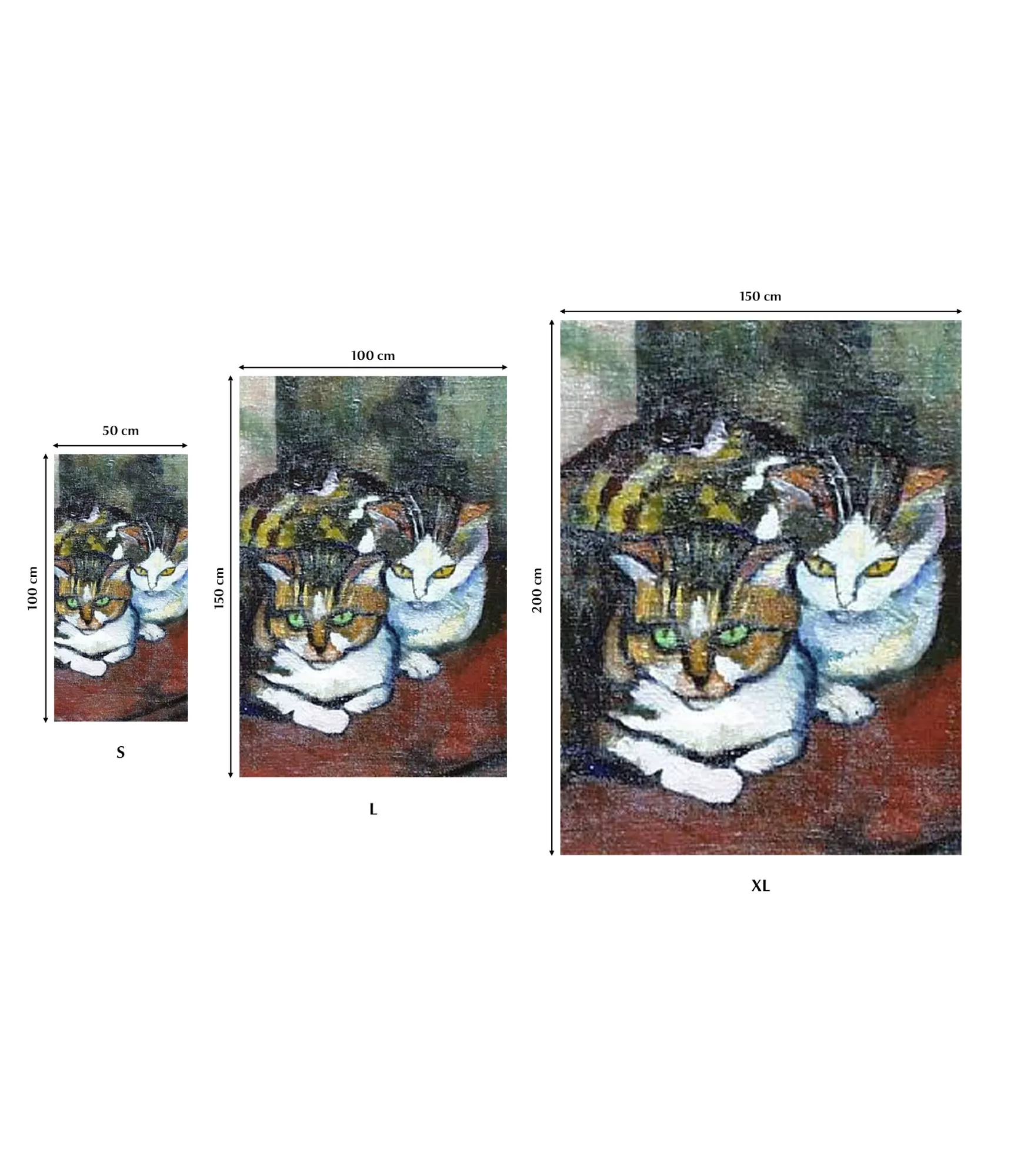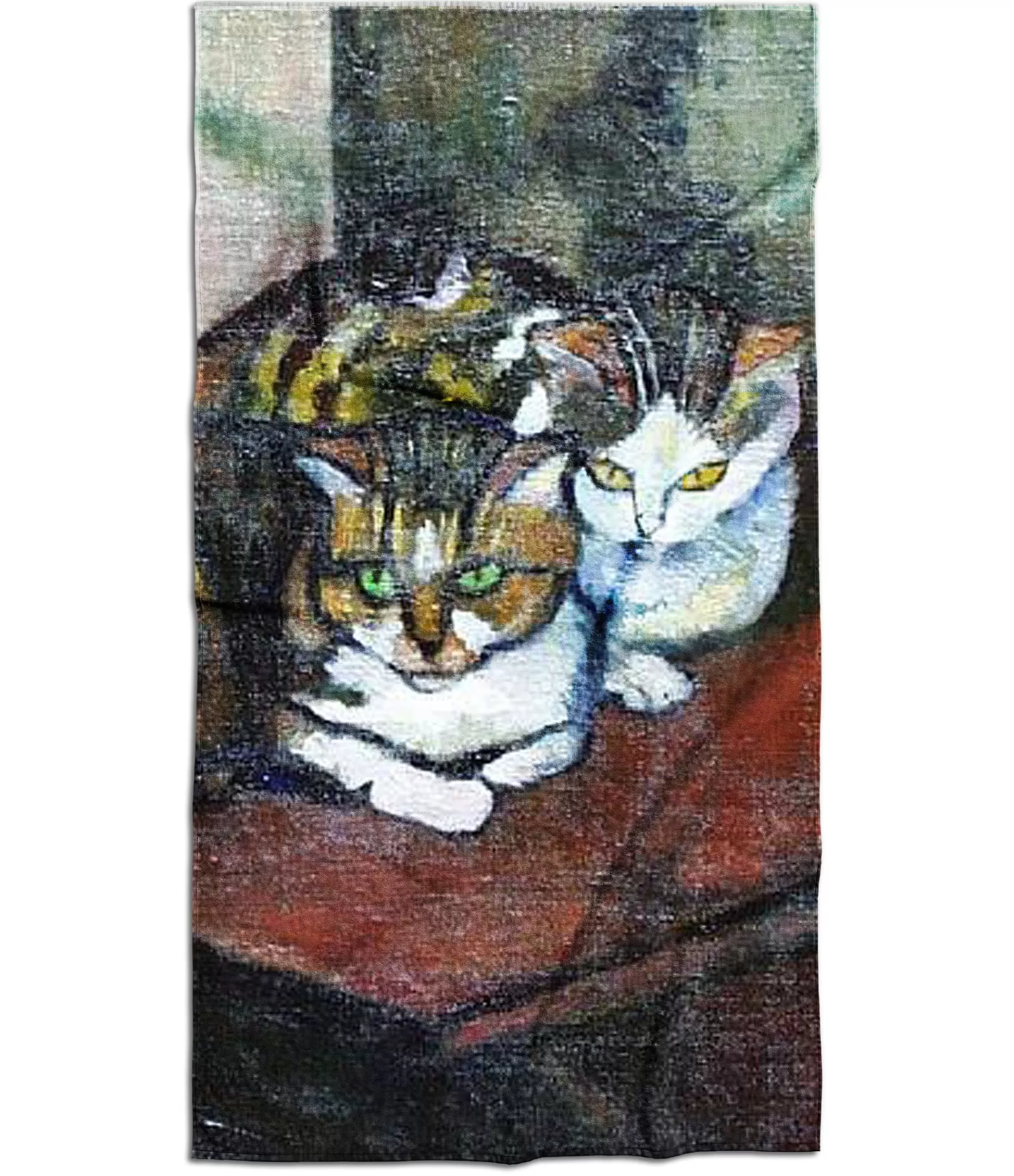 Divi kaķi, kurus iš no pirmā acu uzmetiena viņi izskatās mierīgi, bet viņu acīm ir raksturs. šis handšlosti nodod Sūzenas Valadonas gleznas motīvu – divi saspiedušies kaķi, kas tup uz tumšas virsmas, ko ieskauj velnišķīgas, asas krāsas. Viņu kažoks krāsots izteiksmīgi: viens košāks, brūni melns, otrs gaišāks, pelēkbalts. Ap tiem – dziļi šešs, brūni sarkani un tumši zaļi fona plankumi, kas rada iespaidu, ka viņi mūs vēro iš drošas vietas, kas nepārvietojas, bet ir gatavas jebkurā laikā uzlauzt.