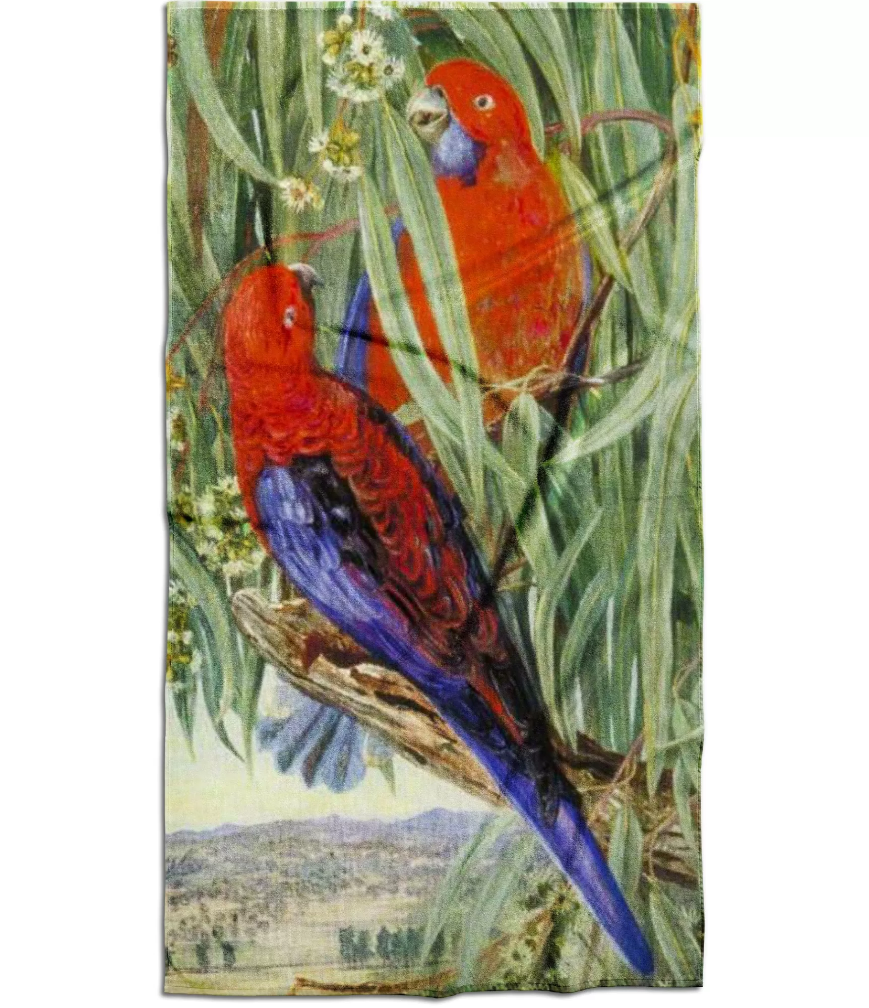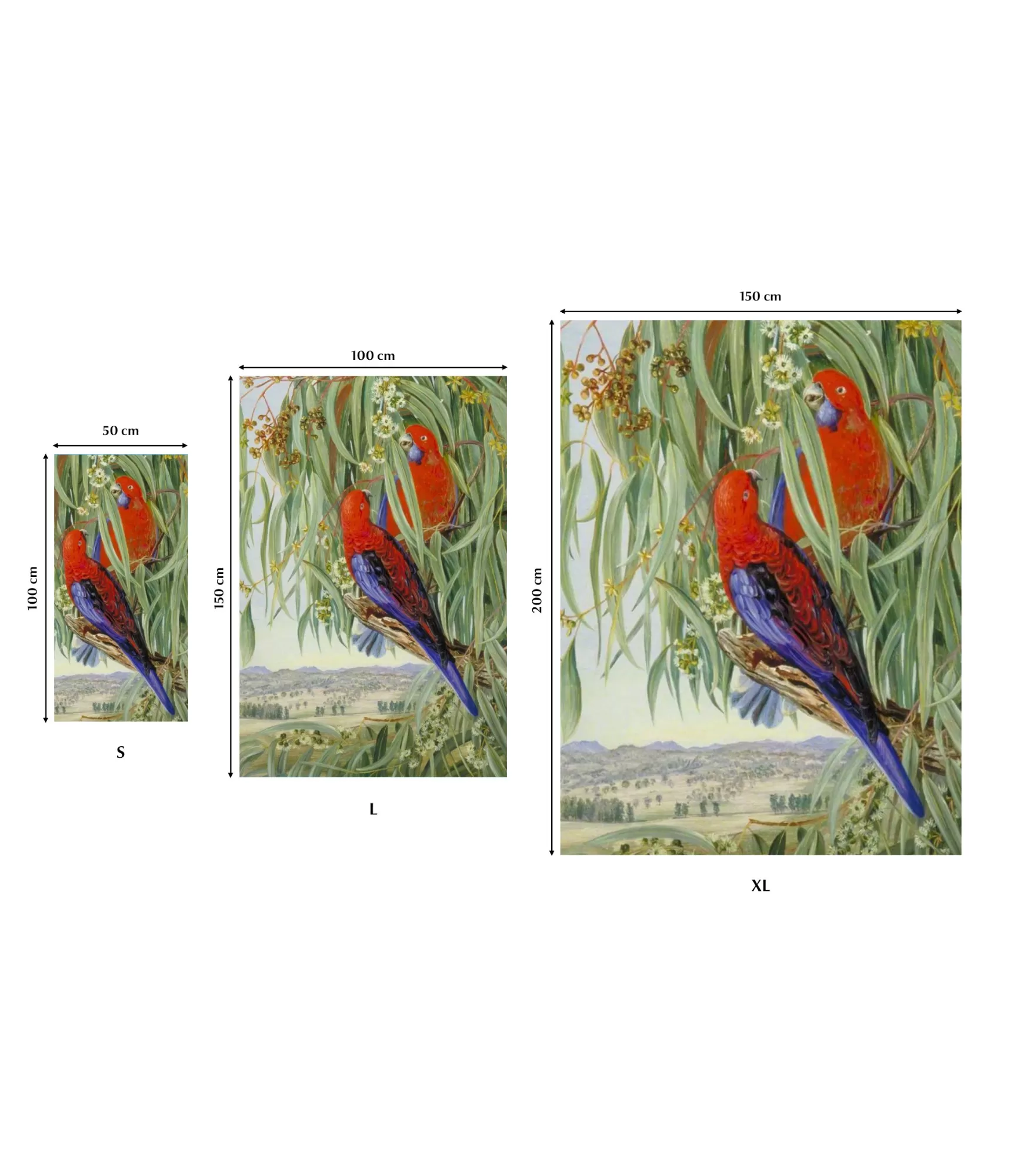 Spilgti sarkani papagaiļi, kas atrodas starp garām zaļām lapām, iš uzreiz piesaista uzmanību. Viens skatās taisni uz priekšu, otrs – šonu, it kā klausītos. Viņu spalvas ir bagātīgas: sarkanas, zilas un nedaudz melnas, spīdīgas un dzīvas. Fons ir pilns ar maziem augiem, ziediem un lapām, kas rada dabisku, nedaudz mežonīgu iespaidu. Šis handšlosti ir kā mazs džungļu gabaliņš, kas tapis 19. gadsimtā. dabas zinātnieces un mākslinieces Mariannas Nortas acs.