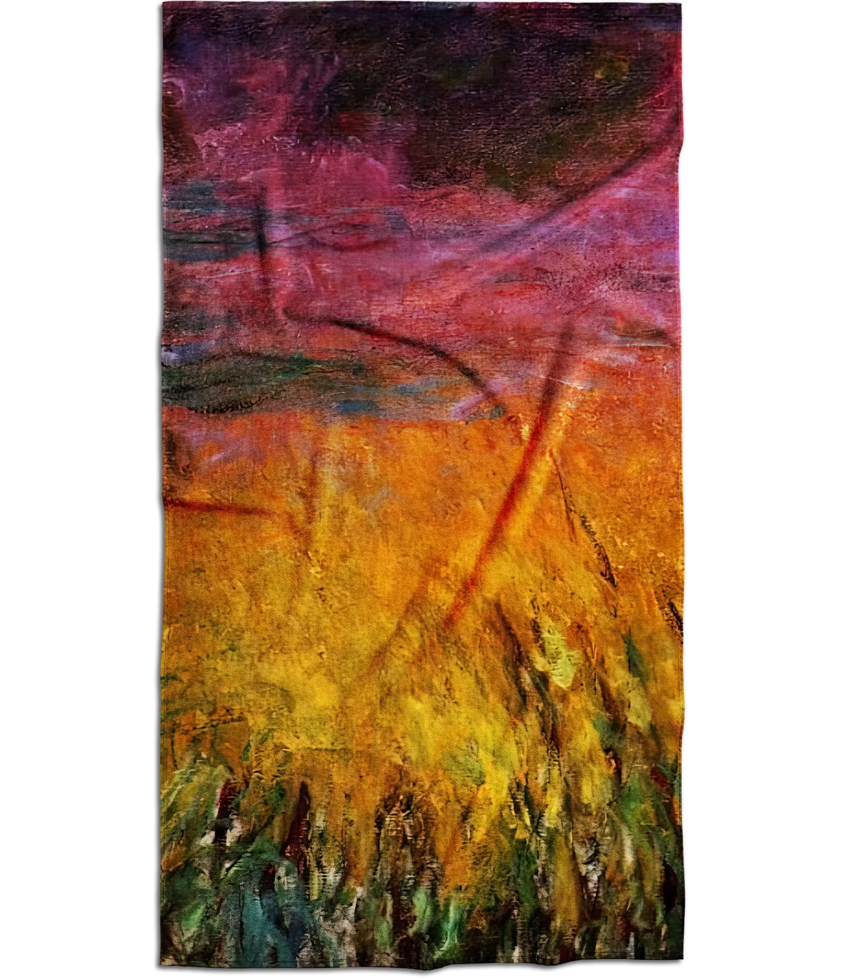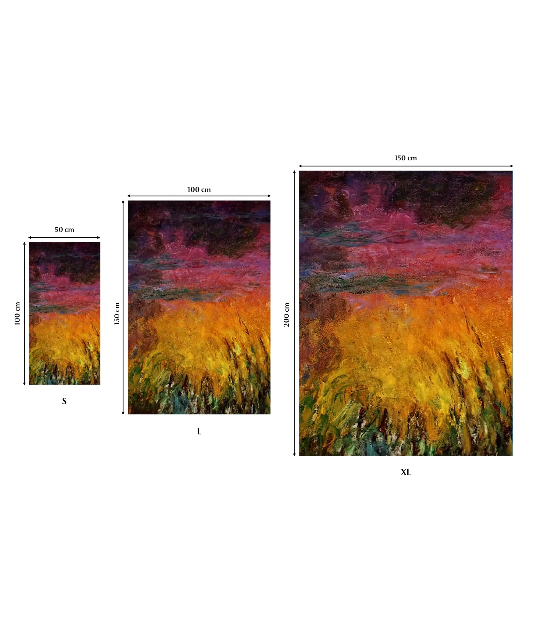 Saulriets špalmāšir piepildīts ar ugunīgi sarkanu krāsu, kas pārvēršas par lauku šapelsīnušilumu. Tas nav tikai ritenis, ko iedvesmojis mākslinieks – tā ir Monē gleznas būtība, kas pārvērsta tekstila sensācijā. Augšā ir tumšāki, intensīvi purpursarkani mākoņu slāņi, it kā būtu uznākusi vasarīga lietusgāze, un zem tiem, lejā – smacējoša dzelteni oranža saule šgaisma, kas rada sajūtu, ka vēl daži mirkļi – un šiluma pazudīs naktī. Apakšdaļā uzkrītošā zaļā ainava ir dzīva, it kā vējā šūpojoties, ar triepieniem, kas atgādina ar nazi uzklātu krāsu – drosmīgs, dzīvespriecīgs, gandrīz trīsdimensiju.