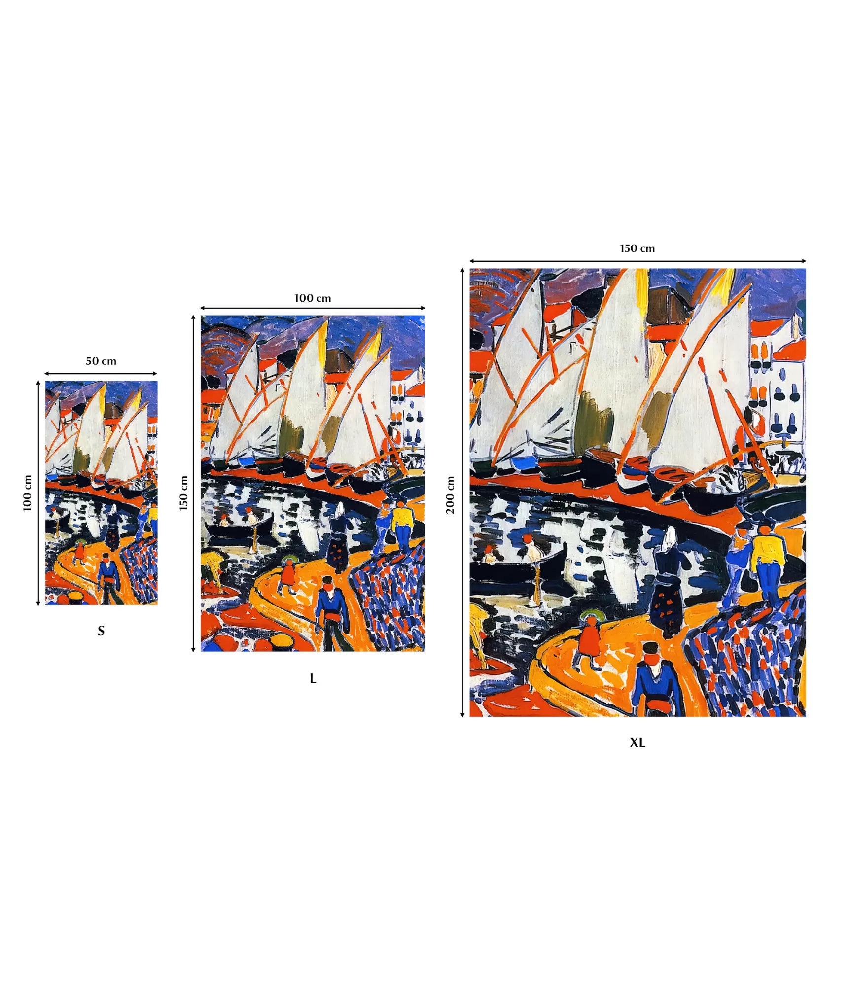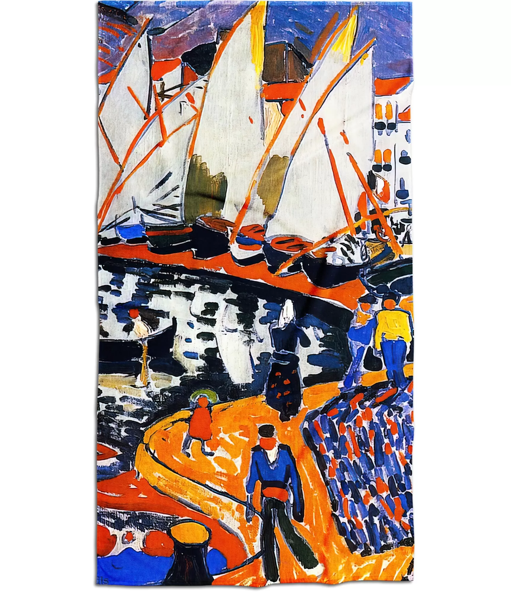 Šis rokašluostis – kā attēls, iš izstrādātsš Andrē Deraina audekls "Buru žāvēšana". Tiklīdz paskatās, jūsu uzmanību piesaista spilgtas krāsas – oranžas takas, zilas drēbes, balti kuģu buru trīsstūri, dzeltenas figūras un purpura ostas fona panorāma. Tas ir dvielis, kas ne tikai žāvē, bet arī aicina piedzīvot mākslu. Apdrukas puse ir piepildīta ar izteiksmīgu fovisma stilu, ar drosmīgi krāsotām figūrām un lielām krāsu plaknēm, kuru kontrasti rada kustības un darbības iespaidu. Ššajā dizainā – visa Derēna krāsu filozofija, kas tiek pausta tekstilizstrādājumos.
