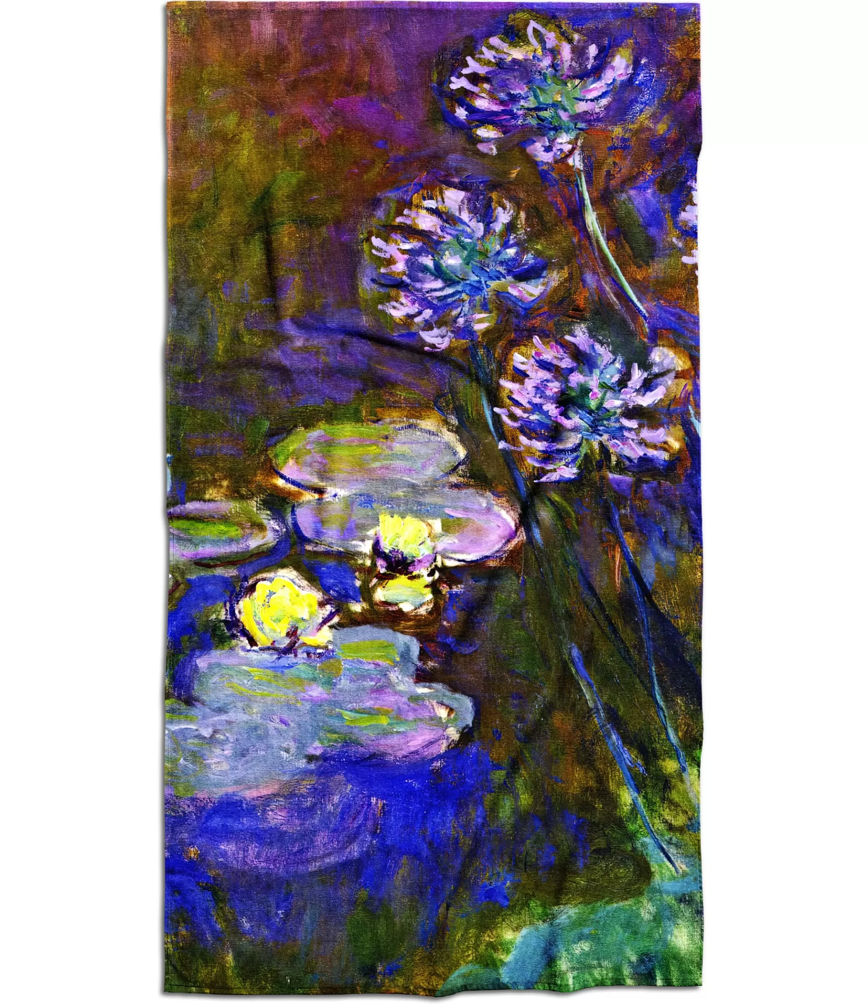 Kloda Monē glezna “Ūdensrozes” iedvesmots rokušklēps – tas ir kā elpojošs mākslas fragments, kas parādījās nevis uz audekla, bet uz auduma. Tas nav tikai aksesuārs, bet gan vizuāla dzeja, kurā saplūst ūdens, šgaisma un ziedēšana. Kompozīcijā dominē švelnišķīgi violeta un zili zaļa krāsa – šķiet, ka tie ieplūst viens otrā, kā Monē sitieni, kas nekad nav stingri vai noteikti. Spilgti rozā atspīdumi spēlējas starp ūdens virsmām un veģetāciju, un lilijas izskatās kā mazas sveces uz klusi plūstošās virsmas. Visa aina ir iespaidu pilna – nevis konkrētībā, bet noskaņojumā. Nevis pēc rindiņām, bet pēc š Tas ir dizains, kas neklusē – viņš klusi runā par skaistumu.