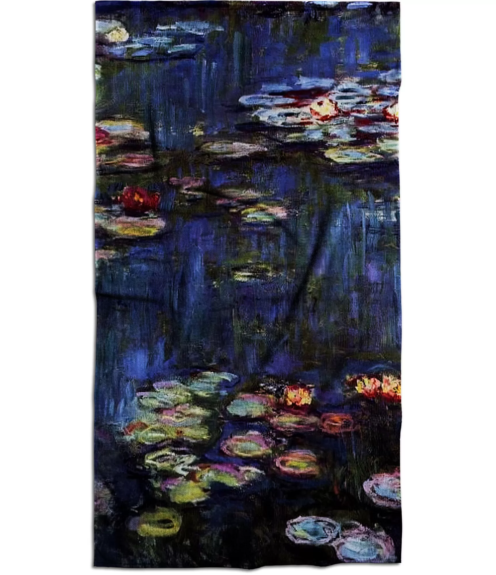 It kā klusā ūdens virsma būtu kļuvusi par audumu – Šajos vannas dvieļos iemūžinātas Kloda Monē “Ūdensrozes”. pasaule aicina uz mirkli apstāties. Dziļi violetie toņi pāriet zilos un zaļos triepienos, radot iespaidu, ka mēs skatāmies uz dzīvo, mainīgu ūdeni. Daudzkrāsainas lilijas – no š gaiši rozā līdz tumši sarkanai – išnira iš tumši virpuļi kā sapņi, kas peld starp gaismu un tumsu. Šes nospiežu sānu – tas ir mākslas darbs, kurā uz auduma glabājas visa impresionisma burvība: sekla, bet emociju, dzīvības un dziļuma pilns.