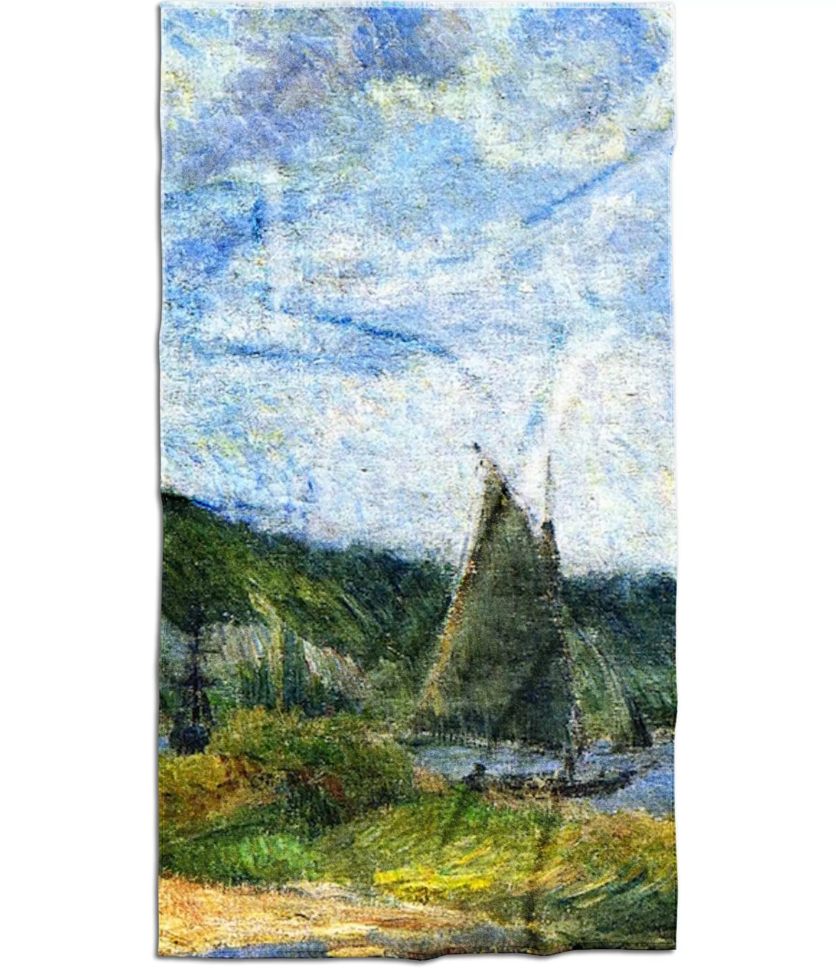 Galvenajā pusē, dekorēta ar apdruku, š impresionisma krāsas saplūst kā ellē: zilgana, zaļa, zeltaini dzeltena. Iespiestā daļa – tas ir 100% poliesters, kas ļauj attēlam palikt spilgtam un skaidram. Otra, baltā puse ir izgatavota iš 100% kokvilna – cilpa, lieliska ūdens absorbcija, mīksts uz tausti. Roku balsts ir funkcionāls un estētisks, lieliski piemērots pludmalē, saulainos ceļojumos vai pat vannas istabā mājās. Pat pakārts, tas atgādina mākslas darbu, kas ienes jūsu ikdienas dzīvē krāsas un mieru.