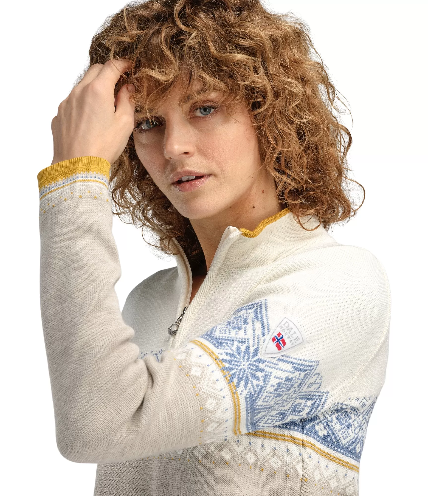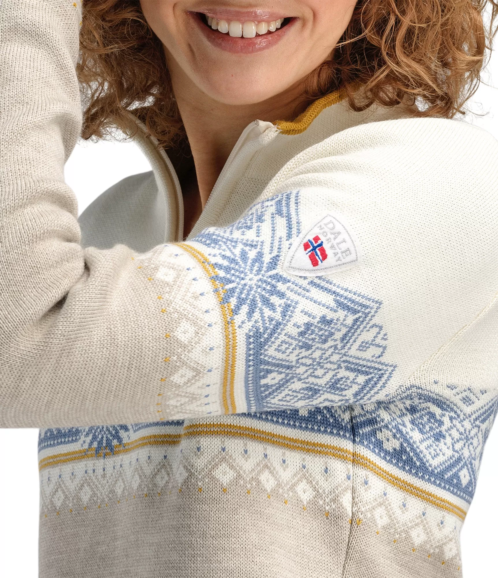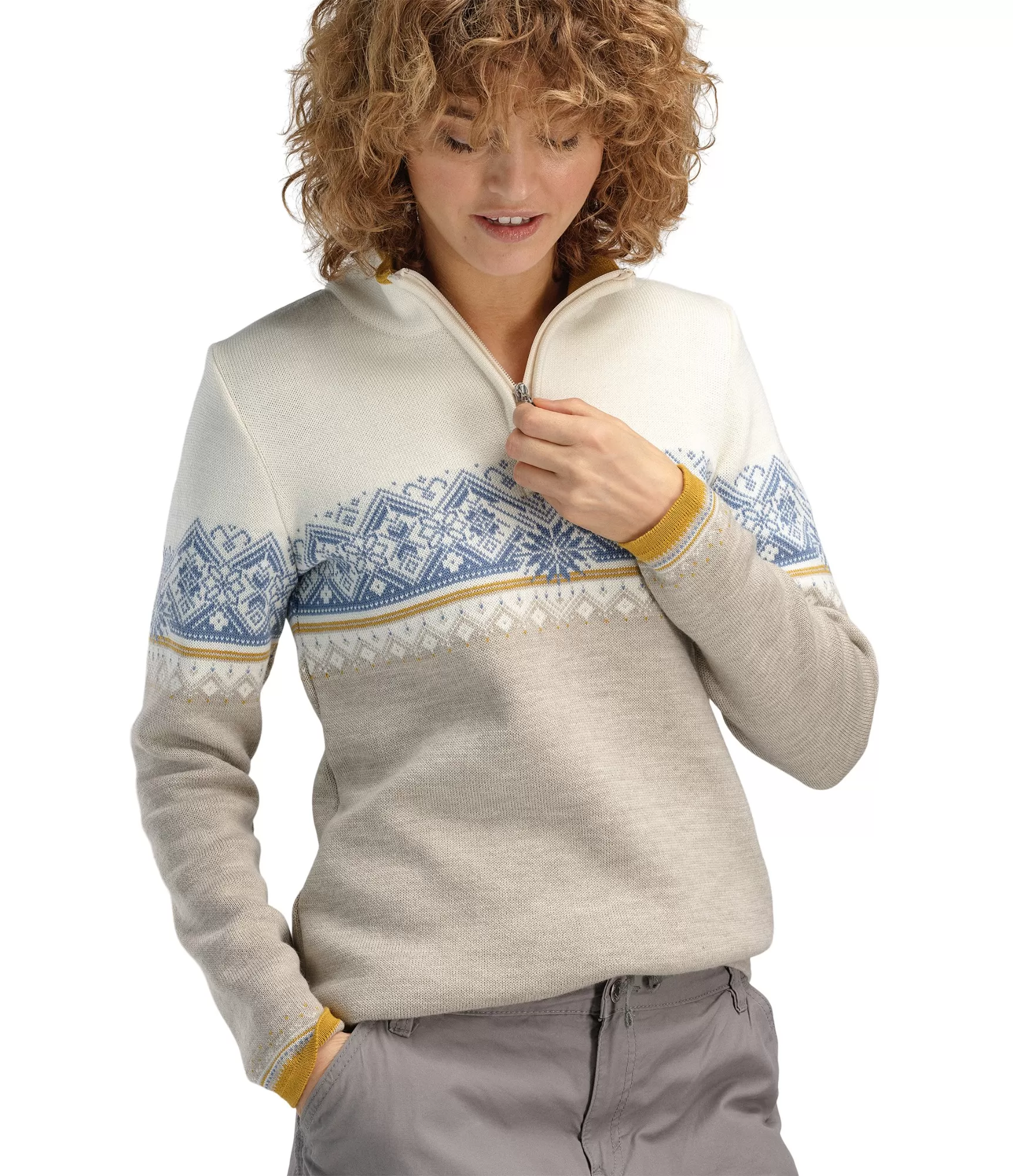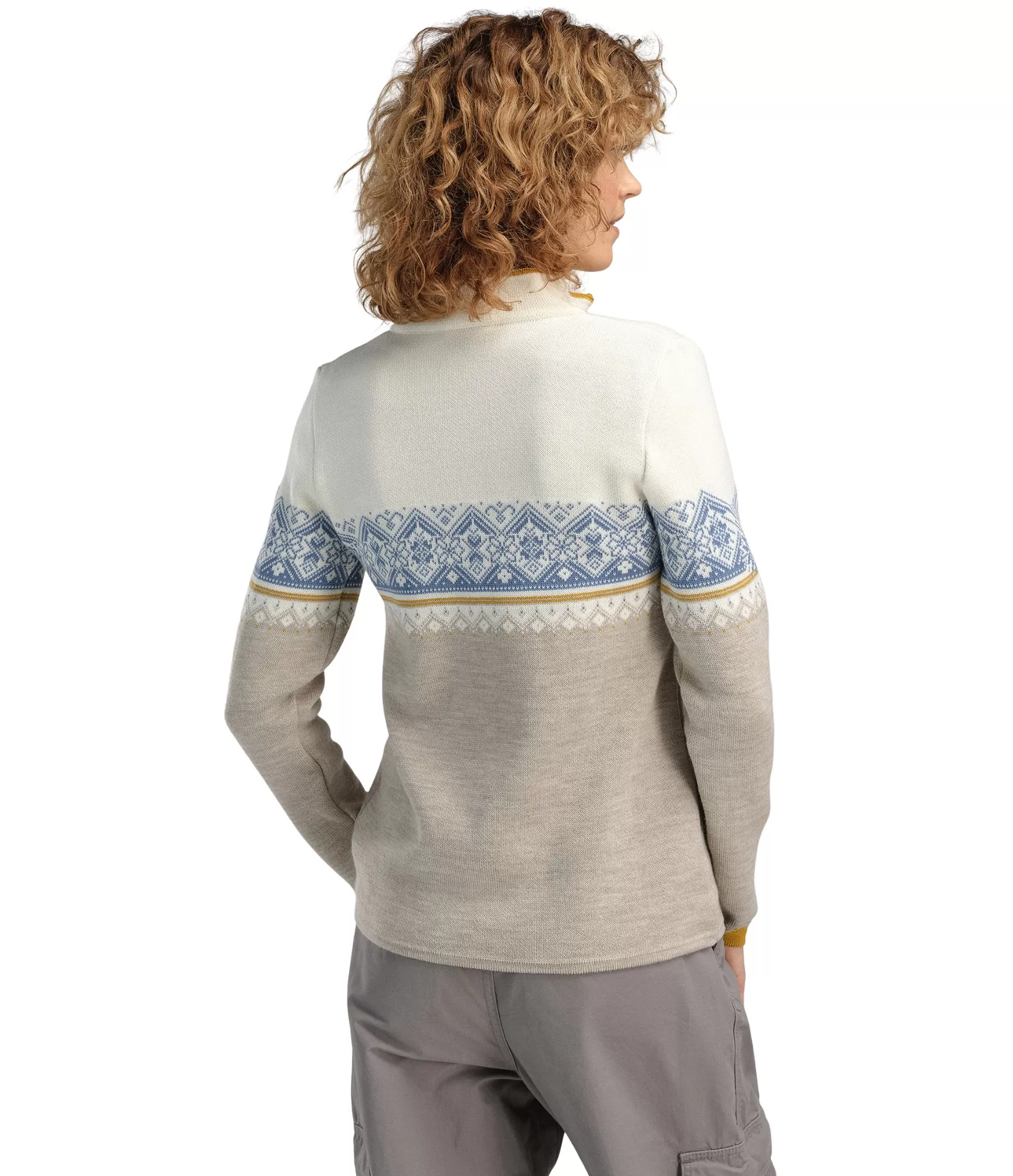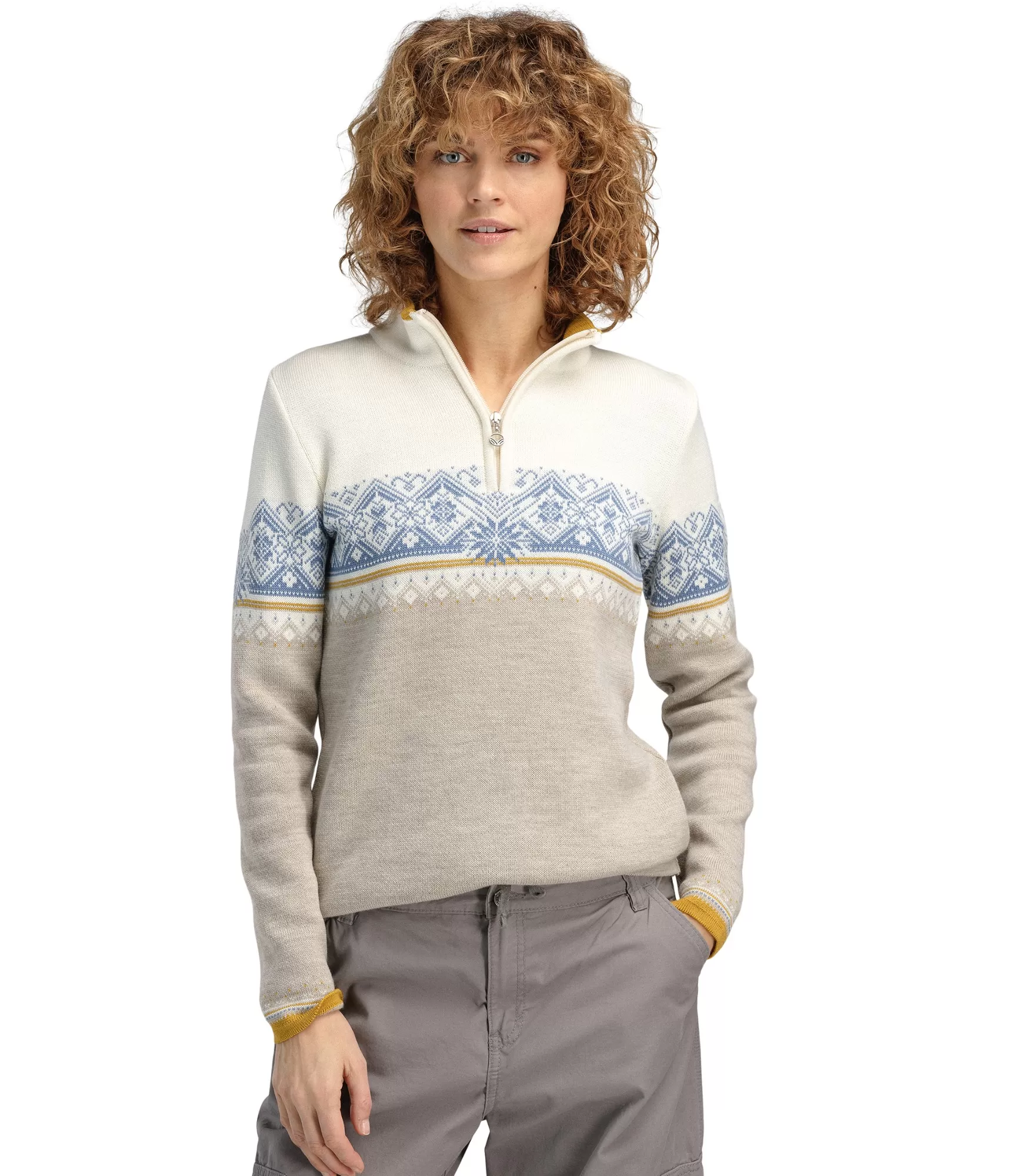 Stilīgs sieviešu džemperis no merino vilnas Dale of Norway Sand Offwhite Blueshadow. Praktiska izvēle.