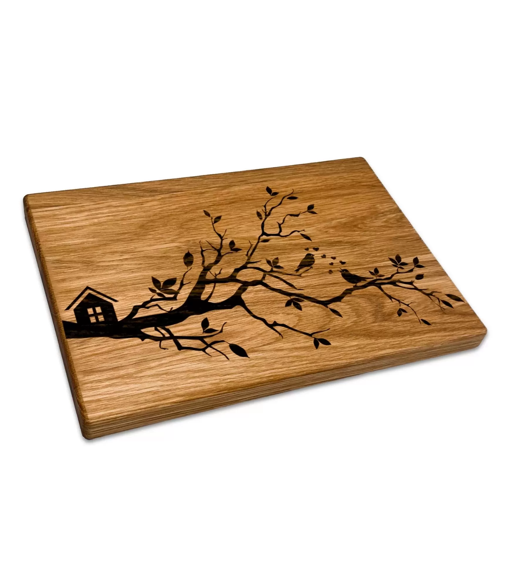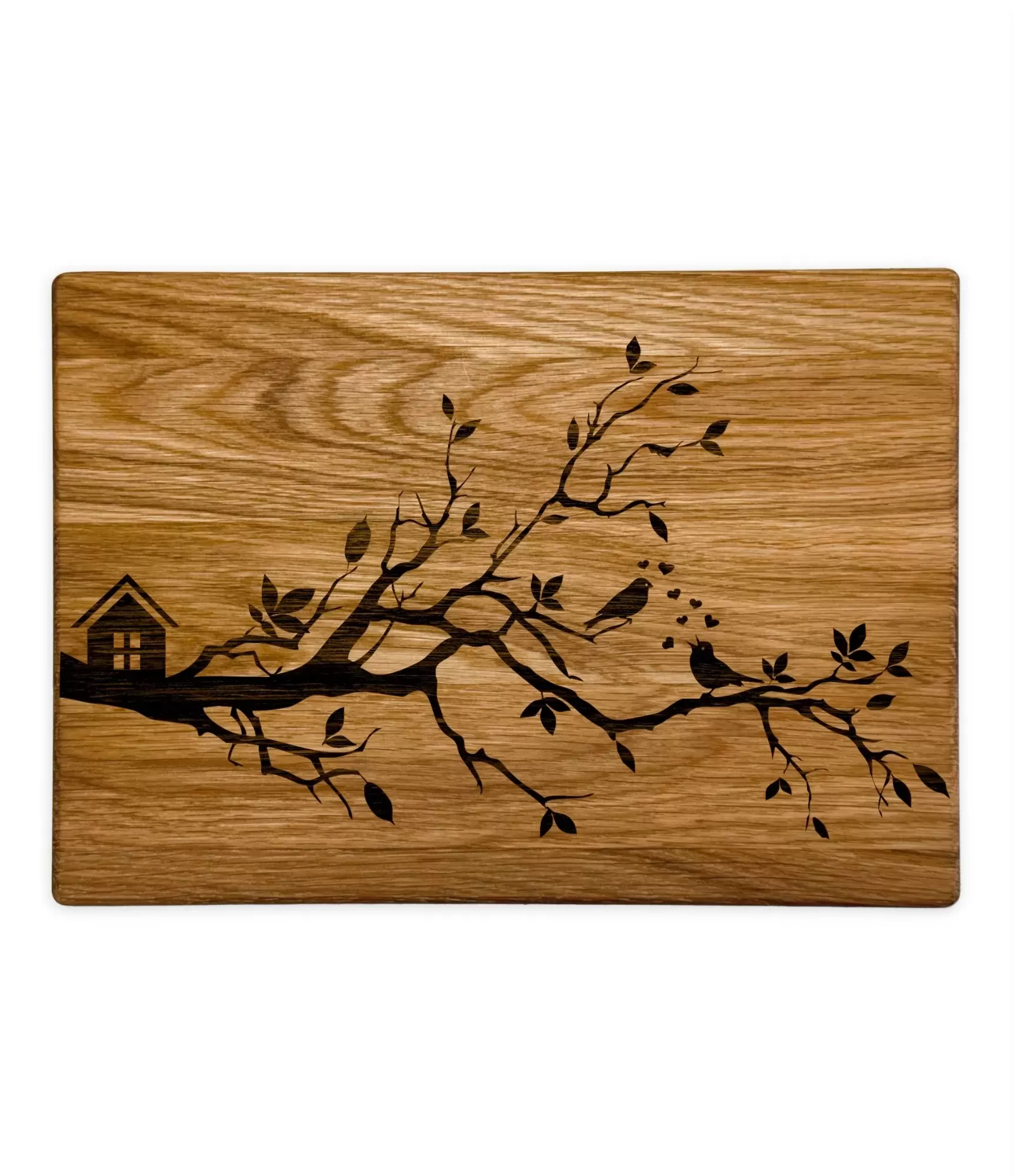 Gravētais griešanas dēlis "Happiness Tree CB-26P4" izceļas ar smalku koka un putnu motīvu, ko papildina neliels mājas elements, kas simbolizē mājīgumu un ģimenes siltumu. Uz zariem sēdošie putni un niansētas sirds detaļas veido harmonisku kopskatu, piešķirot produktam īpašu raksturu. Tas ir stilīgs virtuves akcents, kas papildina interjeru un piešķir tam dzīvīgumu. Dēli var izmantot no vienas puses ēdiena gatavošanai, bet no otras – uzkodām.