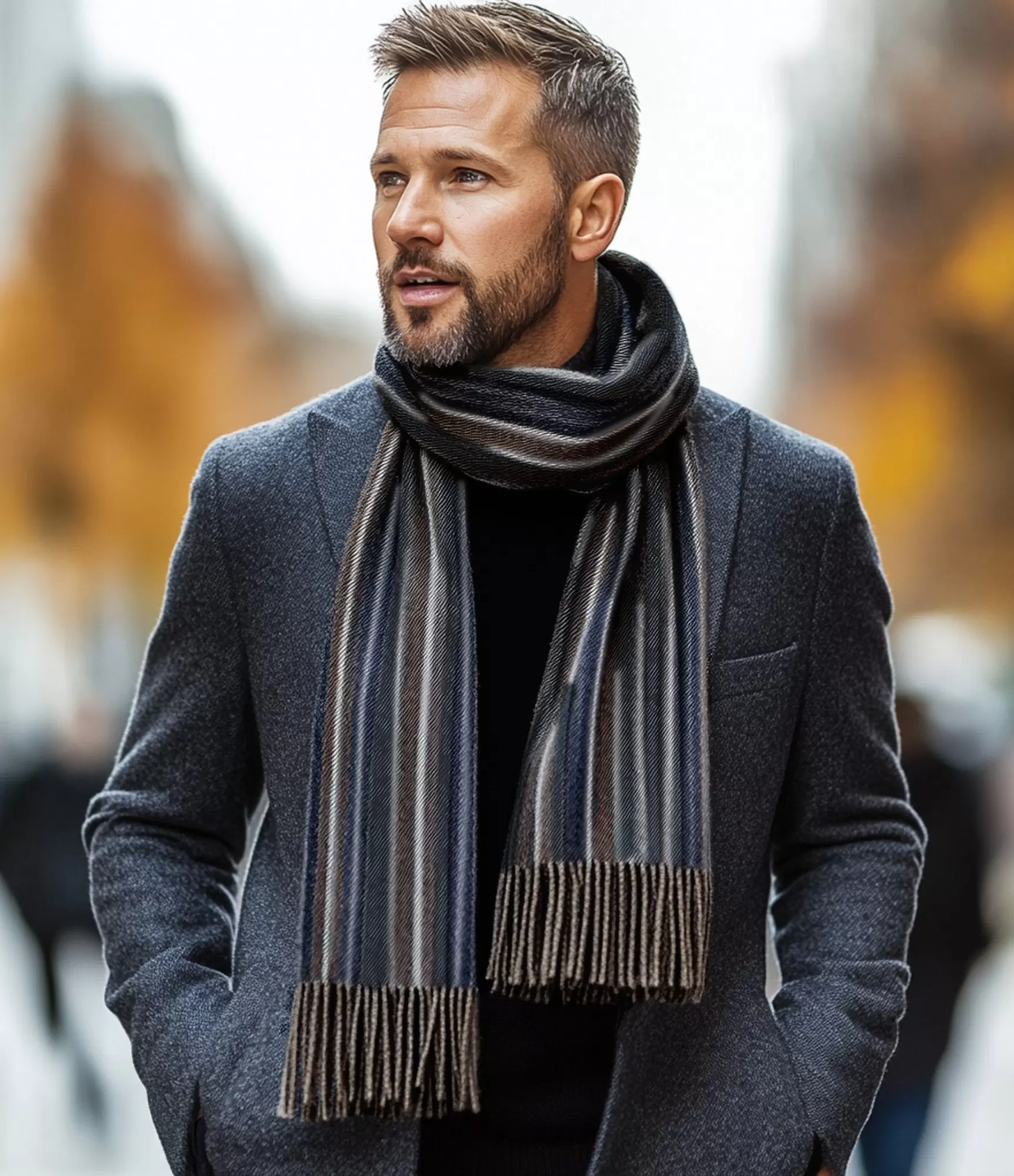 Krāsu kombinācija ir izvēlēta tā, lai labi saderētu ar galvenajiem vīriešu virsdrēbju toņiem. Šalle lieliski izskatās pie tumši zila vai grafīta mēteļa, melnas vai tumši pelēkas jakas, tāpat harmoniski sader ar gaišākiem pelēkajiem vai brūnās gammas virsdrēbēm. Tā ir ideāla izvēle rudenim, ziemai un agram pavasarim, kad vēlas saglabāt skaidru, modernu siluetu bez pārāk spožiem kontrastiem. Vertikālās svītras vizuāli pagarina augumu, padarot aksesuāru kārtīgu un stilīgu neatkarīgi no tērpa.