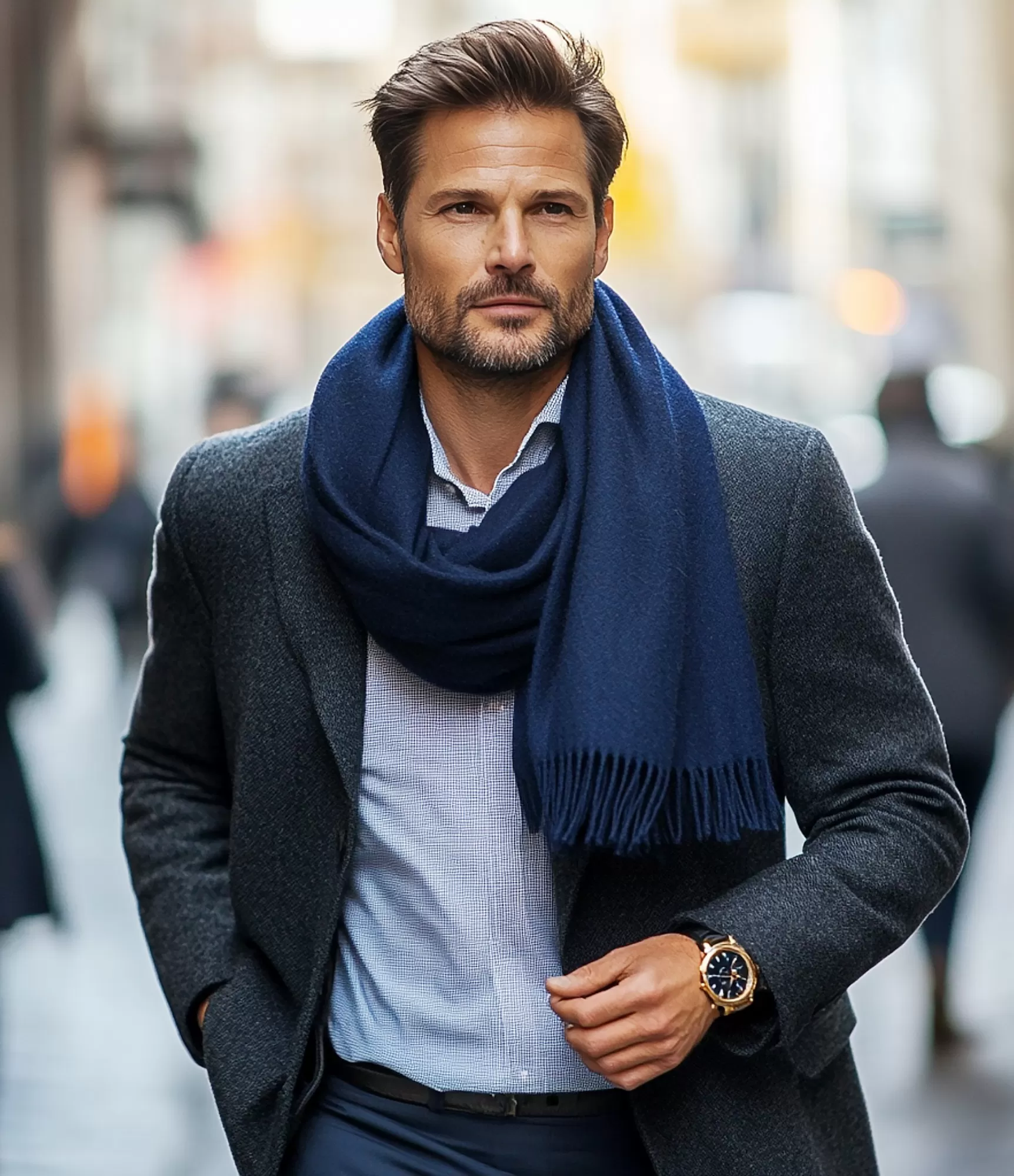 Tumši zilā „Navy Blue“ krāsa ir viena no universālākajām un uzticamākajām izvēlēm mūsdienu vīrieša garderobē. Tā ir nokrāsa, kas saglabā aktualitāti neatkarīgi no sezonas un piešķir tēlam kārtību, stabilitāti un eleganci. Šī baby alpaca šalle, pateicoties dziļajam tumši zilajam tonim, izskatās moderna, tīra un profesionāla. Tā ir krāsa vīrietim, kurš novērtē skaidru stila līniju un izvēlas aksesuārus, kas papildina, nevis noslogo koptēlu. Šalle lieliski sader ar tumšu vilnas mēteli, grafīta vai pelēkiem virsdrēbēm, bet ar smilšu un gaiši brūniem toņiem tā veido īpaši izteiksmīgu kontrastu. Šis zilais tonis piestāv gan klasiskam, gan modernam minimālismam — tas nav pārlieku spilgts, bet pietiekami izteiksmīgs, lai saglabātu stilīgu līdzsvaru.