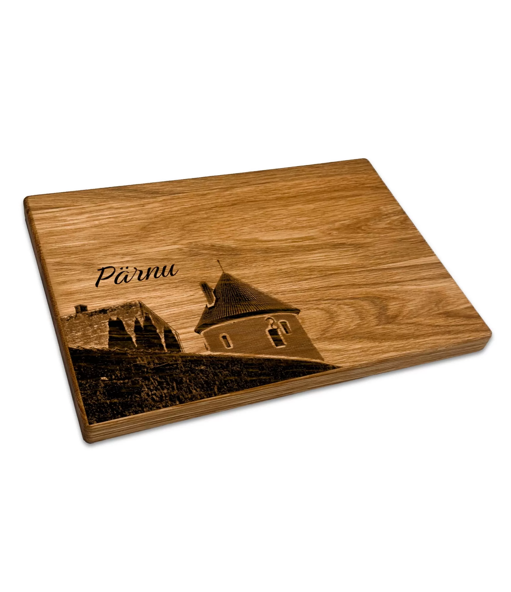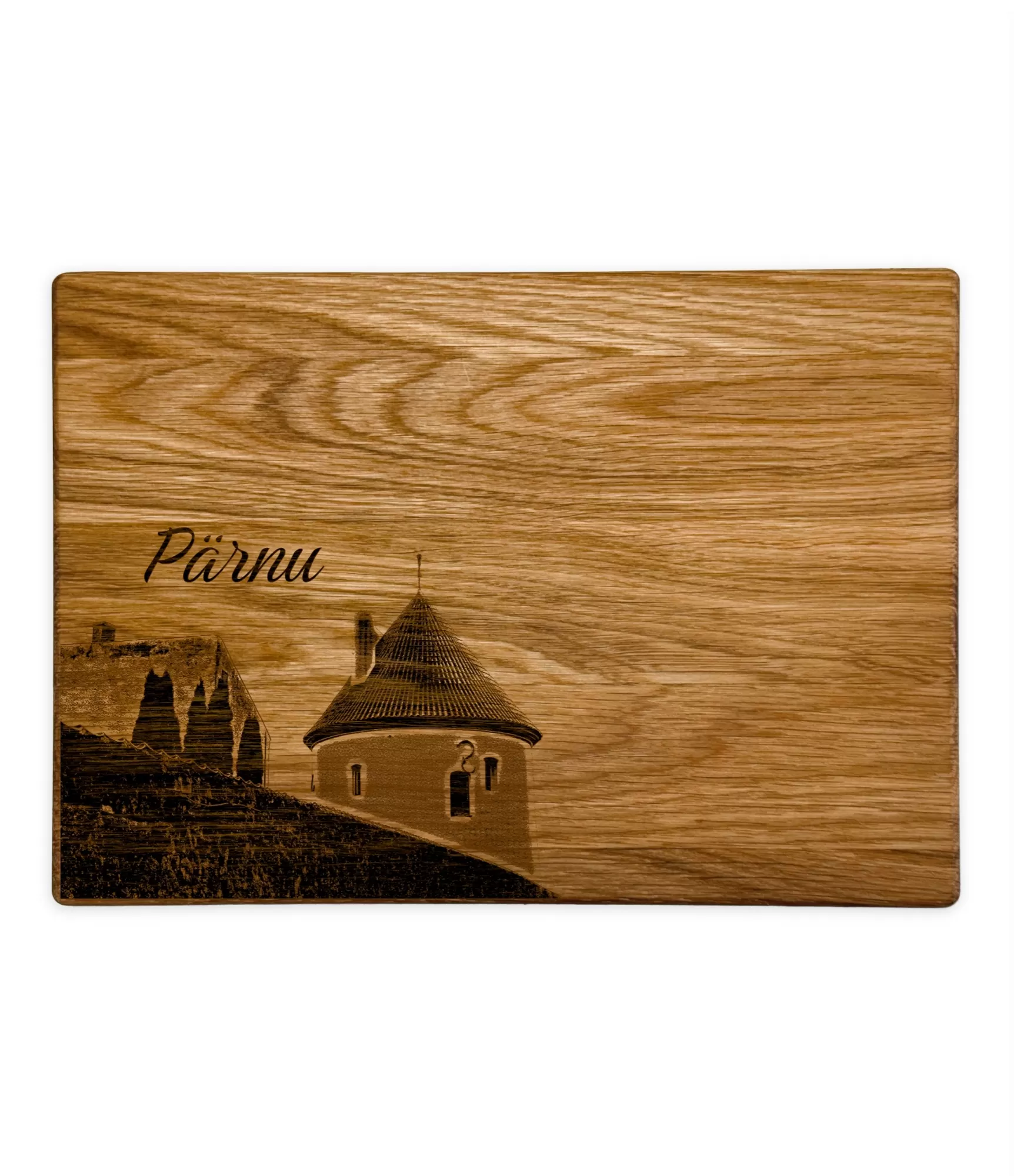 Koka griešanas dēlis "Igaunijas pilsētas Pärnu CB-2660" ir stilīgs produkts, kas atspoguļo vecā Pärnu pils motīvu. Rūpīgā gravēšana piešķir šim virtuves piederumam estētisku integritāti un ilgtspējīgu vērtību, padarot to ne tikai par praktisku rīku, bet arī par mājīgu mājas akcentu. Tas ir ideāls izvēle stilīgai ēdiena pasniegšanai mājās vai ceļojot.