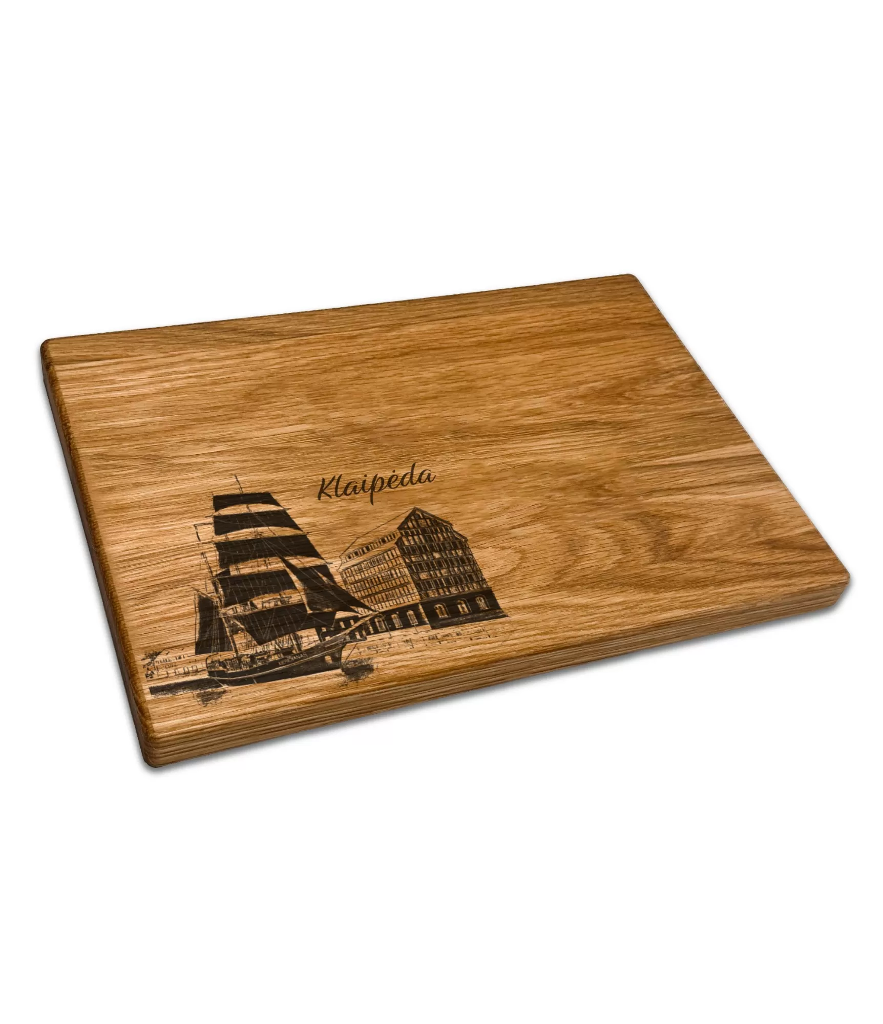 Griešanas dēlis "Lietuvas pilsētas Klaipēda CB-2617" iemūžina unikālo piekrastes garu un vieglumu. Dizains ar burājošu laivu un Klaipēdas arhitektūras fragmentiem, kā arī uzraksts "Klaipėda", rada jūras, vēja un ostas pilsētas dzīves sajūtu. Tas nav tikai griešanas dēlis, bet arī interjera elements, kas piešķir svaiguma, ceļojumu noskaņu un tuvumu dabai virtuvē.