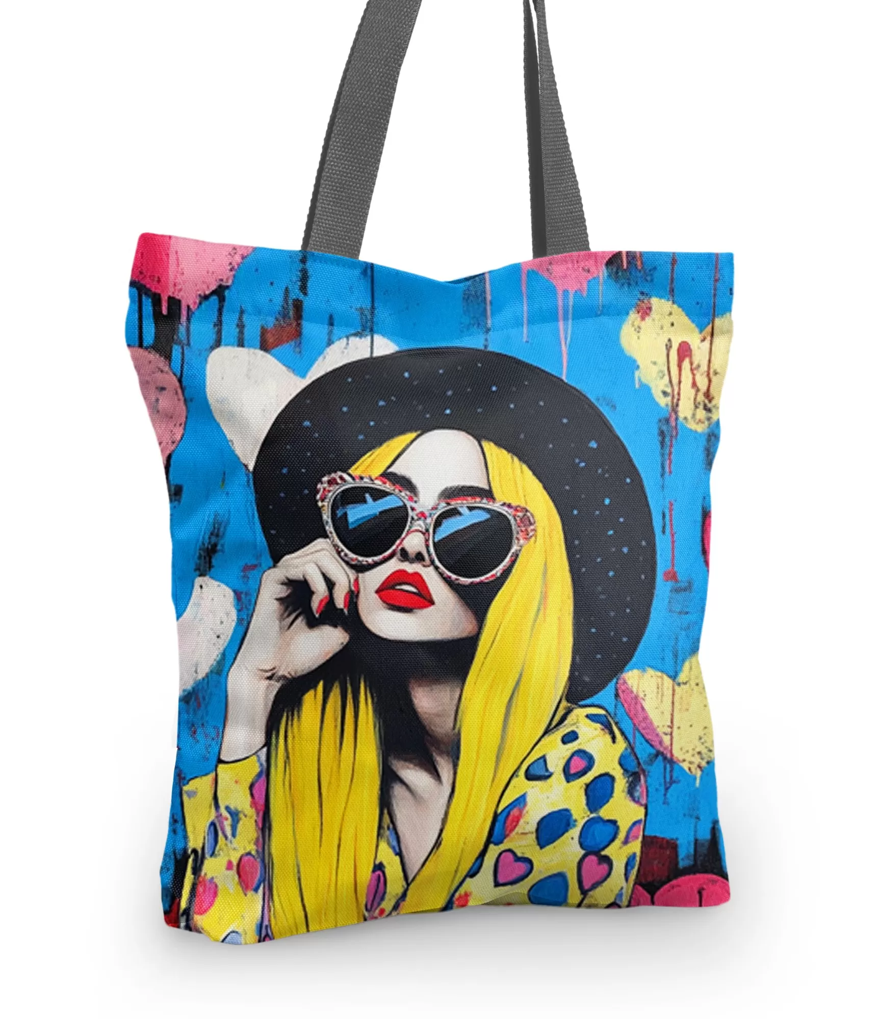 Kāda ir rokassomiņa, kas nepaliks nepamanīta? Šir modelis – īsta stila bumba! Spilgta, grafiska, kontrastējoša bilde ar dzeltenmatainu meiteni, sarkanām lūpām un saulesbrillēm iedvesmo drosmi, vasarīgu noskaņu un neierobežotu enerģiju. Tas ir ne tikai aksesuārs, bet arī māksliniecisks paziņojums, kas priecē katru dienu.