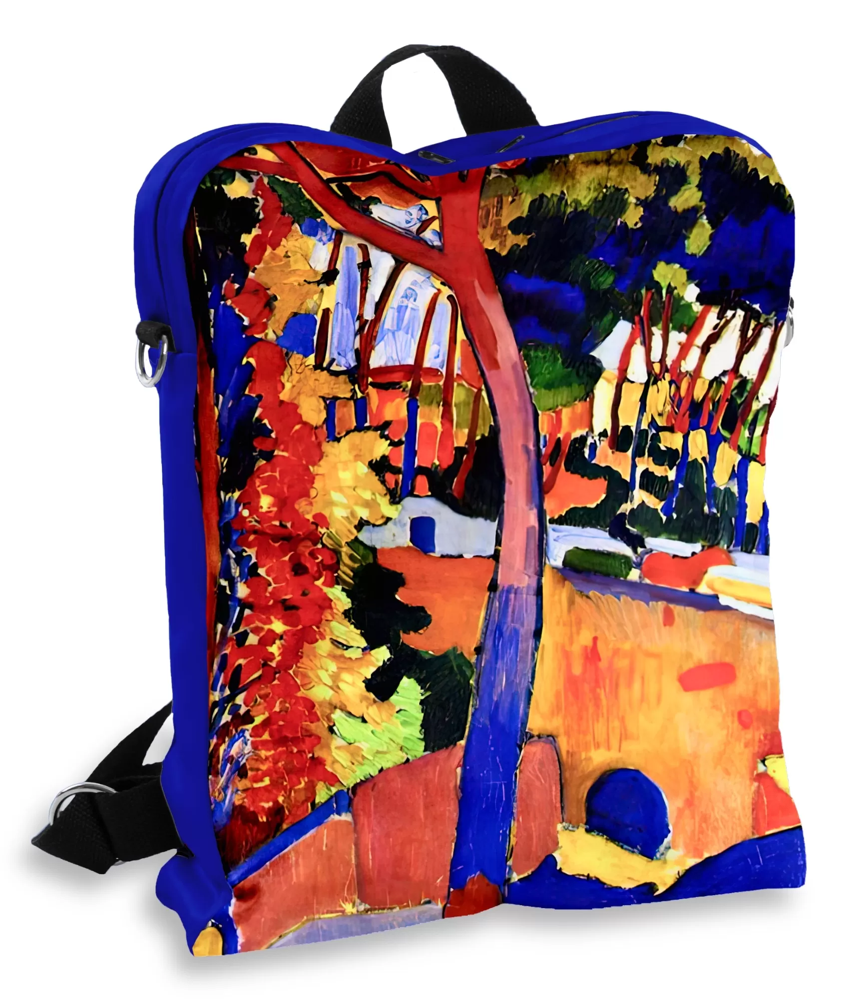 Uz mugursomas ir uzrakstīta Dereinas ainava – tas nav tikai skats, tā ir sajūta. Spilgti rozā un oranži pakalni, zilas debesis, tumši koku silueti – viss pulsē ar rūgtumu, siltumu, intensitāti. Ši krāsu simfonija nevis kopē dabu, bet gan interpretē to – kā vislabāk veicās fovisma meistariem. Un tagad šir ainava – daļa no jūsu stila.