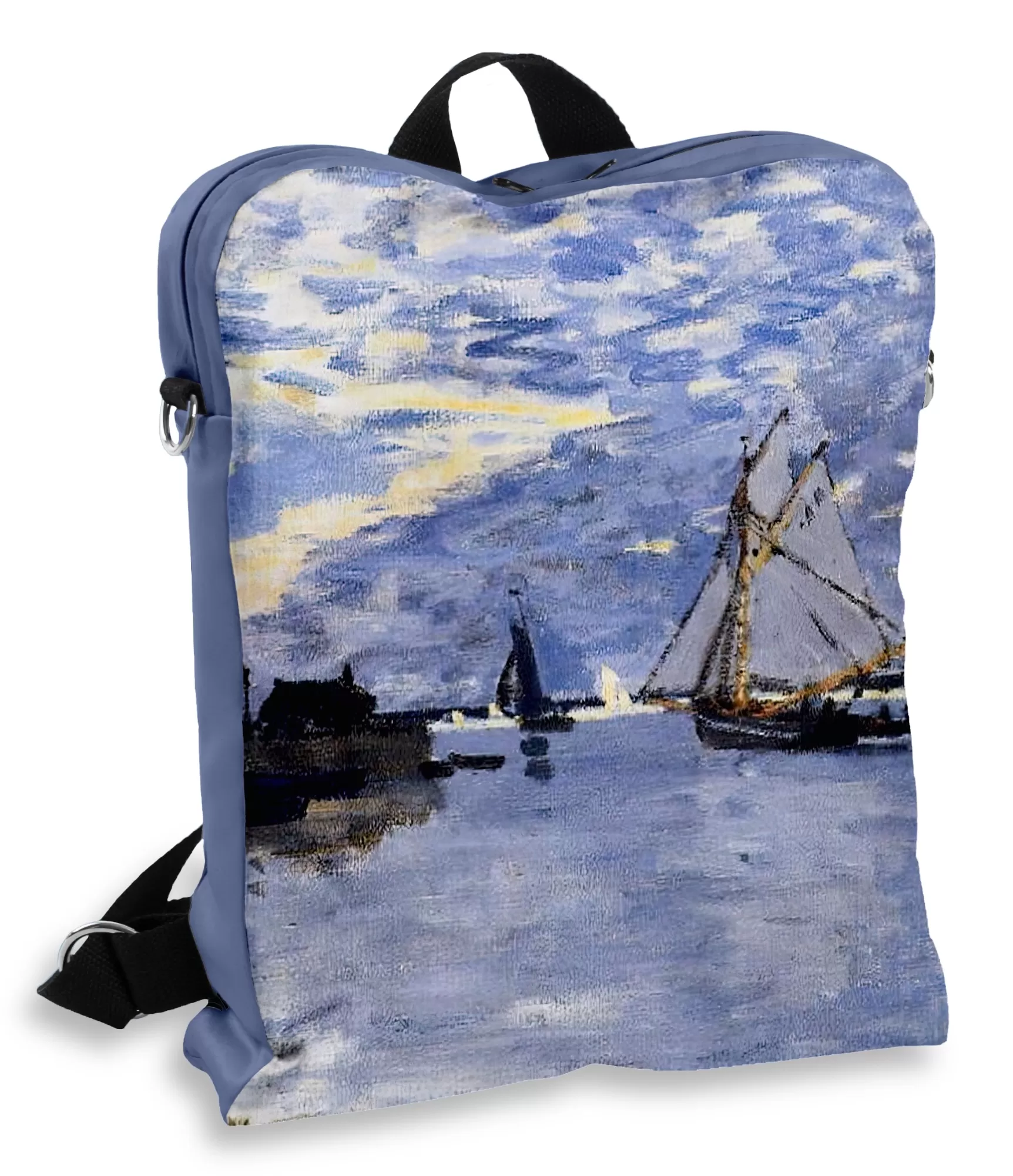Sieviešu mugursoma – kā vējš buru tīklos, iemūžināts Kloda Monē gleznā „Buru laivas“. Katrs tās centimetrs ir piepildīts ar vieglumu un cerību, kā jūras velna dziesma, kas pavada no agra rīta līdz saulrietam. Monē akvareļu triepieni kļuvuši par stilīgu audumu, kas aicina ne tikai ceļot, bet arī sapņot. Mugursomas dizains atgādina atvērtu horizontu – tas, kurš vienmēr ir mazliet tālāk, bet tik vilinošs. Šhell išjauktās krāsas – debess smiltis, zaļganpelēkie ūdens toņi un buru kuģu aprises – ļauj iemīlēties katrā detaļā, jo mugursoma ir ne tikai funkcionāls priekšmets, bet arī gleznains mākslas darbs.