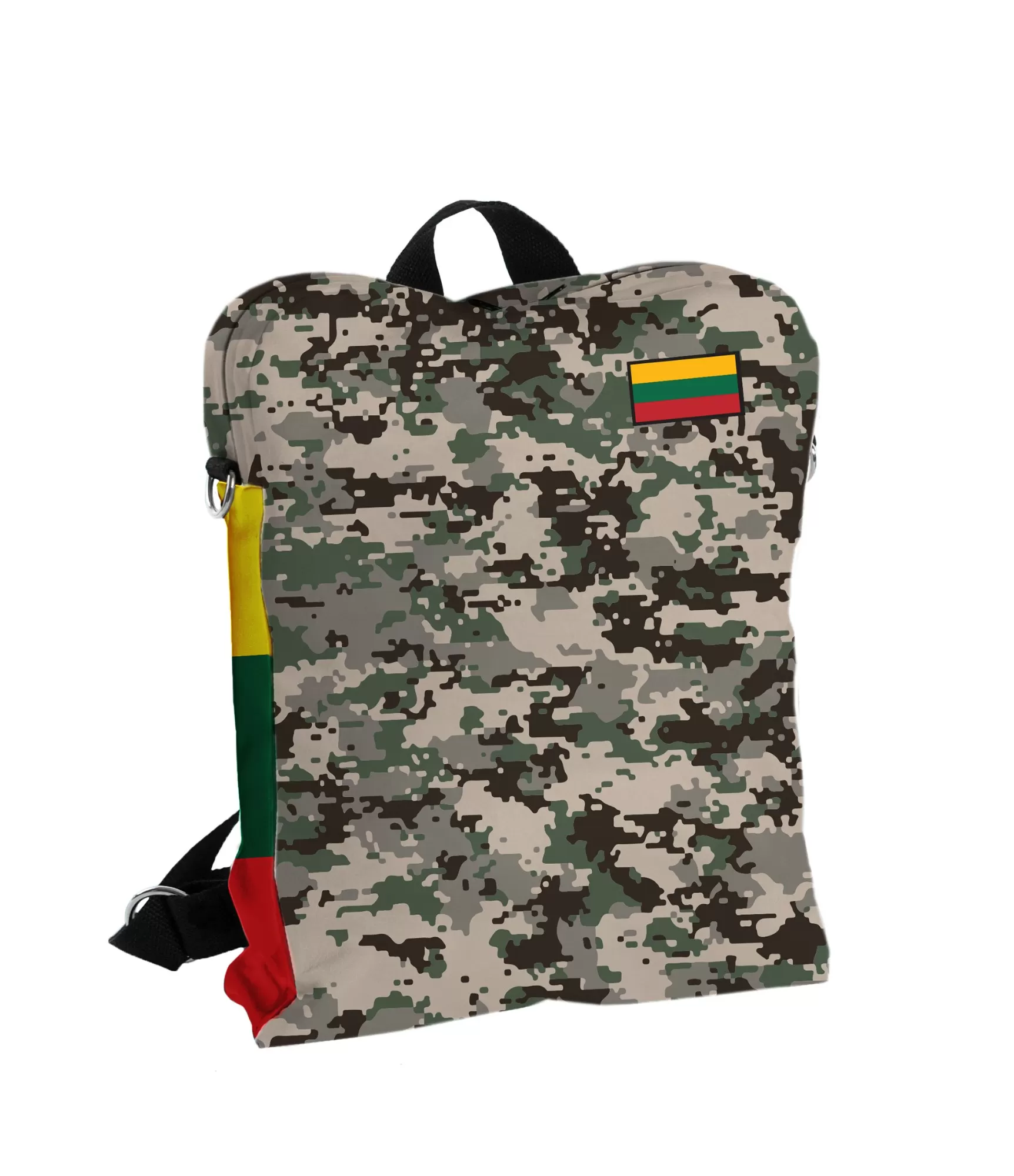 Ši mugursoma runā bez vārdiem – viņas stils izsaka visu. Pikseļu kameras ritenis, kas paplašināts kā digitālā maskēšanās, pauž spēku un apņēmību. Uzkrītošais Lietuvas trīskrāsu karogs augšējā stūrī papildina dizainu ar skaidru patriotisku vēstījumu, taču smalki – bez šfermas, bez trokšņaš. Šis – kluss, bet spēcīgs identitātes paziņojums. Karoga slīpais leņķis ir kā mājiens uz kustību, uz aktīvu dzīvi, uz gatavību ceļot, maršēt vai vienkārši izcelties pūlī.