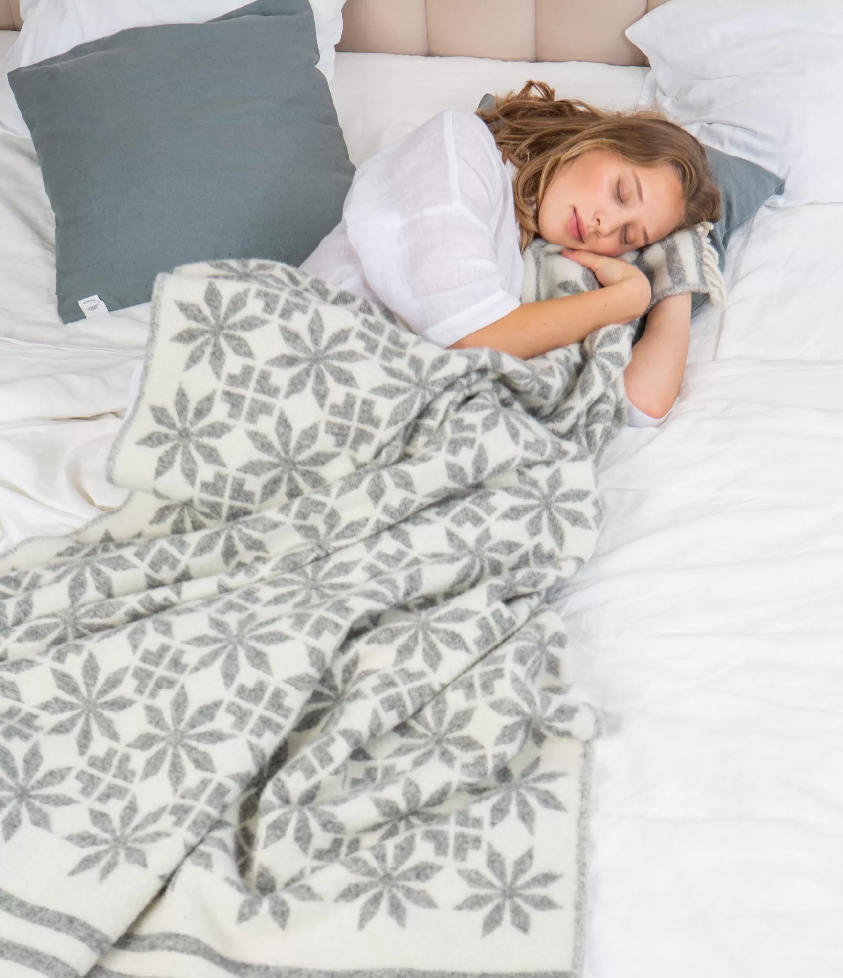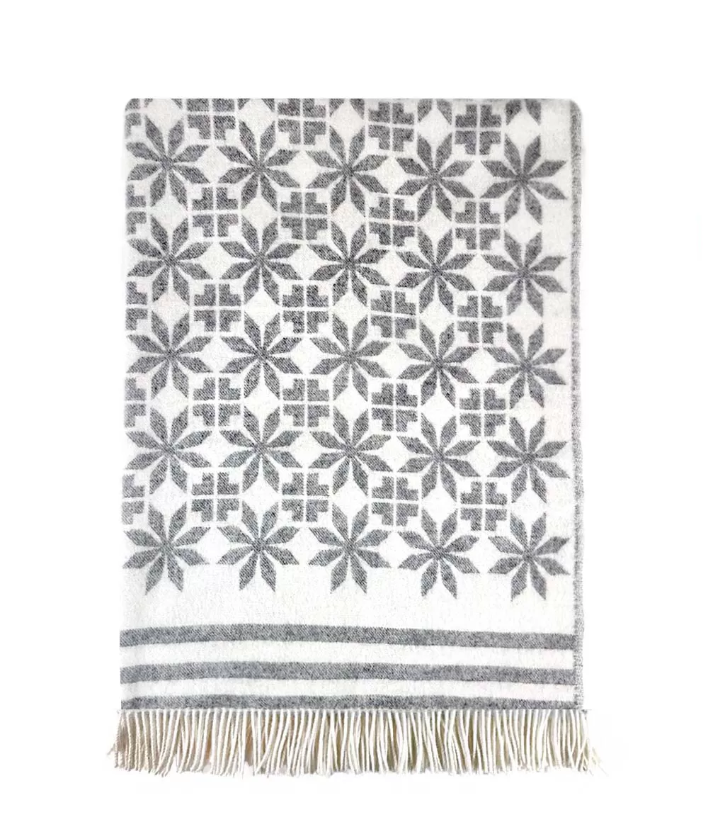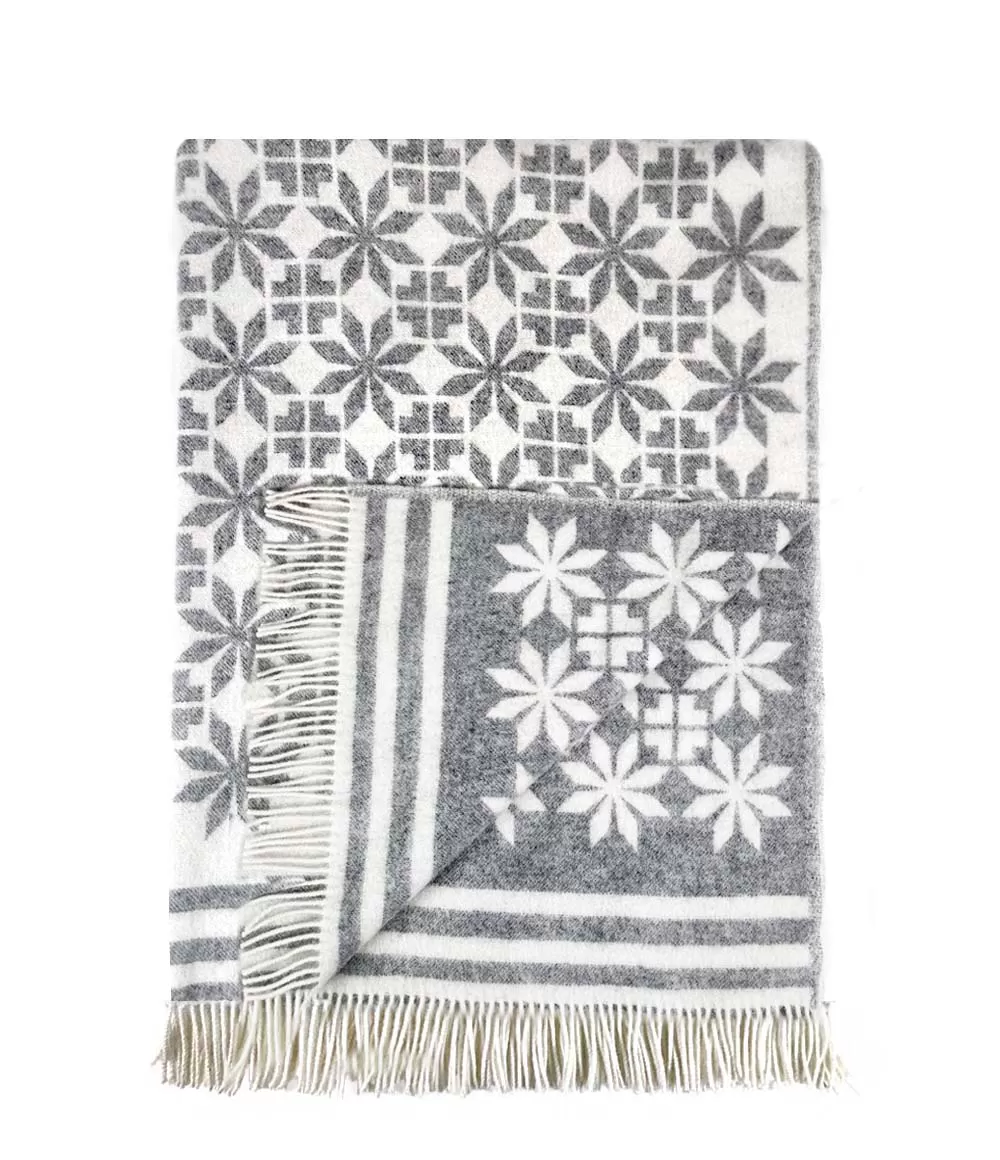 Raksts – šī izstrādājuma galvenā iezīme. Tā ir tradicionālā Baltijas un Ziemeļu reģiona tekstila ģeometrija, kas atgādina seno “zvaigžņu ziedu” – motīvu, kas simbolizē gaismu, mājīgumu un mājas aizsardzību. Mūsdienīgi interpretēts raksts piešķir izstrādājumam struktūru un saglabā estētisko vienotību. Žakarda aušanas tehnoloģija nodrošina, ka pleds ir divpusējs: vienā pusē motīvi ir izteiktāki un tumšāki, otrā – gaišāki. Tas ļauj izvēlēties, kura puse labāk saskan ar interjeru vai sezonas noskaņu.