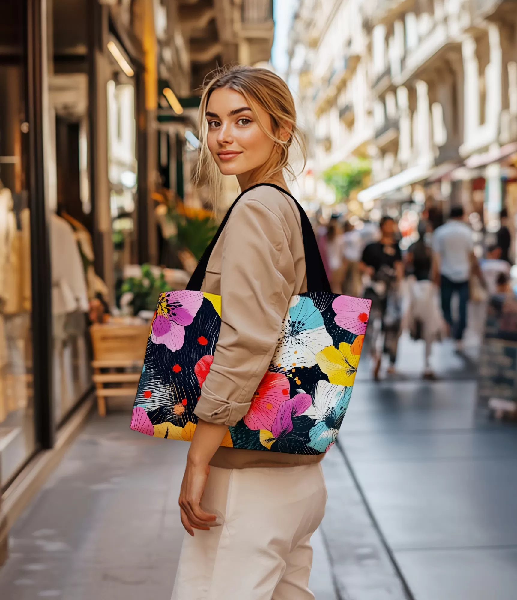 Šī košā soma ar ziedu motīviem ir ideāls aksesuārs gan vasarai, gan ziemai. Ziedu raksta krāsu harmonija uz melna fona piešķir mūsdienīgumu un izsmalcinātību. Vieglā un ietilpīgā soma būs lieliski piemērota ne tikai iepirkšanās vajadzībām, bet arī brīvā laika izbraucieniem vai kā stilīgs akcents ikdienas apģērbā. Tas ir universāls risinājums, kas kļūs par jūsu garderobes iemīļotu elementu.