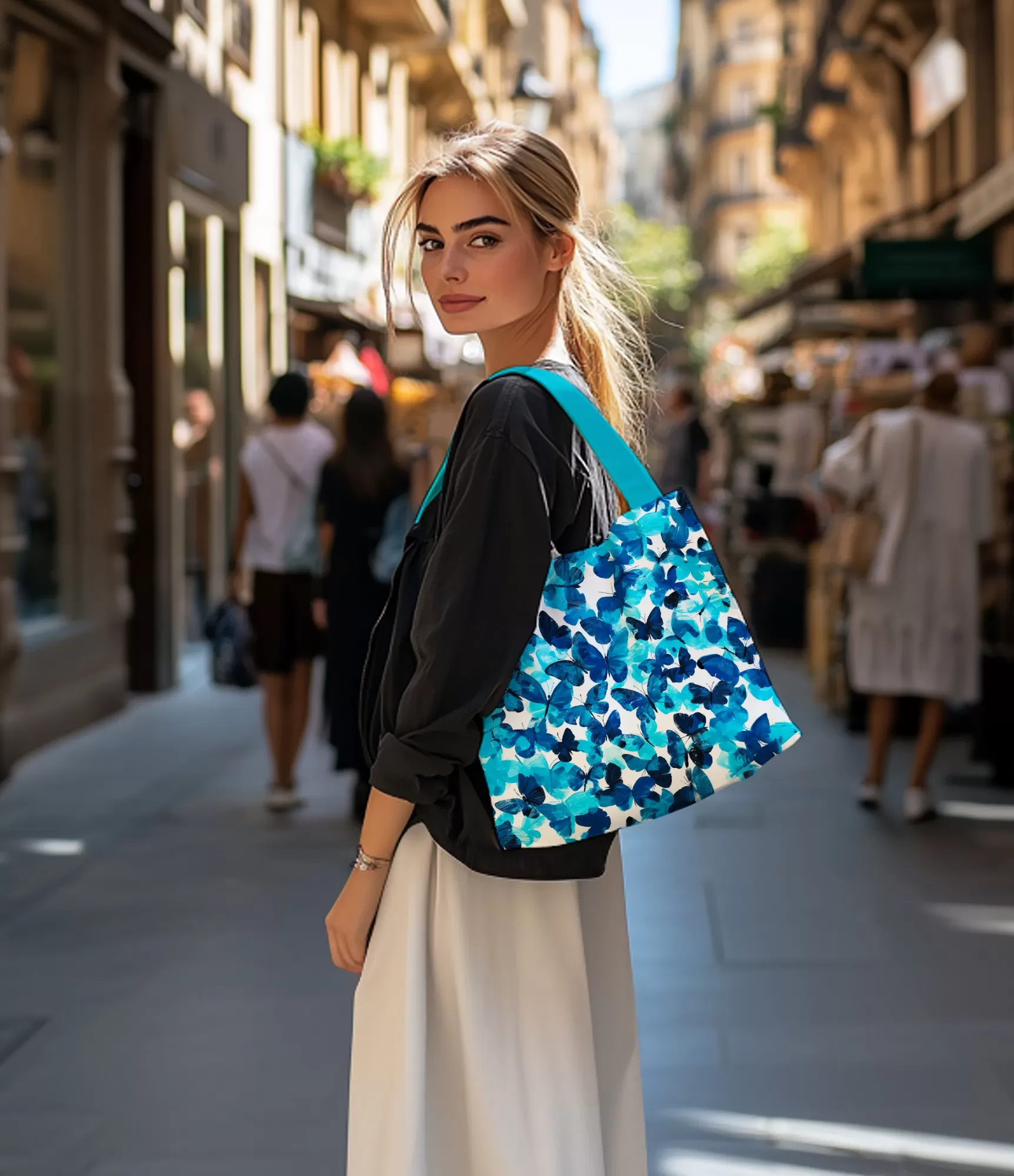 Šī stilīgā soma ar tauriņa dizainu ir elegances un modernitātes apvienojums. Smalkie zilie tauriņi uz baltā fona piešķir somai viegluma un izsmalcinātības sajūtu. Krāsainās iepirkumu somas lieliski sader ar dažādiem apģērbiem, un daudzpusīgais raksts ir piemērots gan vasaras, gan ziemas sezonām. Tā ir izteikta izvēle, kas papildinās tavu ikdienas izskatu un kļūs ne tikai par stilīgu, bet arī ļoti praktisku aksesuāru.