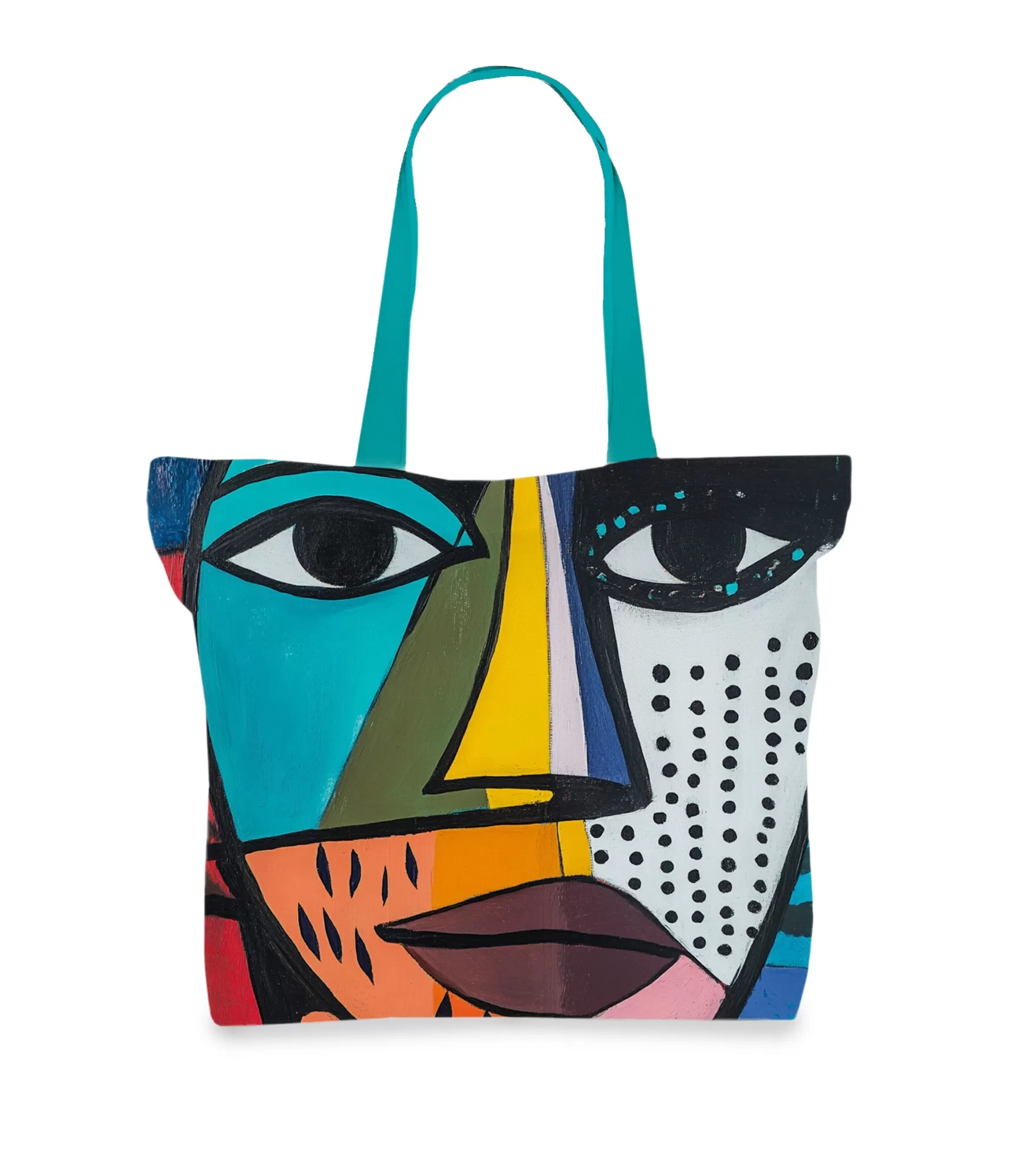 Šī sieviešu soma ar unikālu kubisma stila sejas dizainu ir izcils stila un funkcionalitātes apvienojums. Košās krāsas, piemēram, tirkīza, melna, balta, oranža, rozā, dzeltena un olīvu zaļa, veido ekspresīvu ģeometrisku kompozīciju. Detalizētie akcenti, tostarp punkti un līniju raksti, piešķir dizainam dinamiskumu un modernumu. Šis stilīgais aksesuārs ar izturīgām tirkīza krāsas rokturiem ir ne tikai praktisks, bet arī lieliski piemērots ikdienai vai kā akcents īpašos gadījumos.