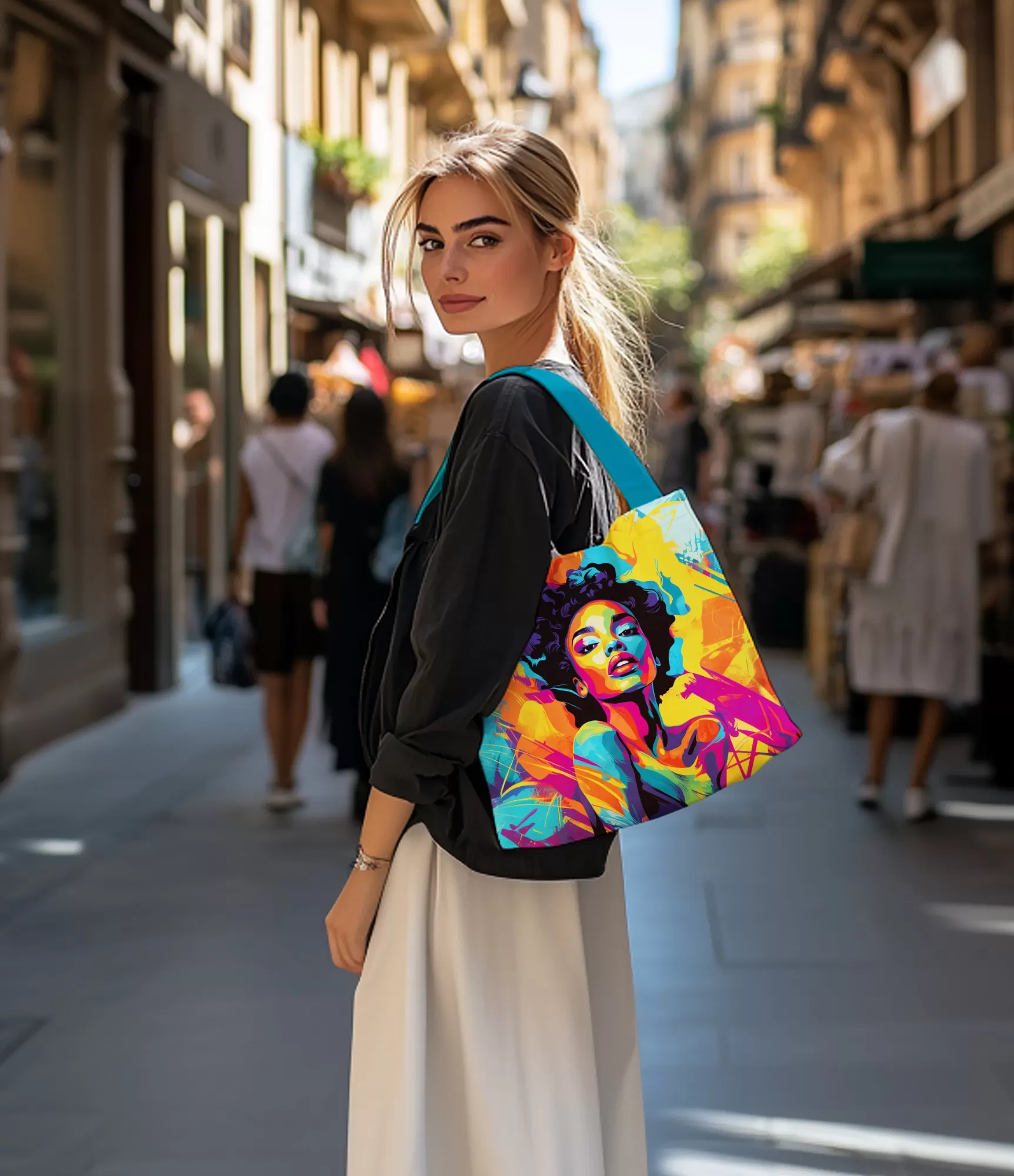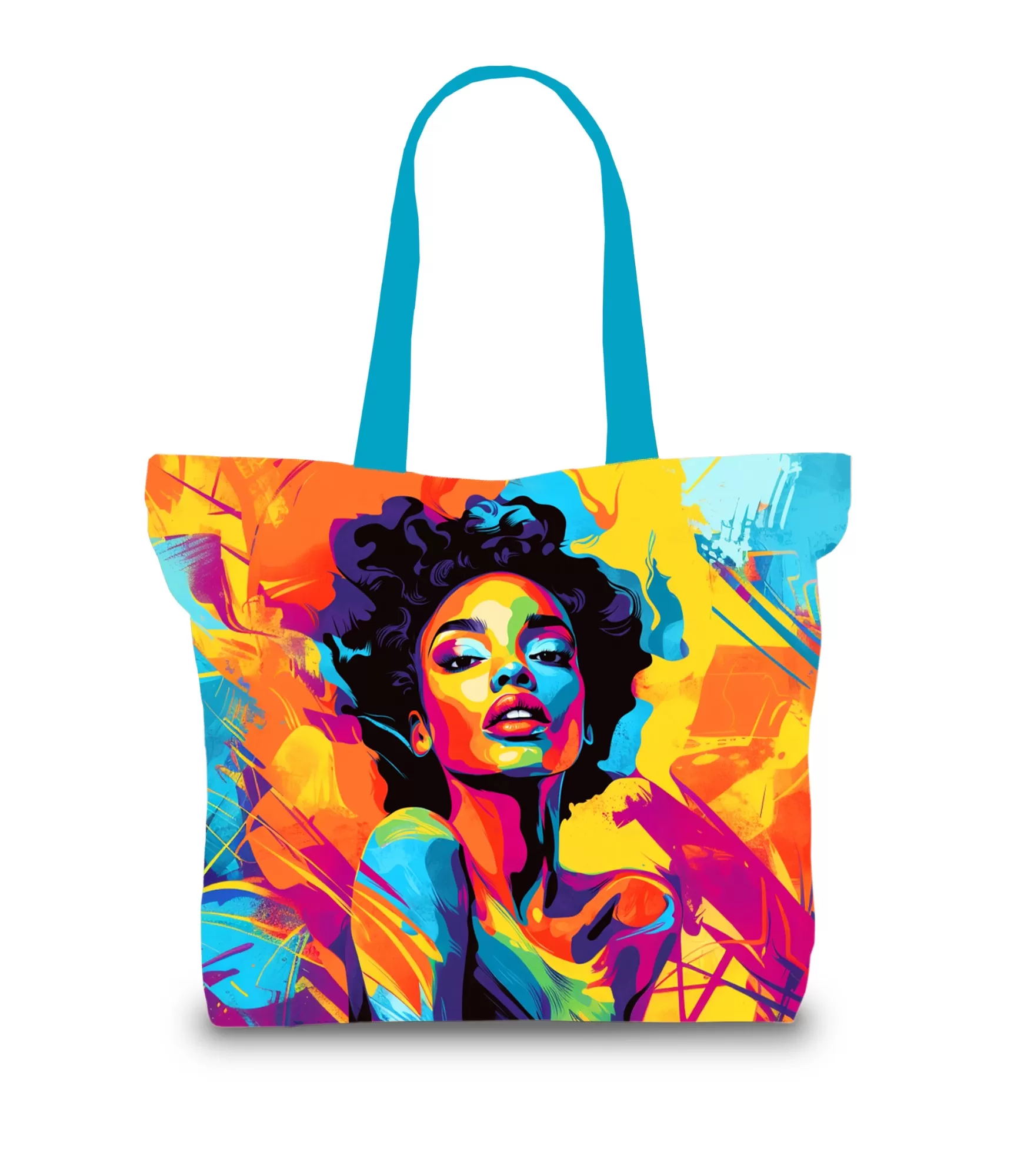 Šī sieviešu soma ar spilgtu, abstraktu sievietes portretu ir mākslas un funkcionalitātes apvienojums, kas lieliski piemērots ikdienas vajadzībām. Dizainu rotā dinamiskas oranžas, dzeltenas, zilas, purpursarkanas un rozā krāsas, kas veido iespaidīgu gleznojuma otas triepienu un grafisko elementu harmoniju. Spilgtās krāsas izceļas uz neitrāla fona, piešķirot aksesuāram izsmalcinātību un daudzpusību. Izturīgās tirkīza krāsas siksnas nodrošina ērtu nēsāšanu, savukārt ietilpīgā konstrukcija ir lieliski piemērota gan iepirkumiem, gan ikdienas lietošanai vai brīvā laika ceļojumiem.