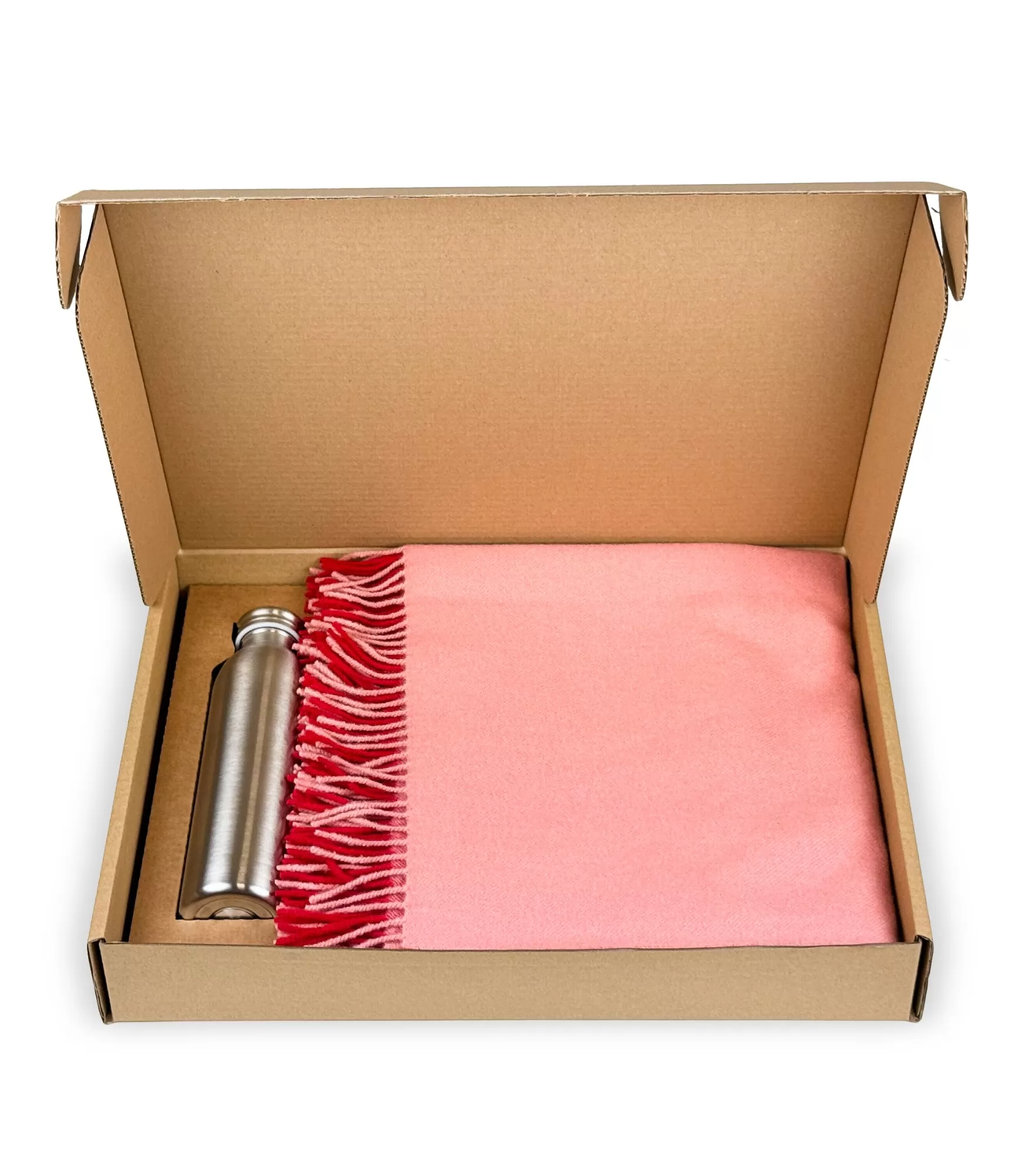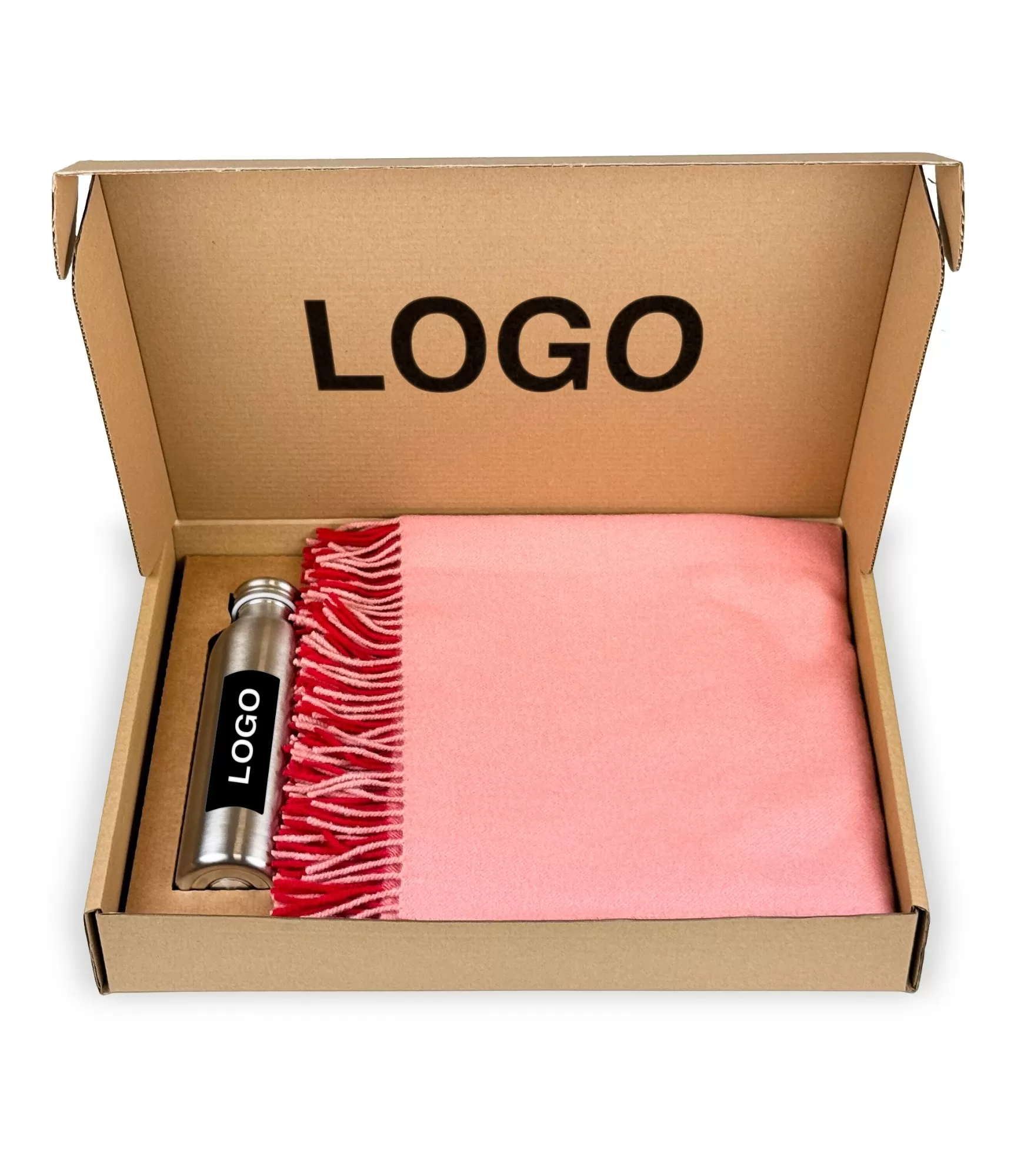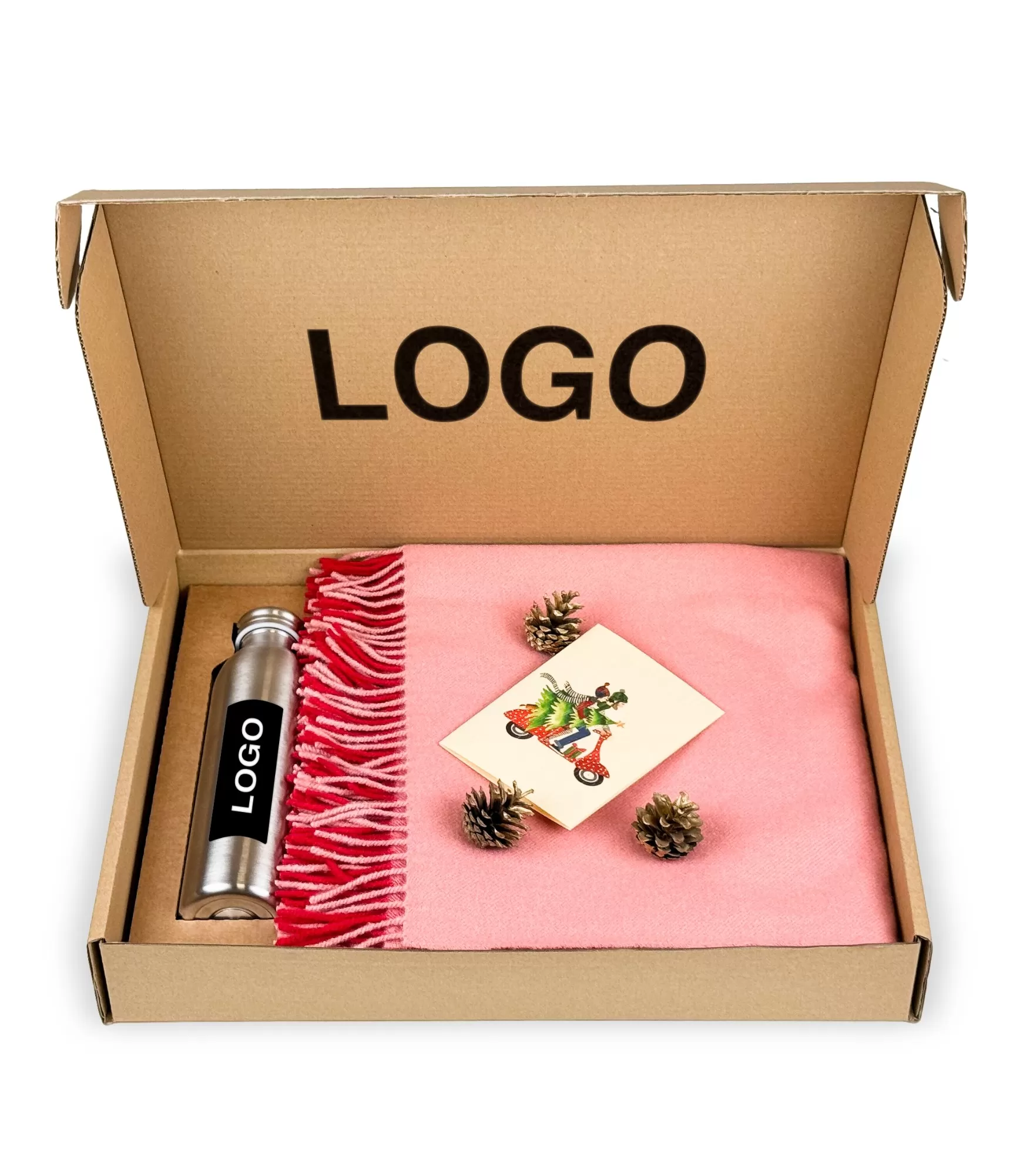 Dāvanu komplekti uzņēmumiem ar logotipu – Merino vilnas segas un dzērāji.