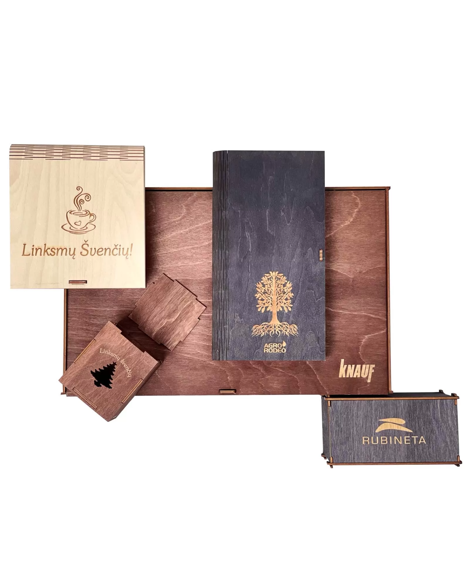 Par papildu samaksu atkarībā no dizaina, izmēra un daudzuma katru kastīti var izgriezt vai iegravēt ar nosaukumu, nosaukumu vai uzņēmuma logotipu.