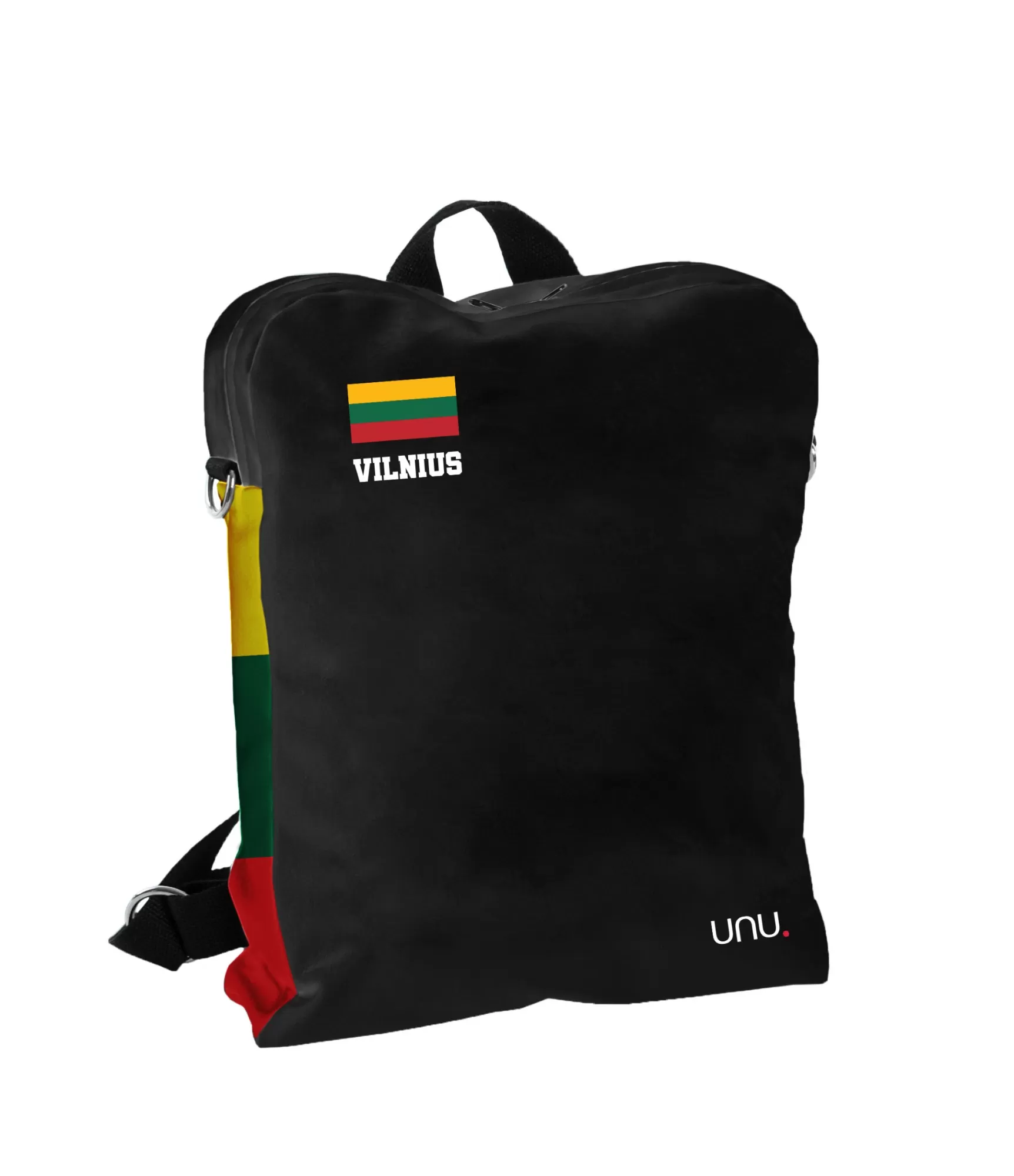 Ir pilsētas, kas dzīvo ne tikai ielās, bet arī pagalmos. Viļņa – tieši tā. Un šī mugursoma runā bez vārdiem, bet ar skaidru vēstījumu: „Aš es esmu iš šeit.“ Vai arī: „Man ir svarīgi, kas ir īsts.“ Melnais fons nav bez iemesla – viņš išryškina, kam ir nozīme. Lietuvas trīskrāsains ir elegants, kad tas stiepjas pāri debesīm, smalks, bet tas nepaliks nepamanīts. Un vārds „VILNIUS”, kas rakstīts ar baltu grafiti, kļūst par akcentu – bet ne banāli, bet cieņpilni. Tā nav tikai ģeogrāfiska norāde. Tā ir sava veida lepnuma zīme, atgādinājums par pilsētas identitāti.