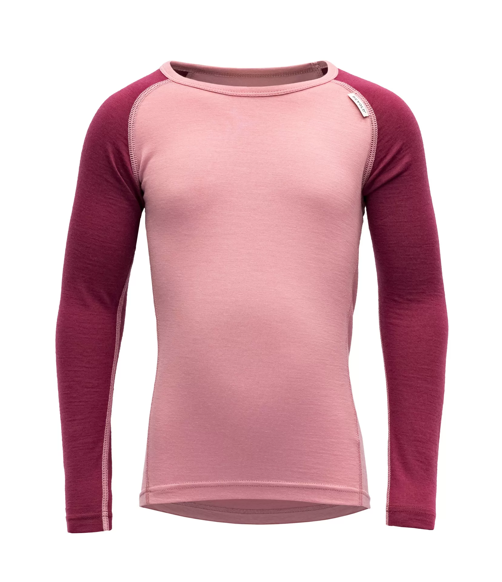 Ši DEVOLD Breeze kolekcijas merino vilnas blūze bērniem ir lieliska izvēle šdienām un aktīvai brīvā laika pavadīšanai. Blūze izceļas ar savu dizainu: gaiši rozā priekšpuse un aizmugure un koši bordo piedurknes, kas rada stilīgu kontrastu.